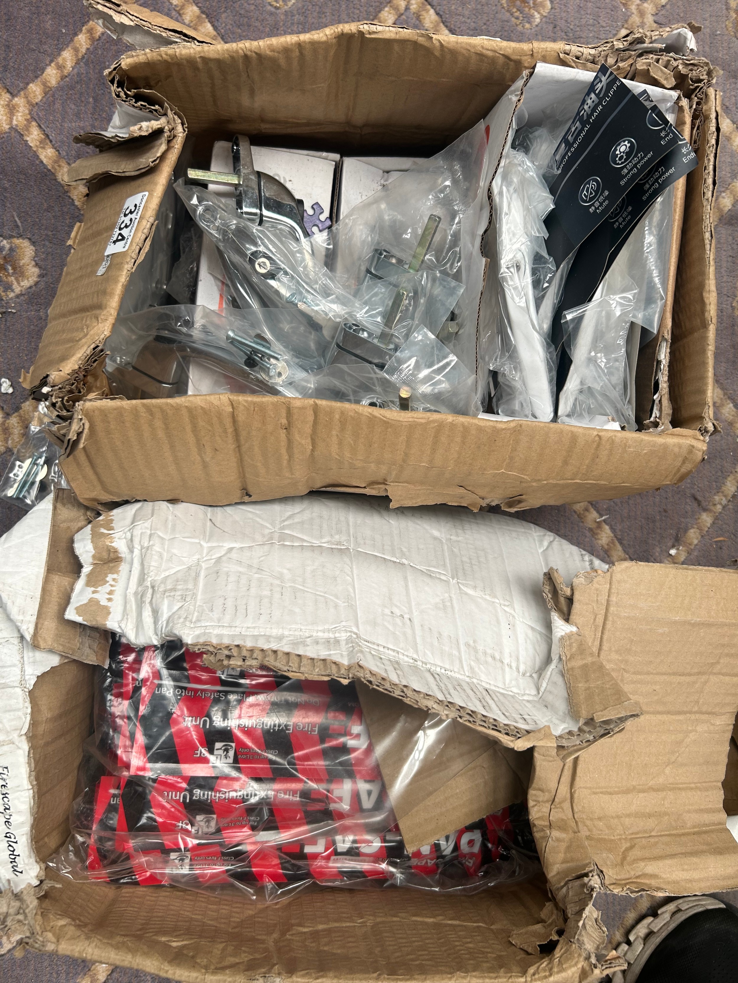 Box Of New Door Handles And Box Of Pan-Safe Fire Extinguishing Unit’s.