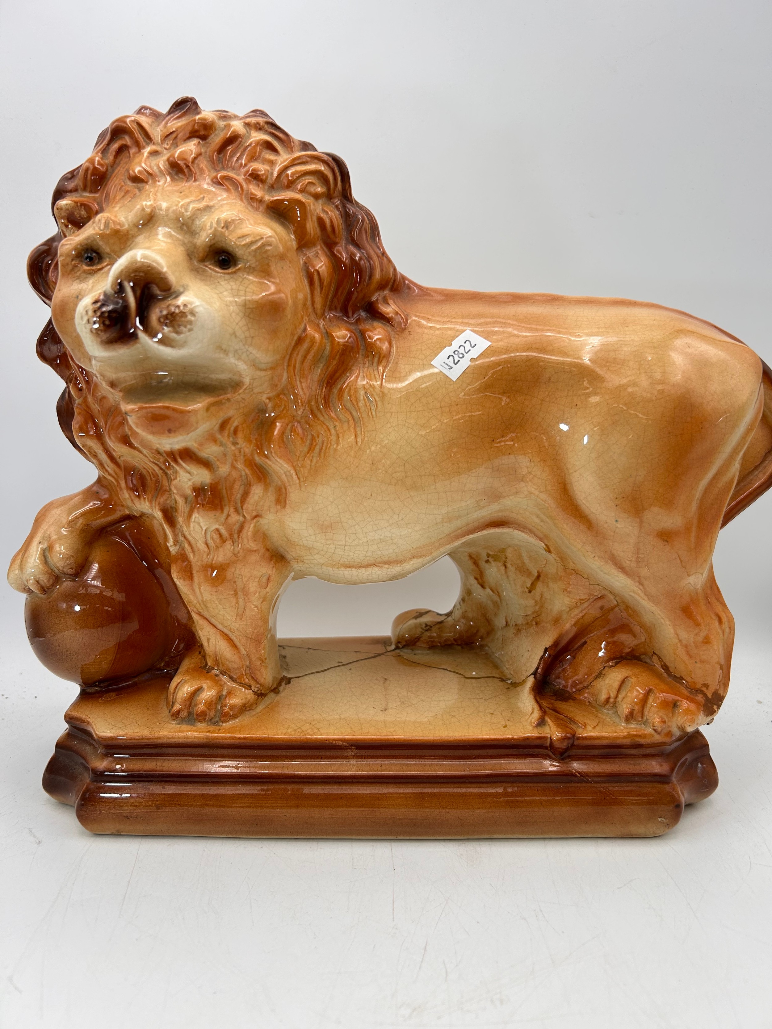 Large Staffordshire? Ceramic Lion , See Pictures For Repairs, 13"x12".