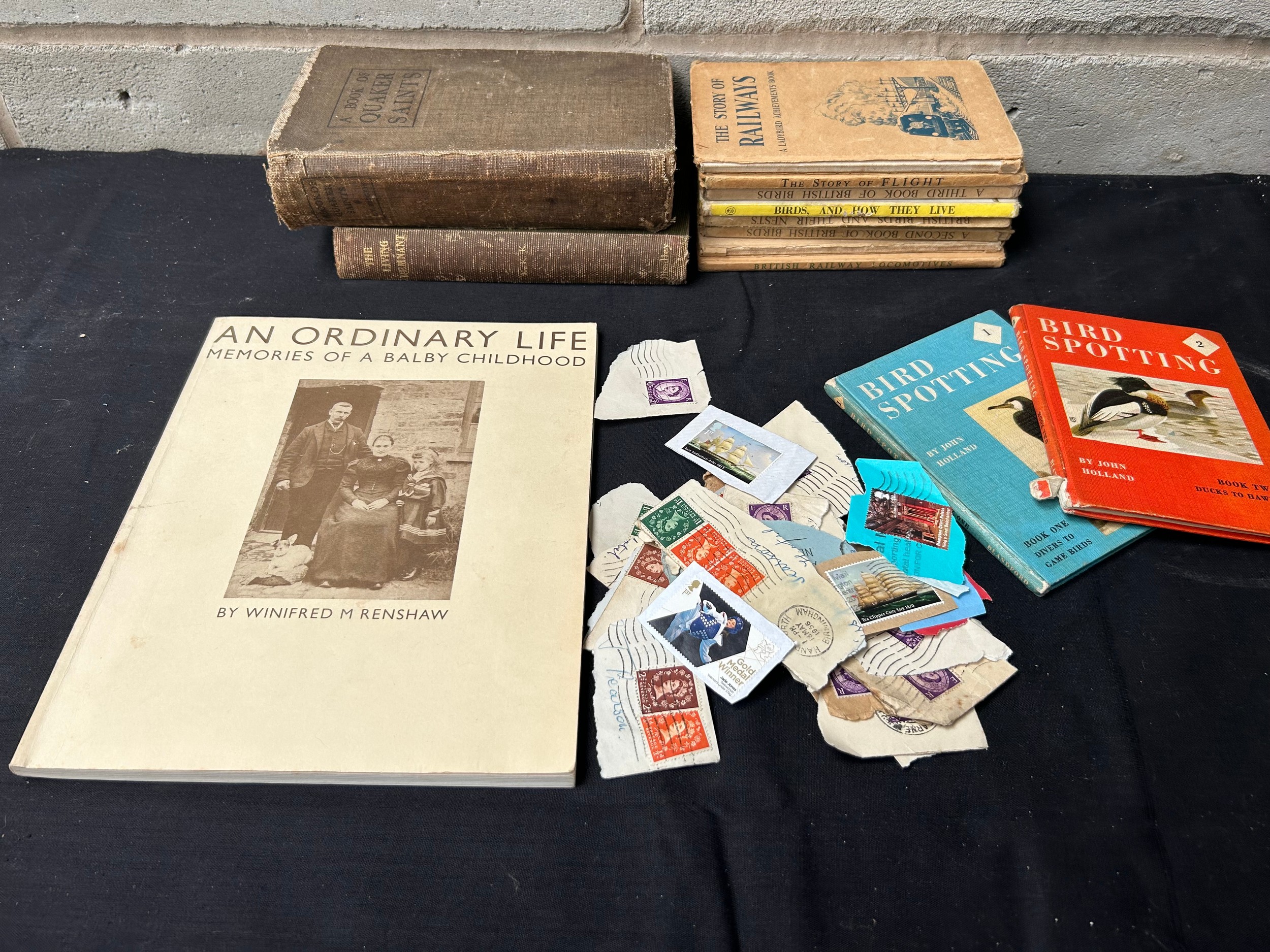 Tray Containing Vintage Books And Stamps.