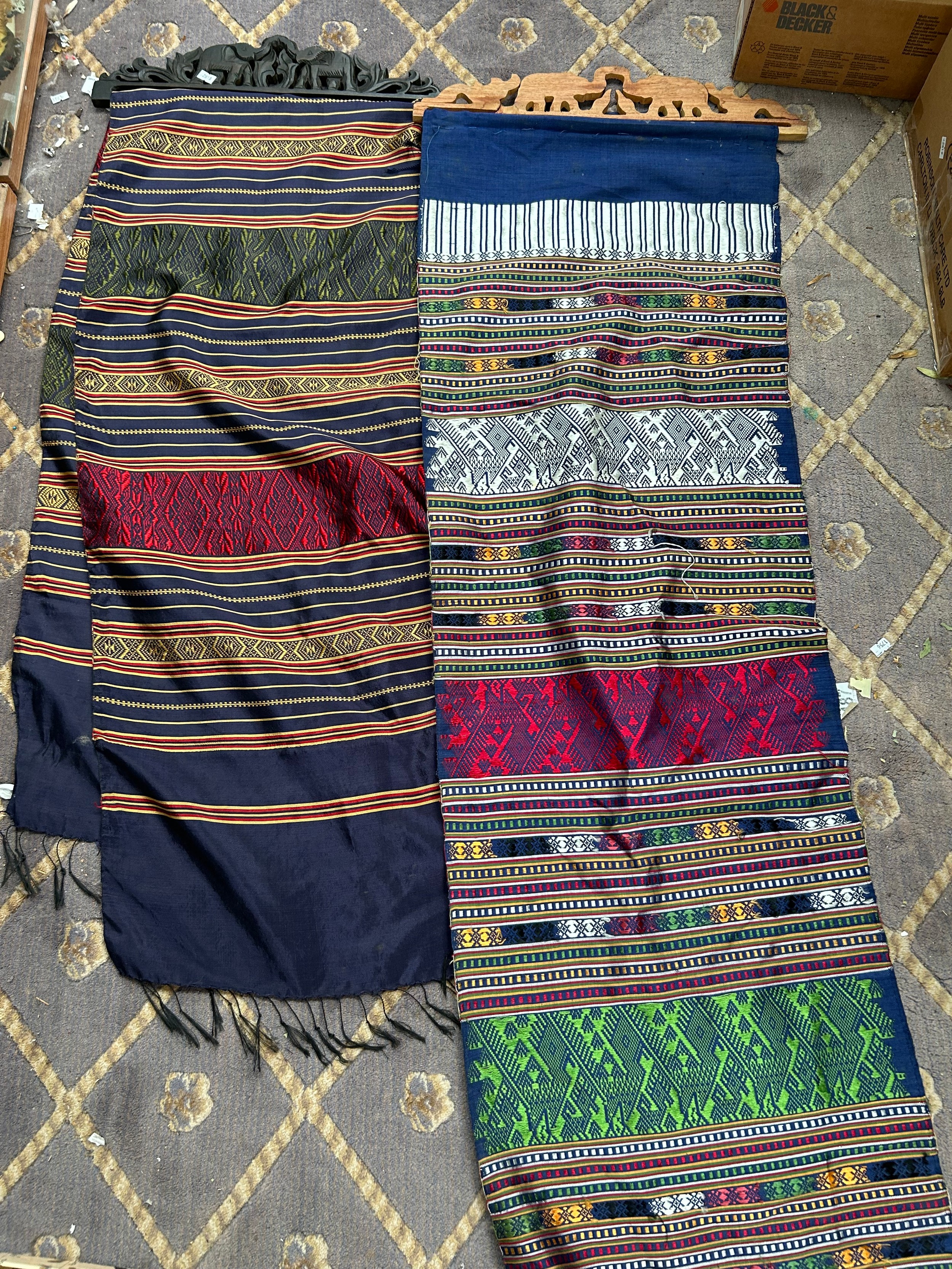 Material And Carved Wood Wall Hangings.