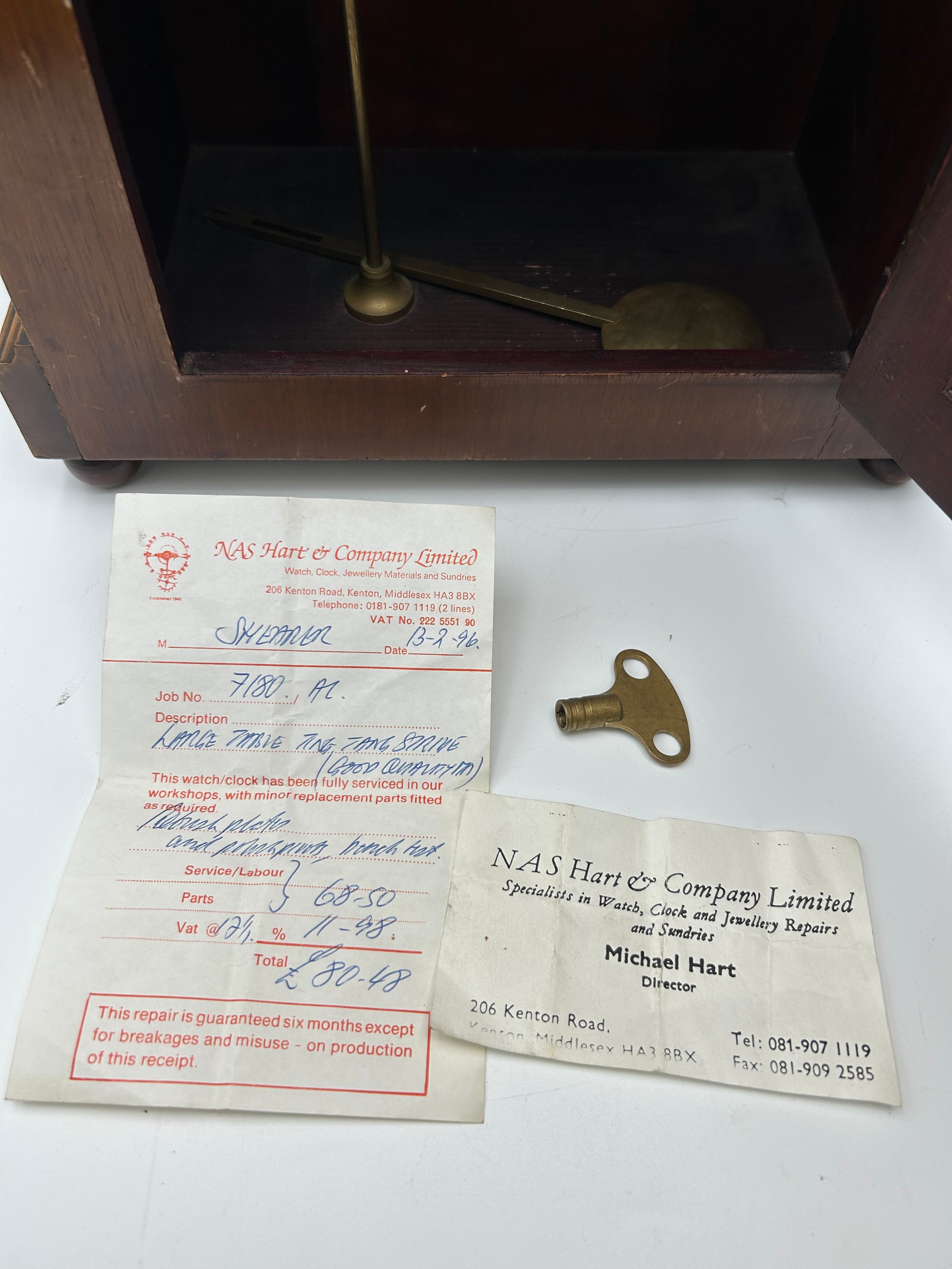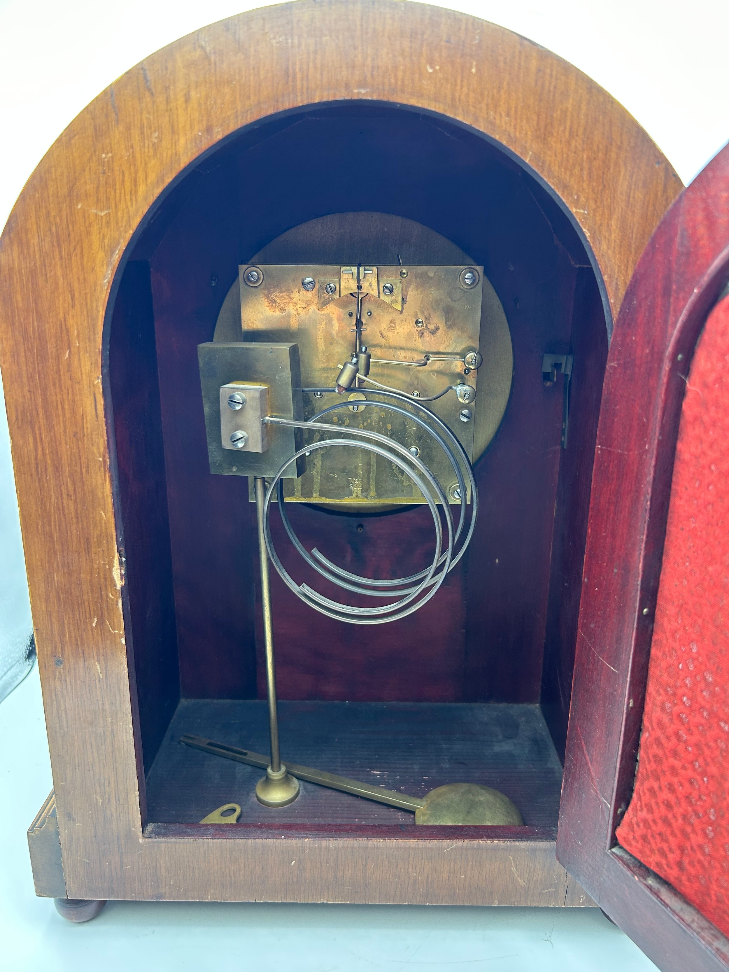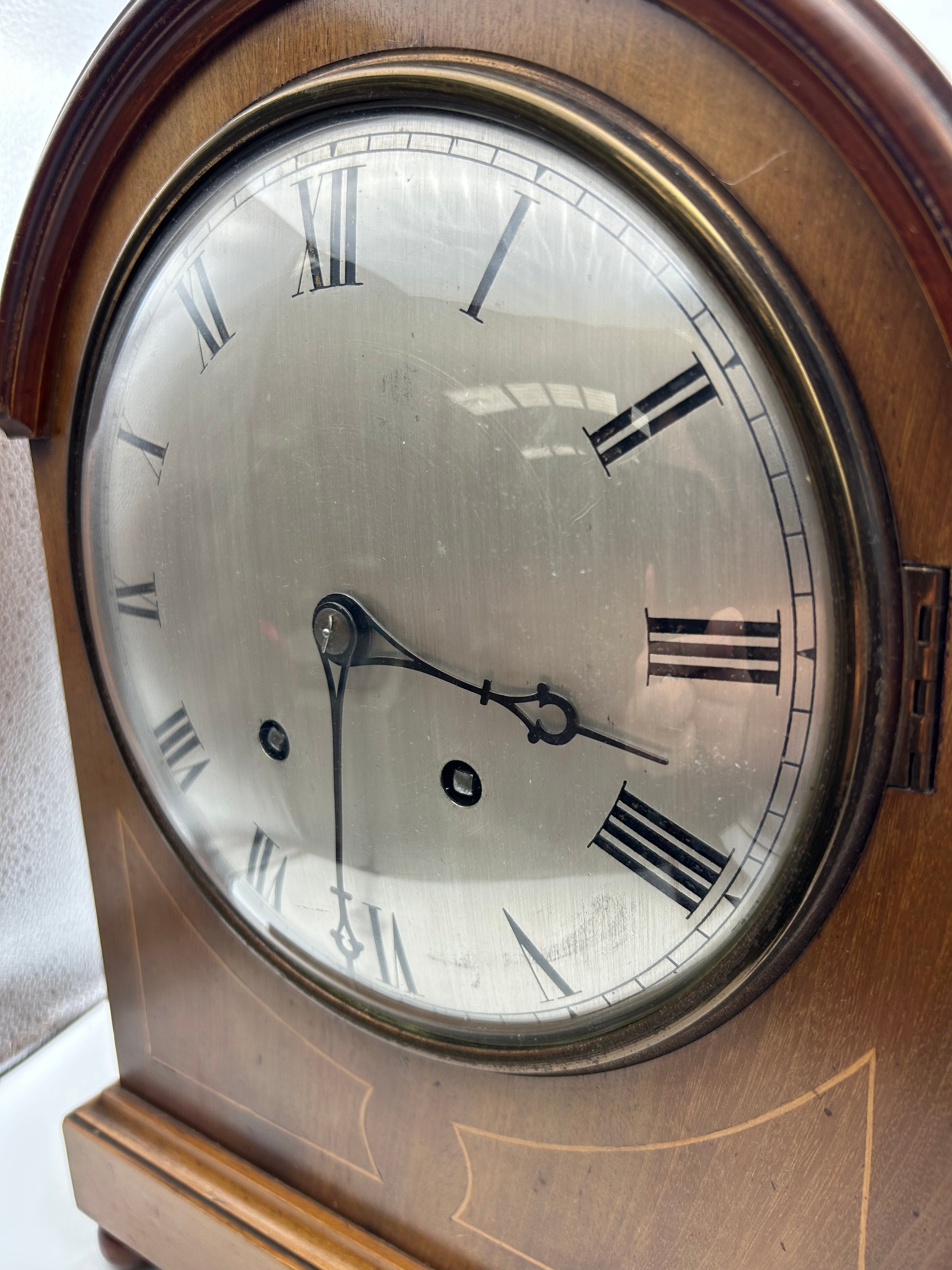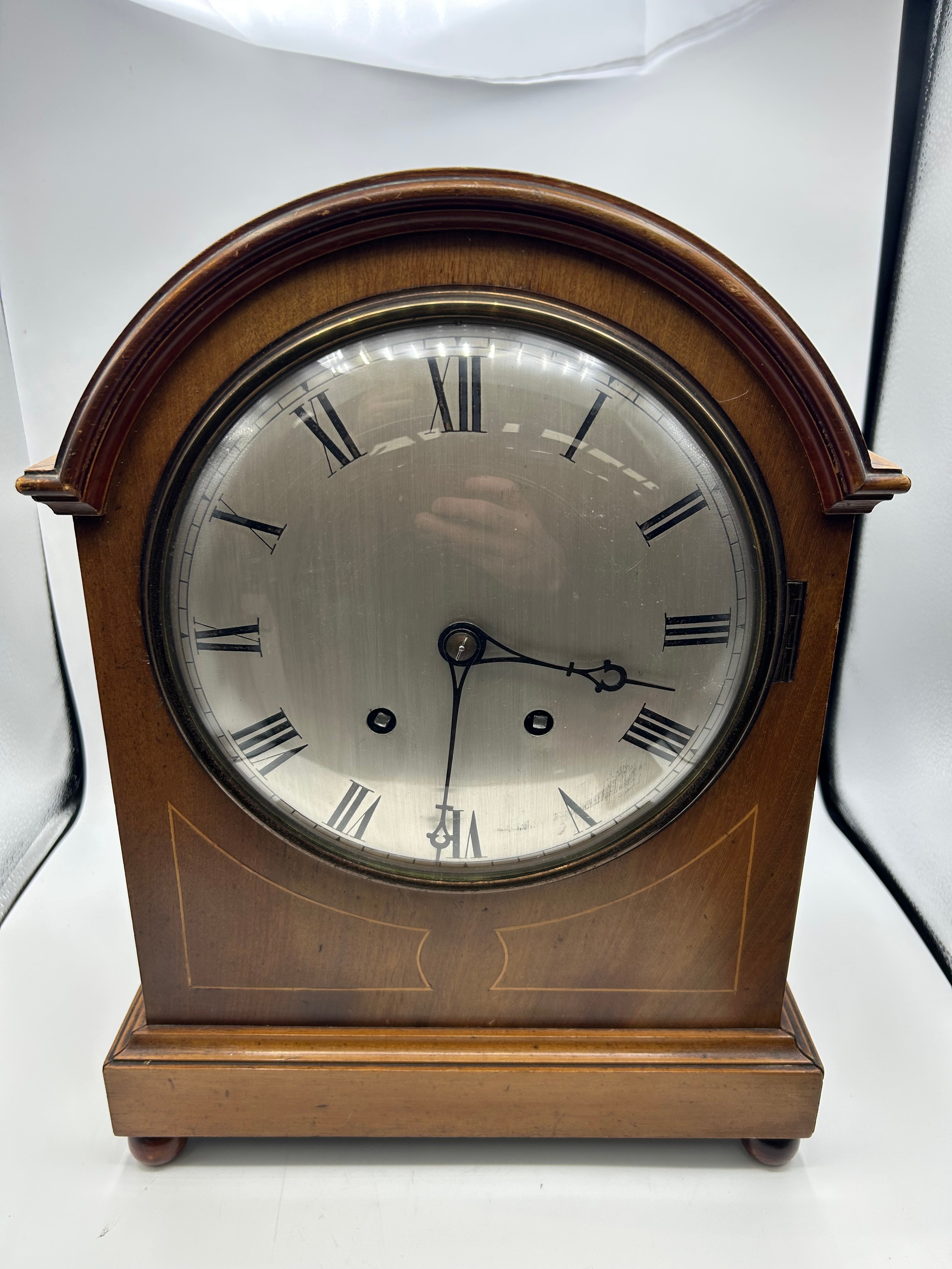 Beautiful Large Chiming Mantle Clock in Good Running Order. Oak Case With Boxwood Stringing Decoration, Metal Dial. 15" Tall, Maker’s Mark W & H, Possibly Winterhalder & Hofmeier.