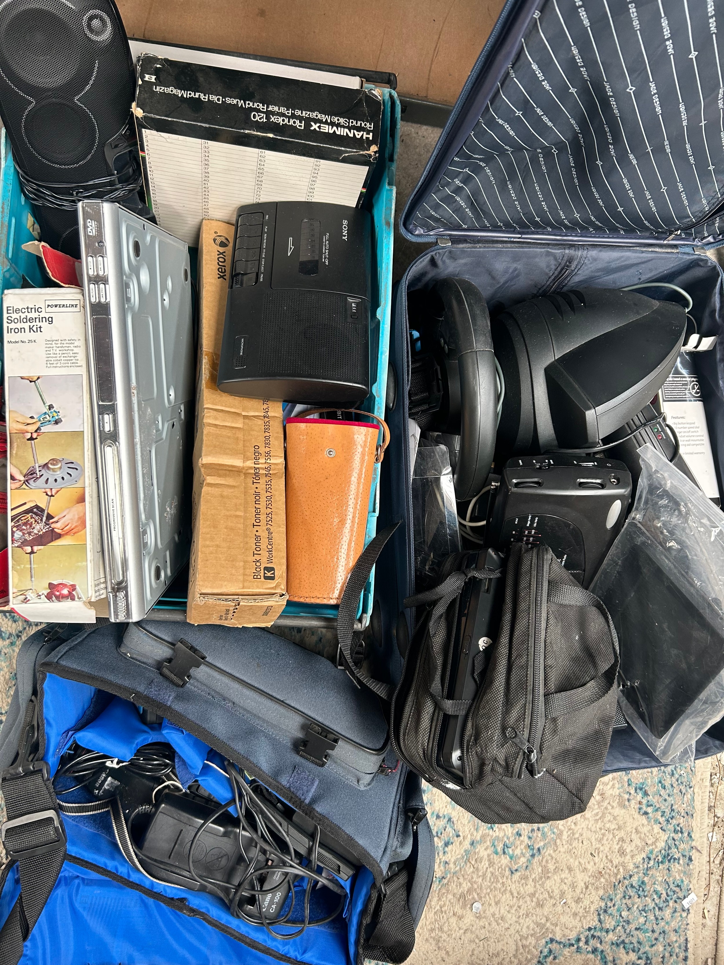 Large Box And Suitcase Containing Various Items Mostly Electrical.