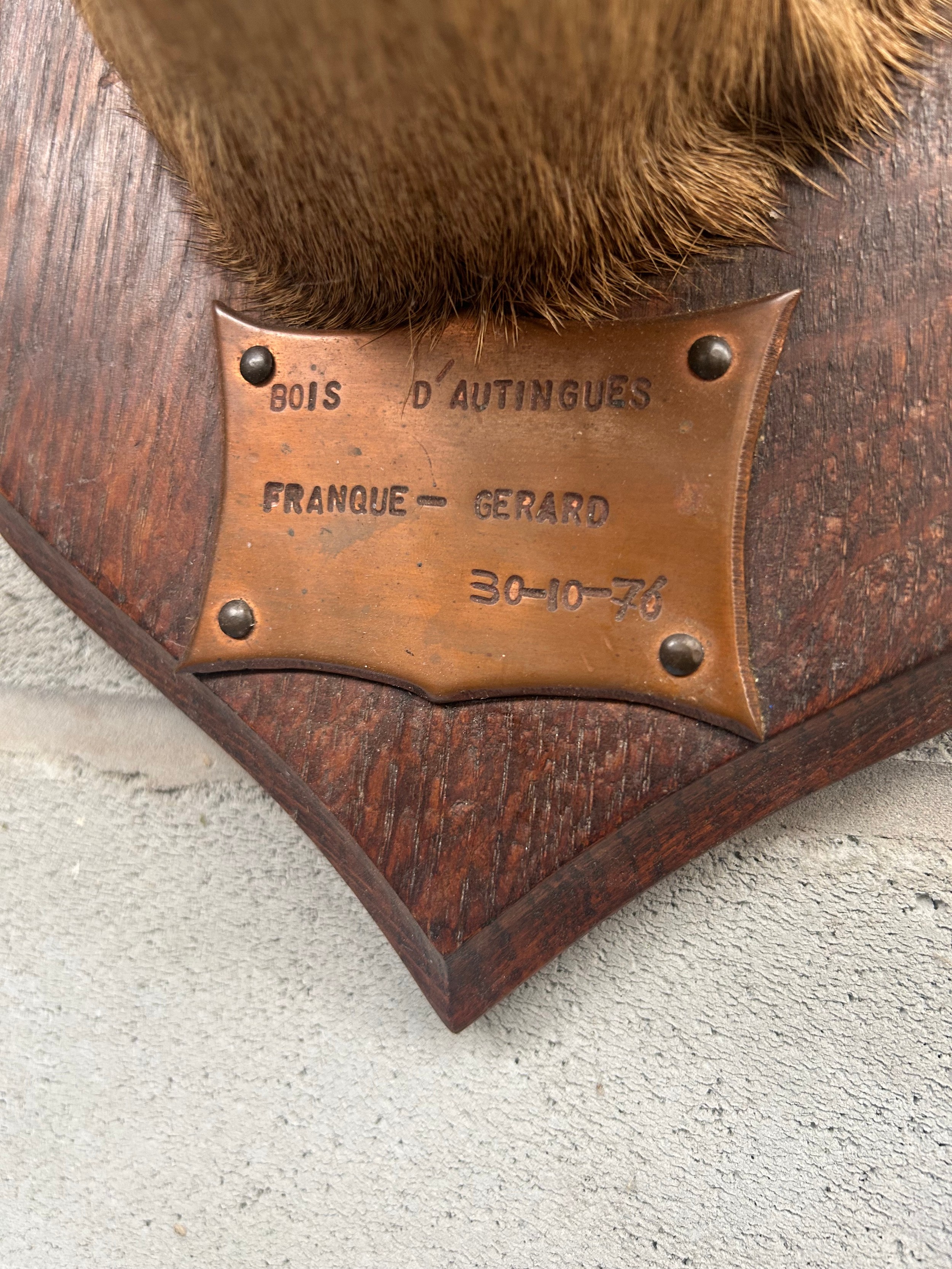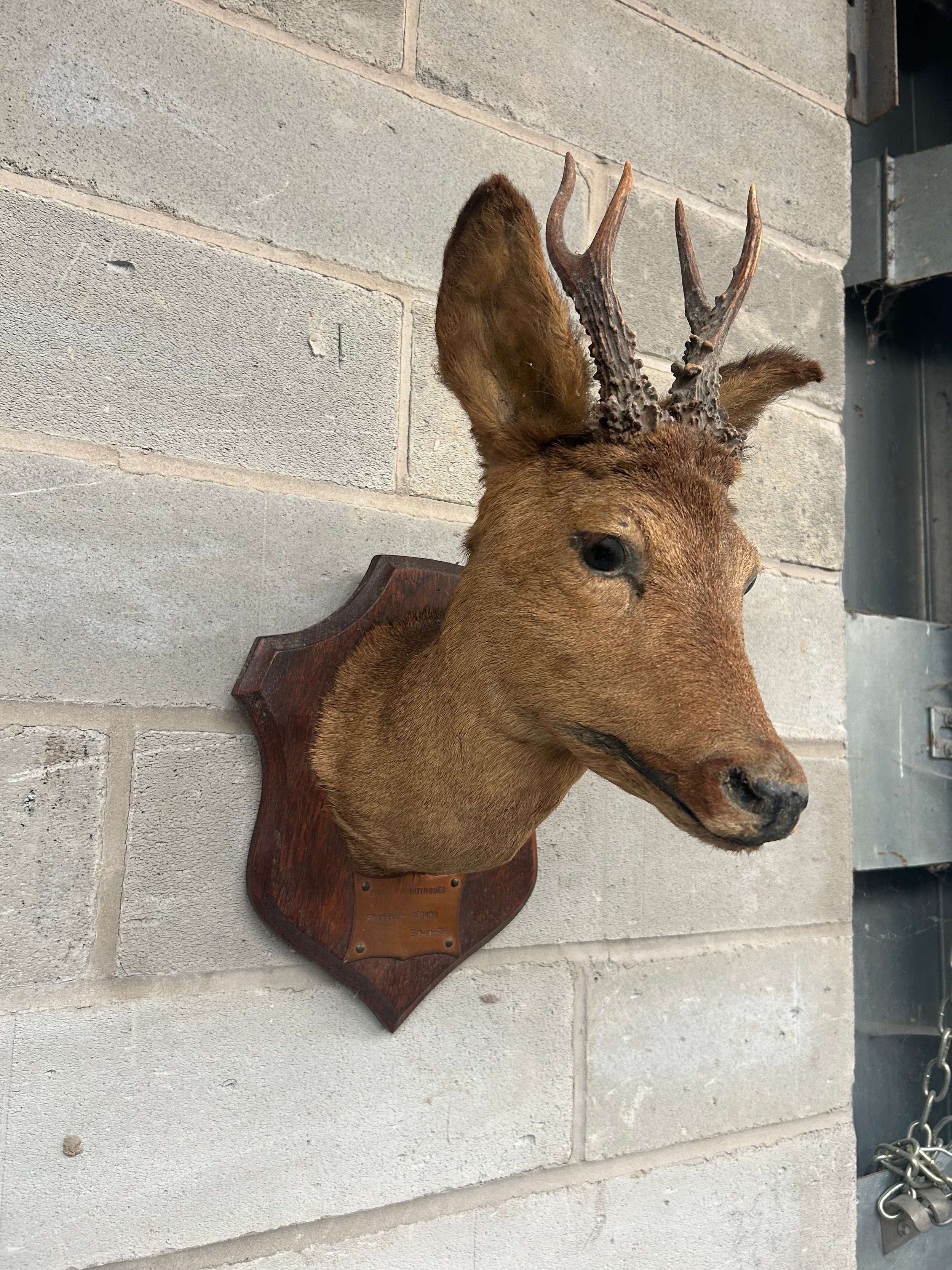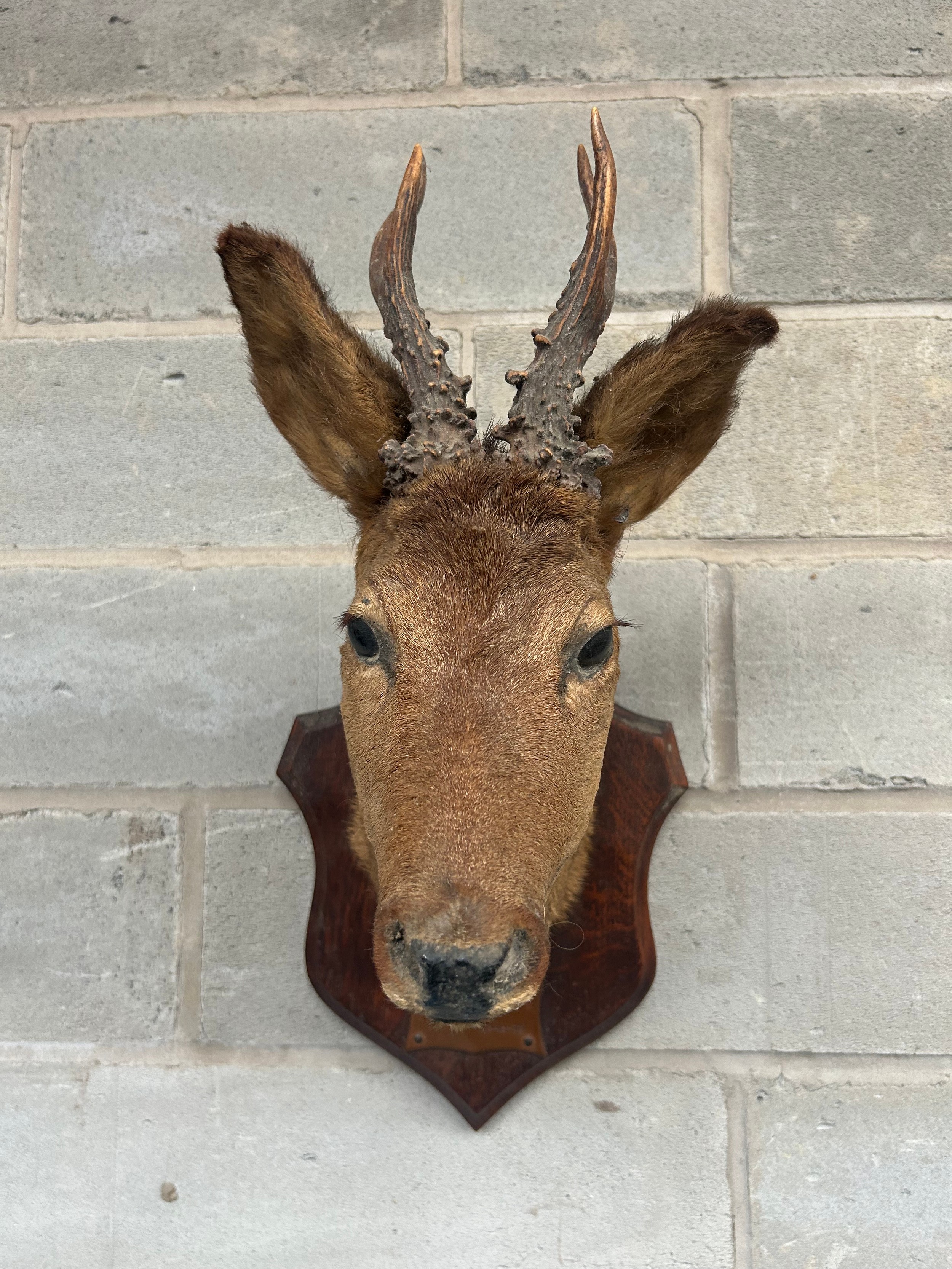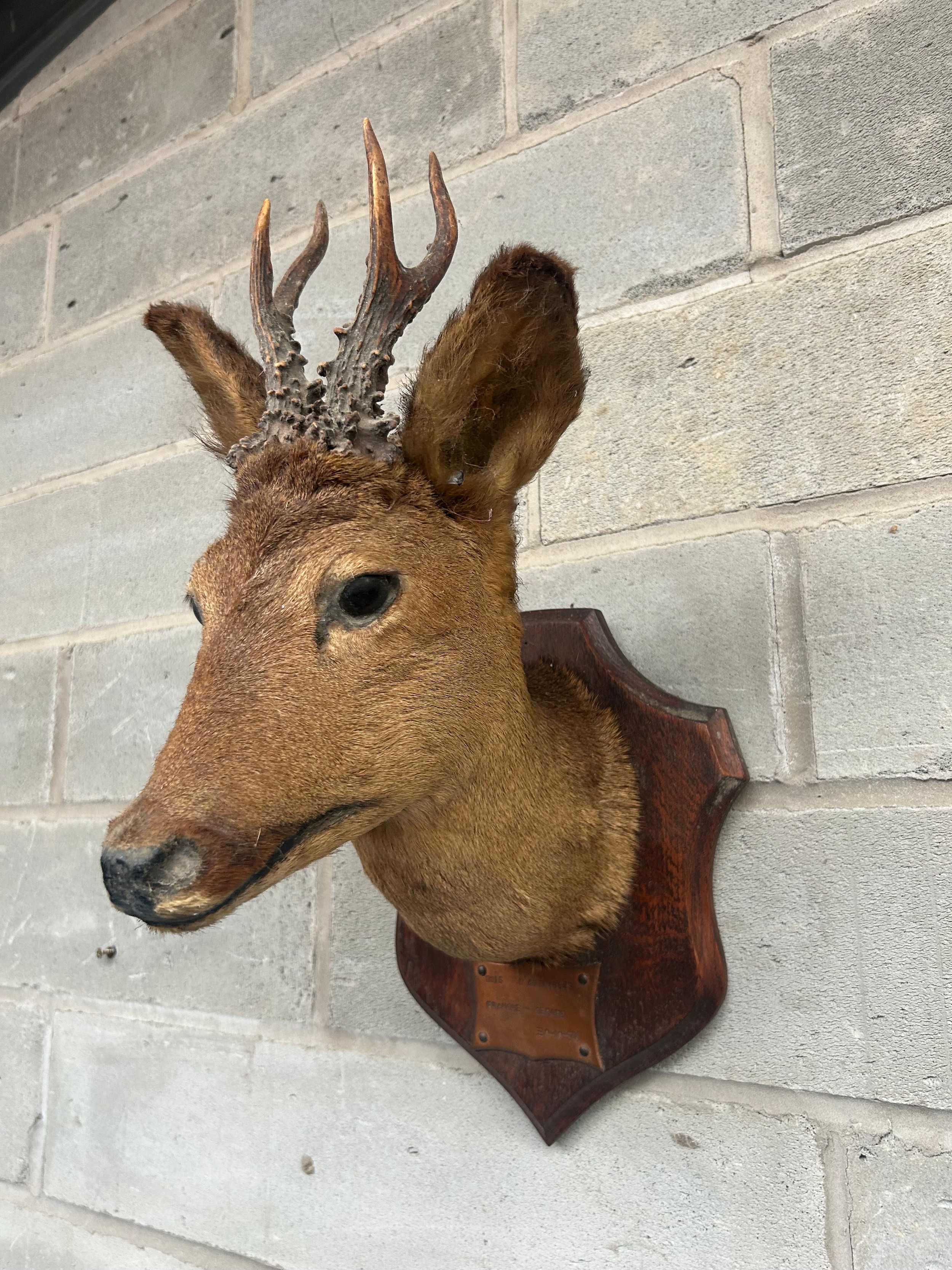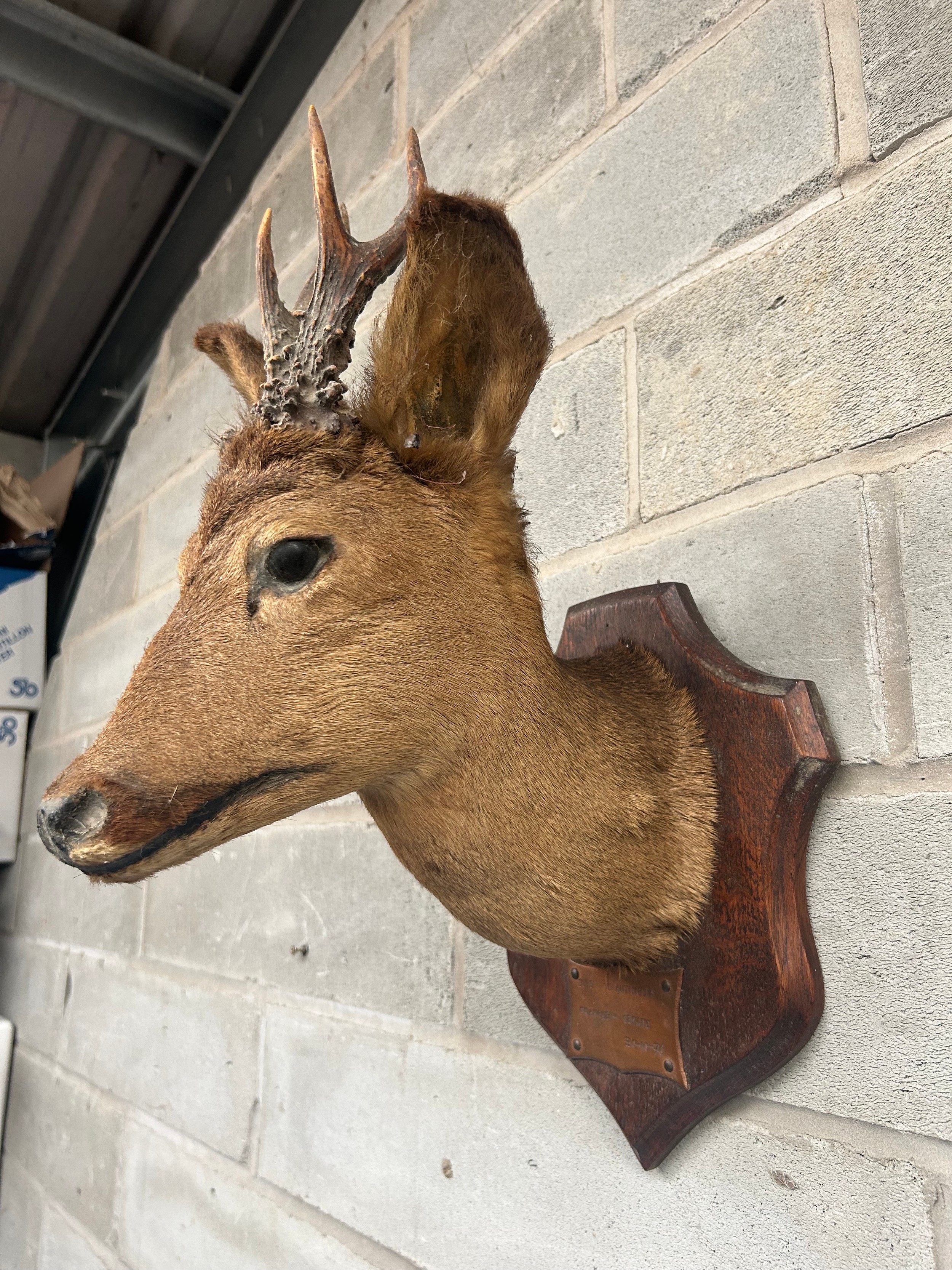 Taxidermy Wall Mounted Deer’s Head Mounted On Shield With Plaque 12" From Wall