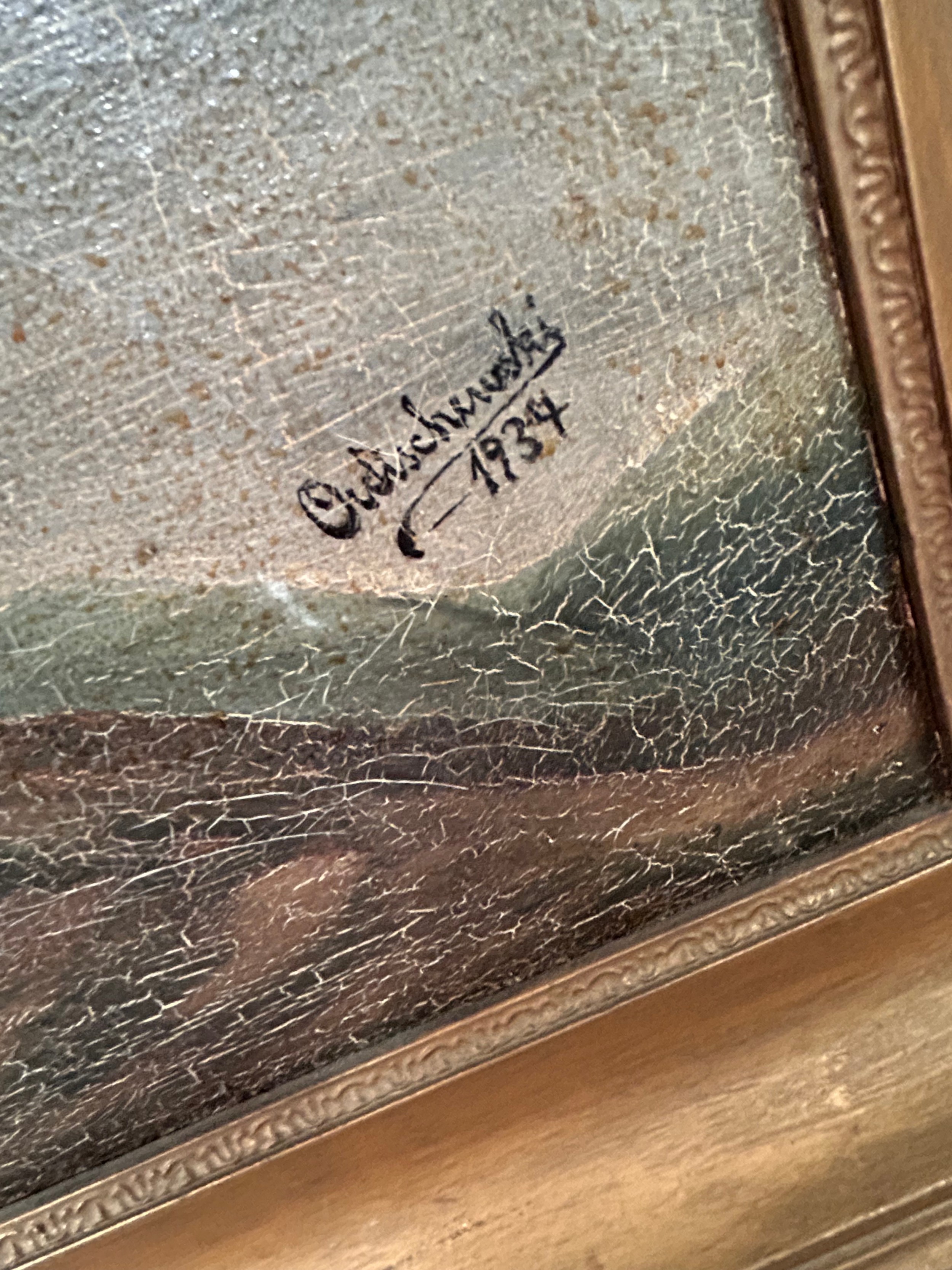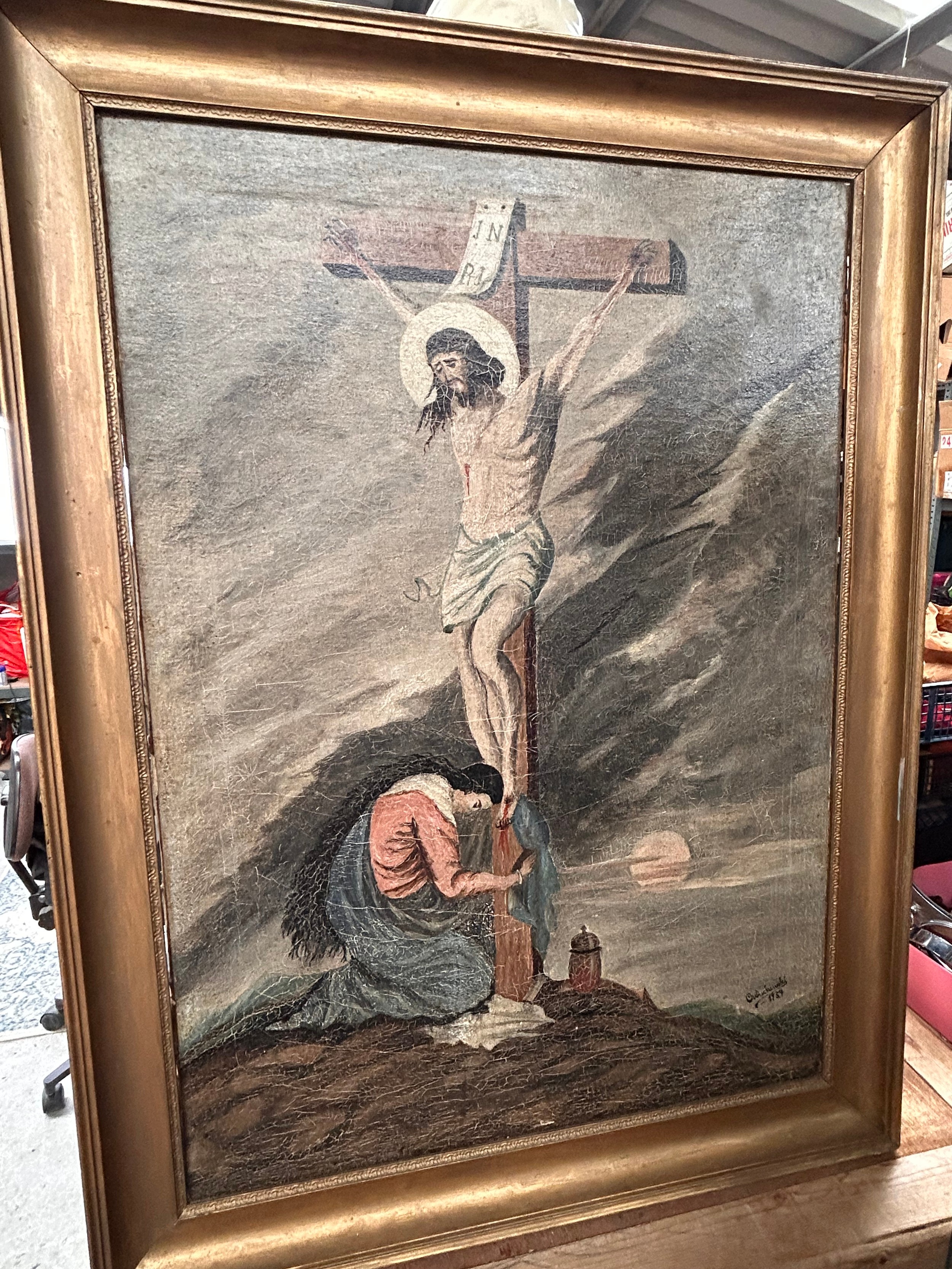 Large Oil On Canvas Depicting Crucifixion Signed 1934 40" x 30".