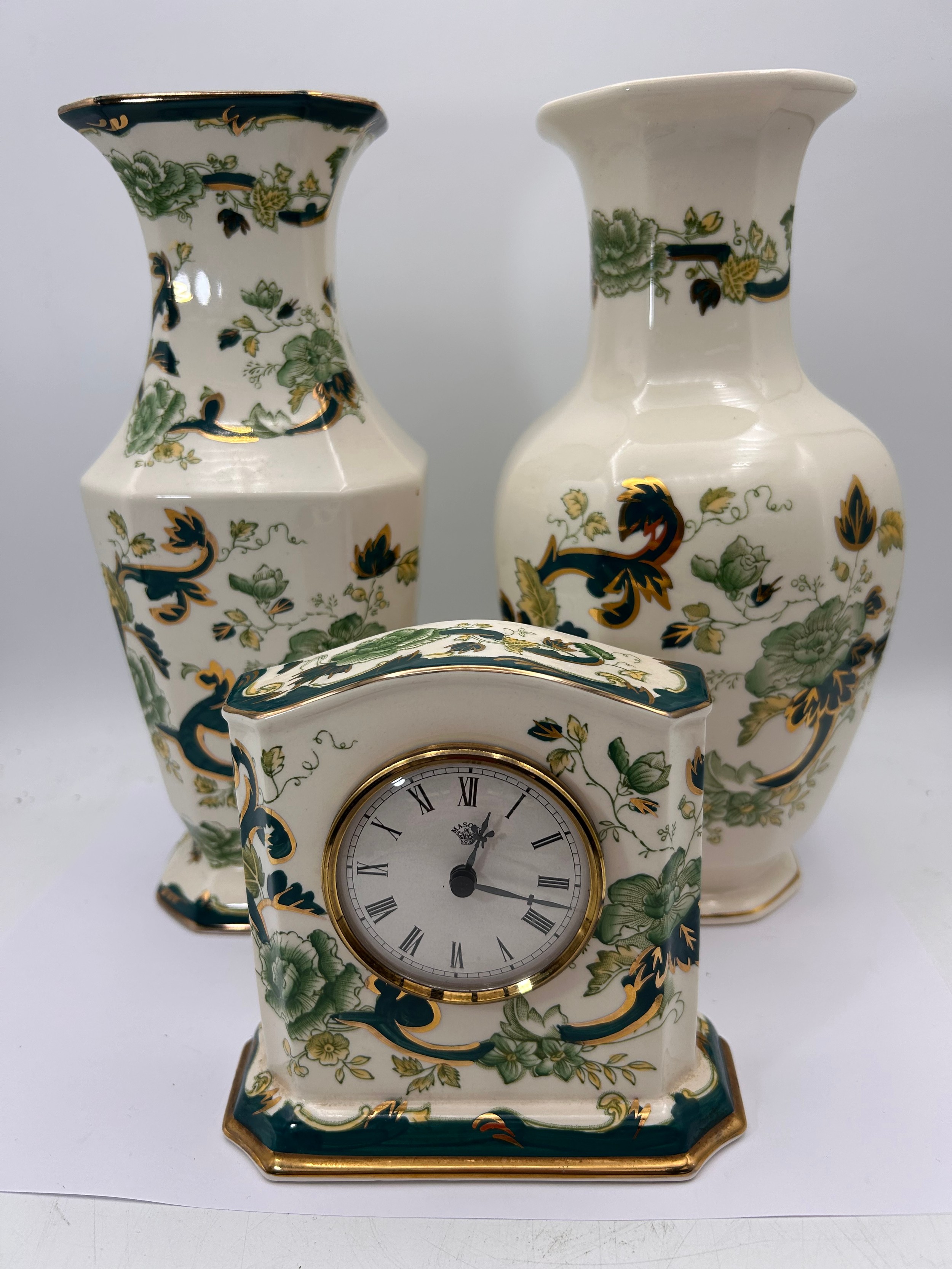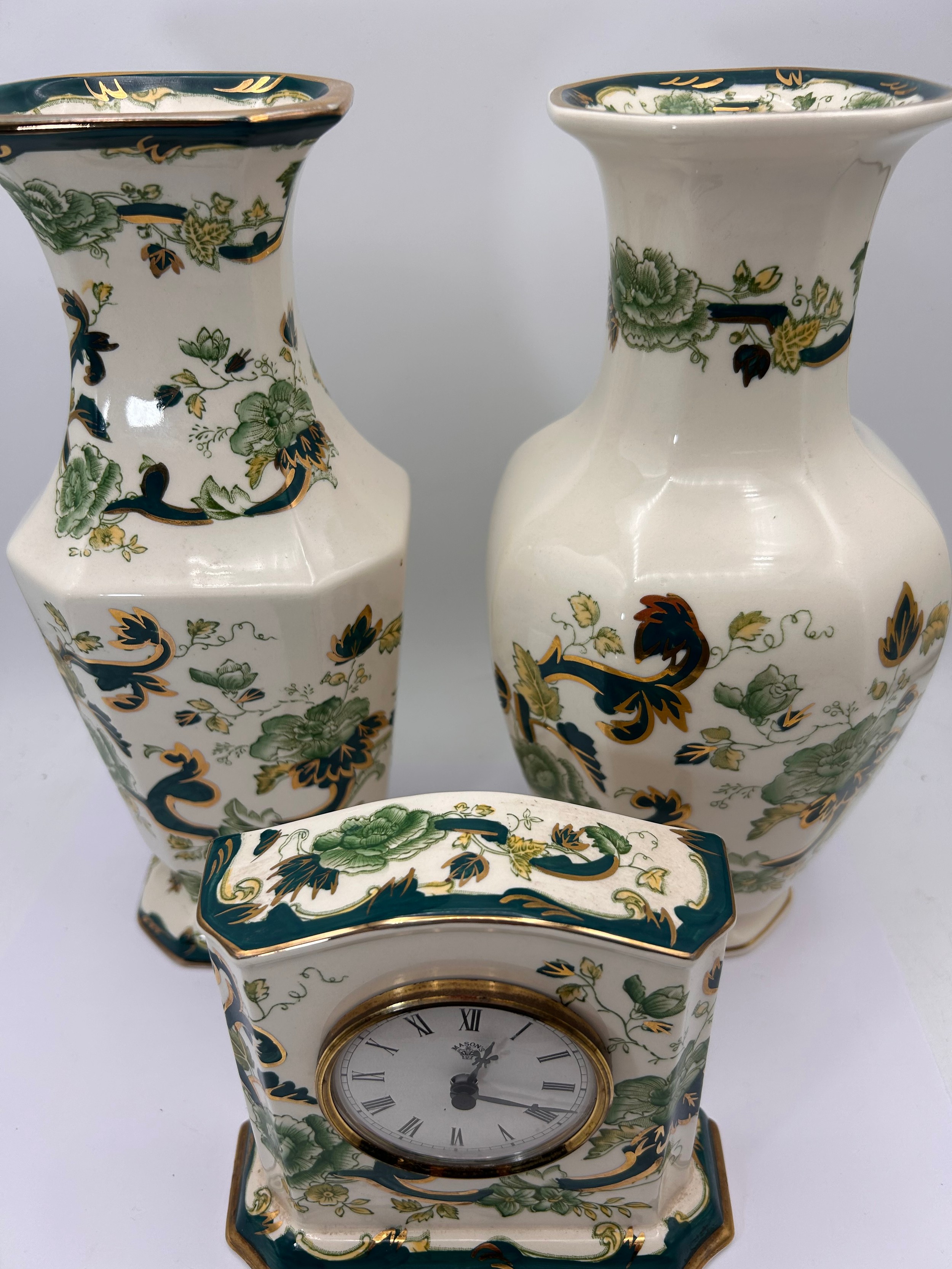 Collection Of Masons Chartreuse , Two Vases 10" , And Mantle Clock.