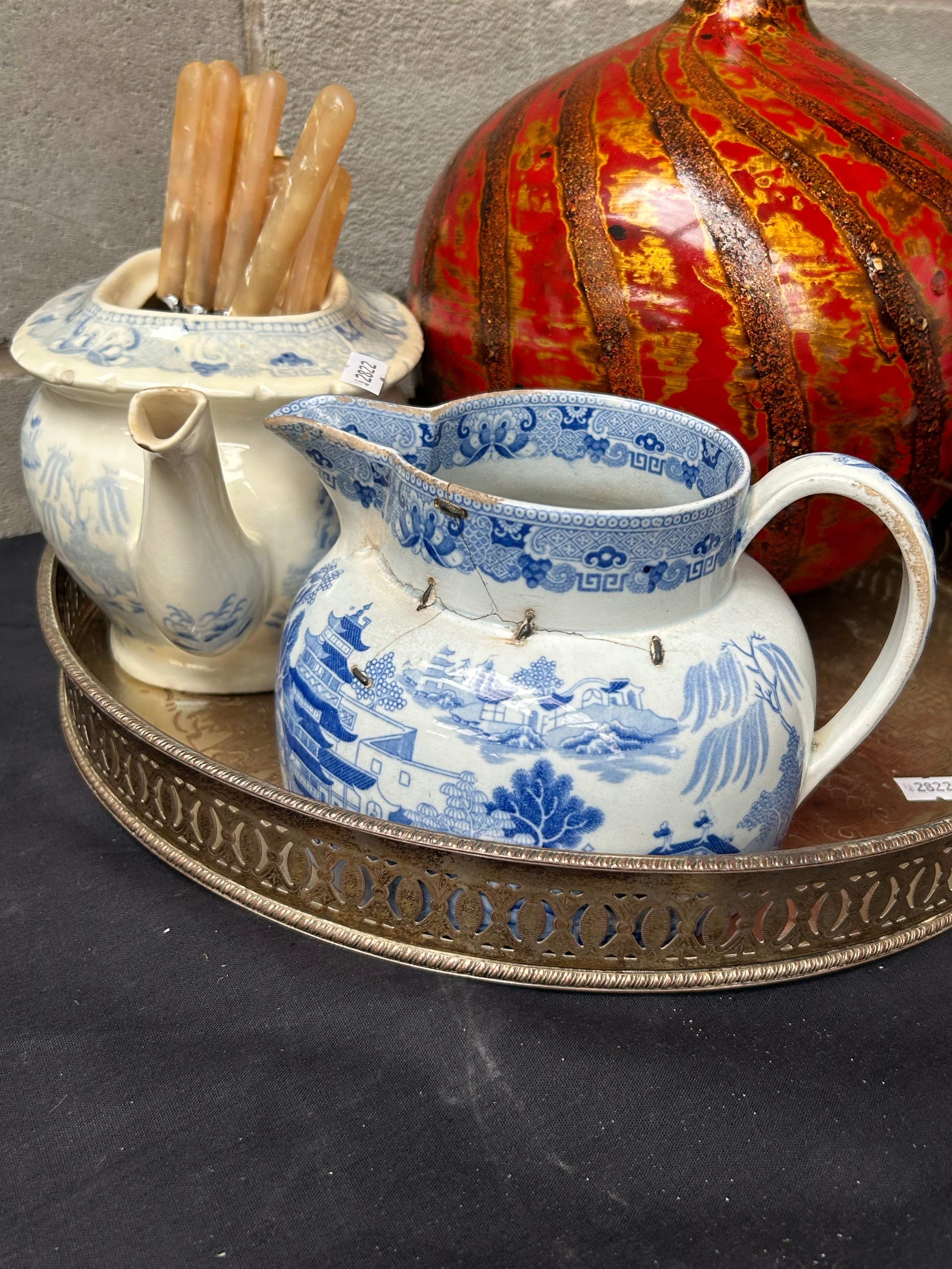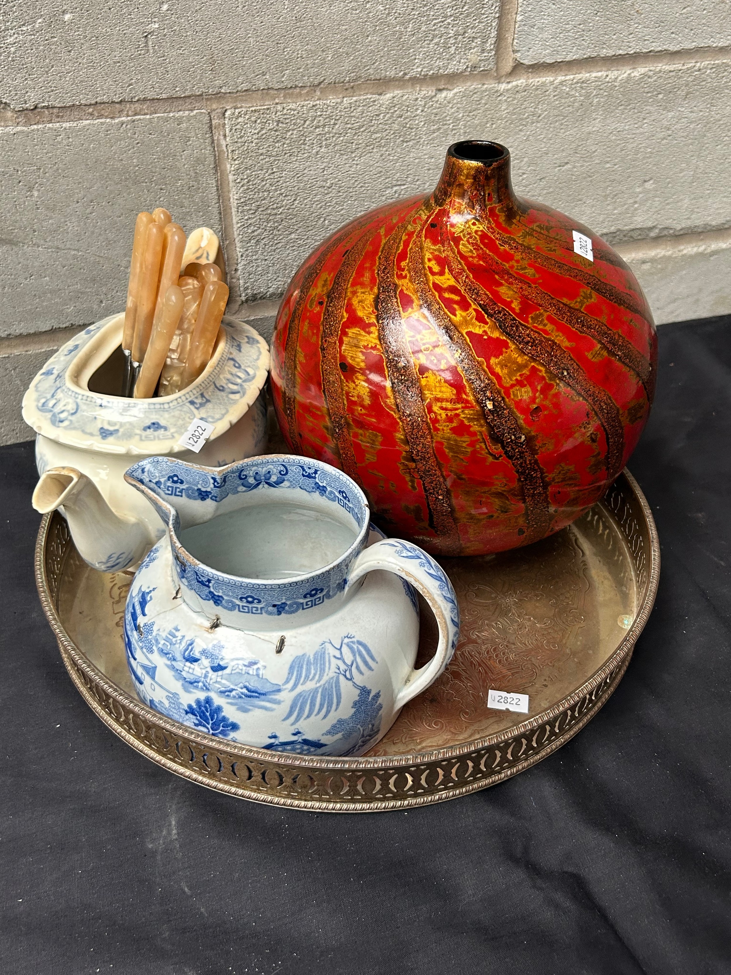 White Metal Tray With Blue And White Ceramics, Vase Etc.