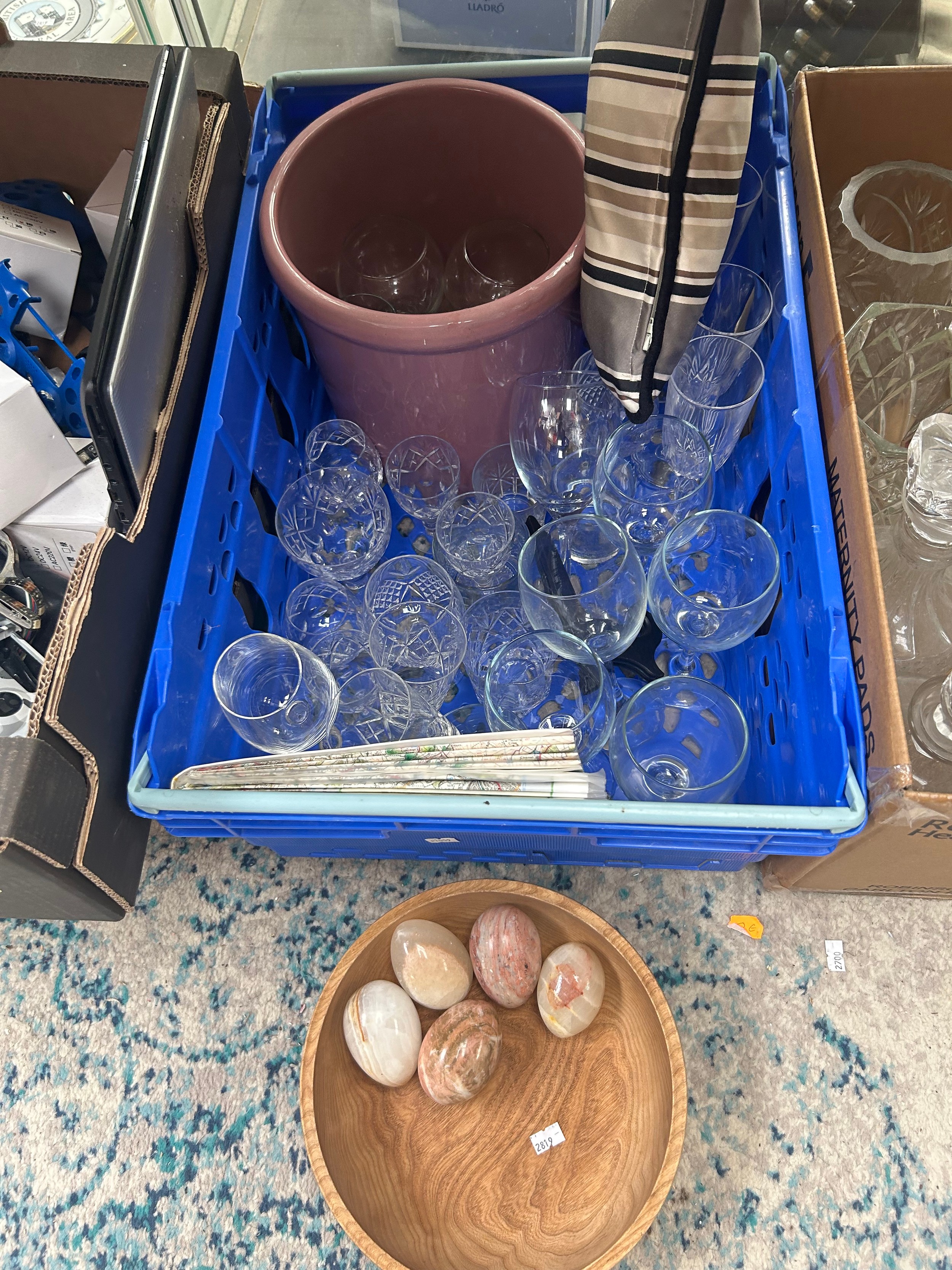 Variety Of Glasses, Large Planter Onyx Eggs Etc.