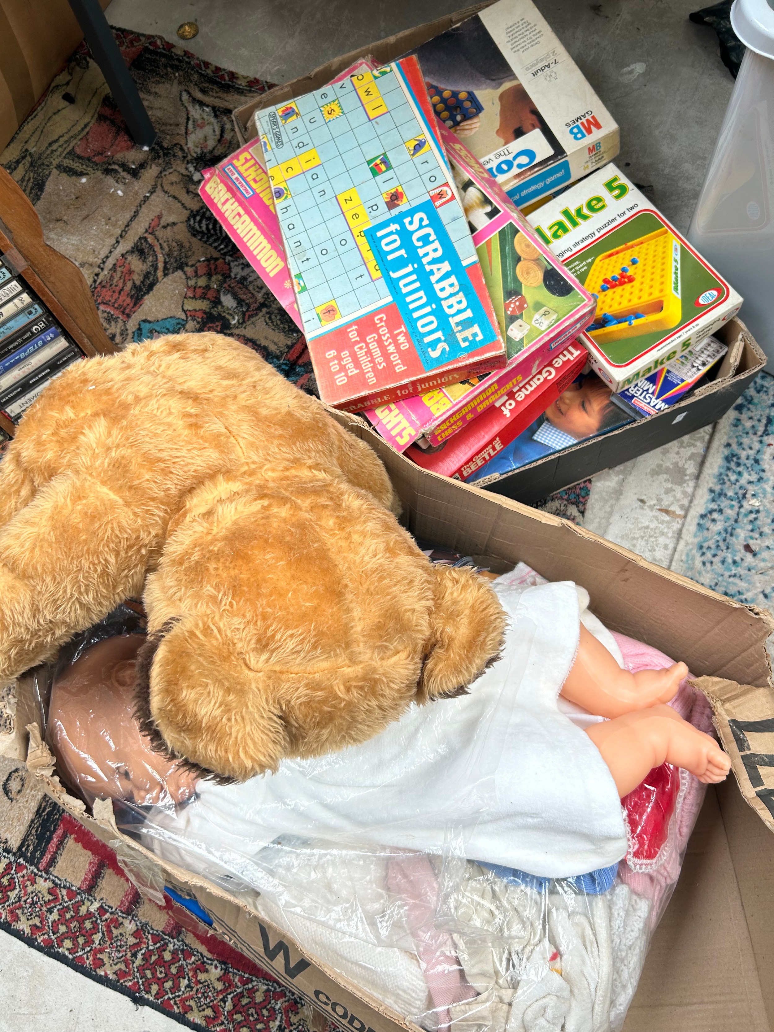 Vintage Doll And Clothing Plus Box Of Vintage Games.