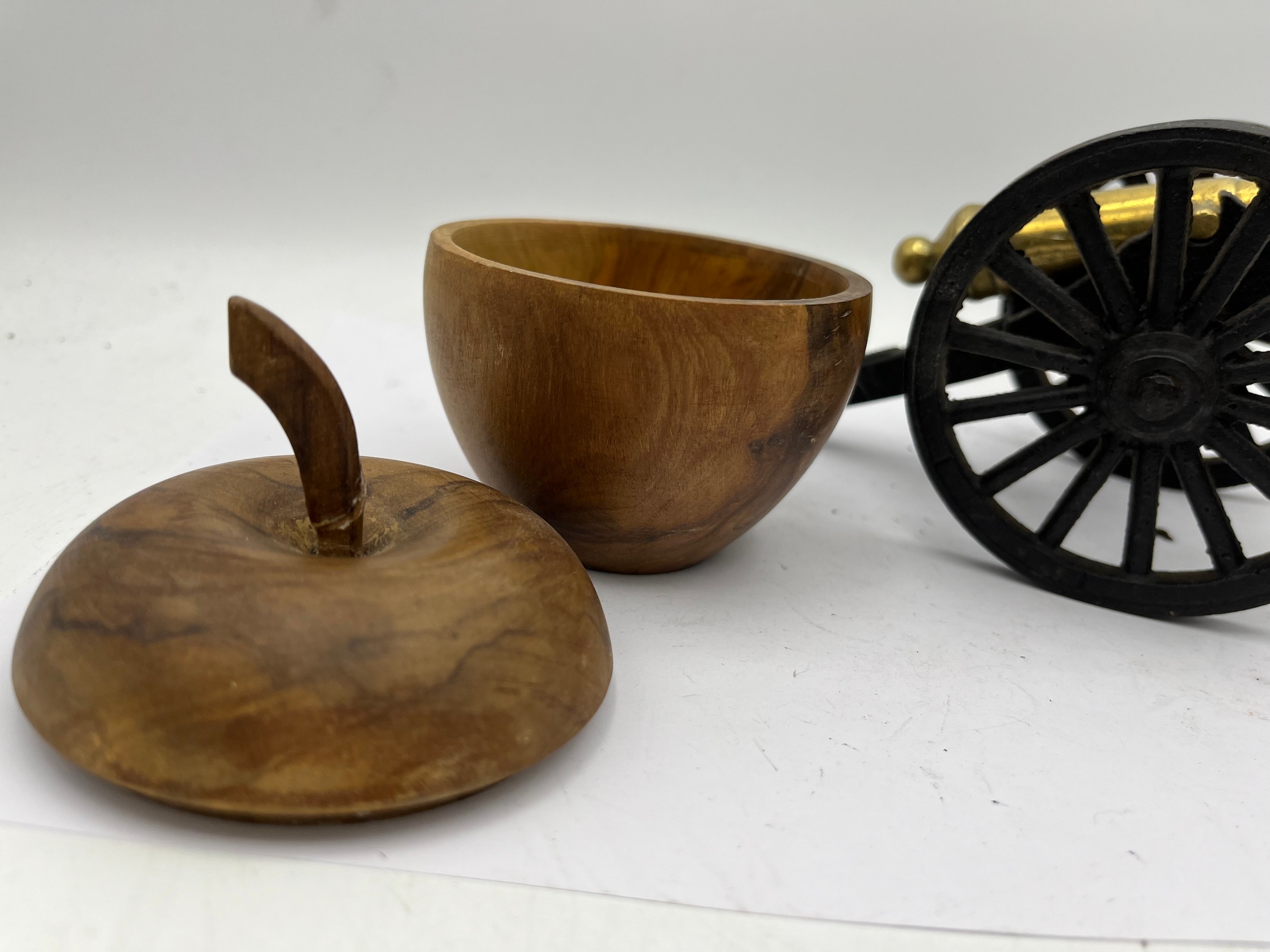Wooden Apple Box And Brass And Cast Canon 9" x 4".