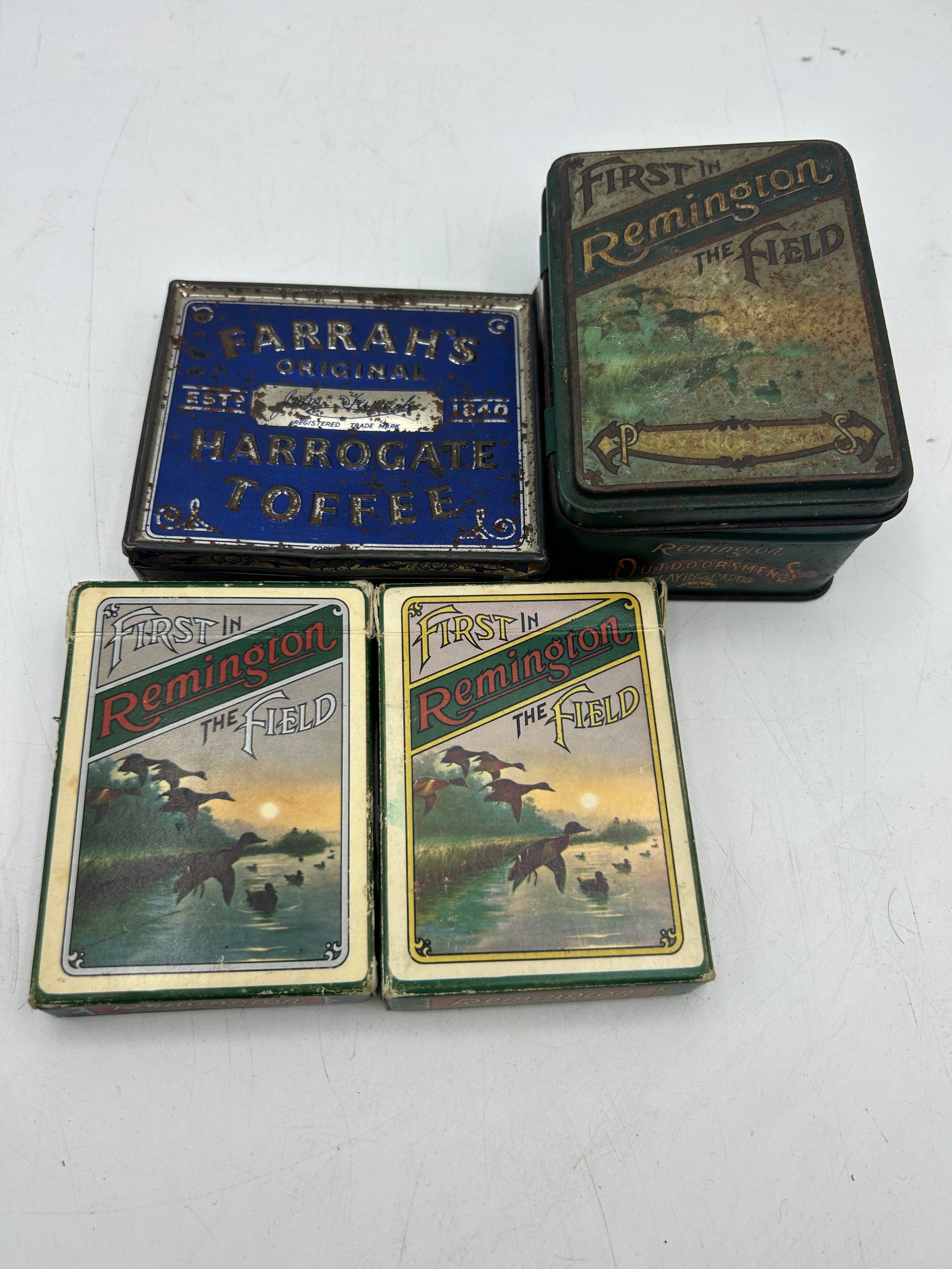 Two Vintage Tins Including First In Remington The Field Cards.