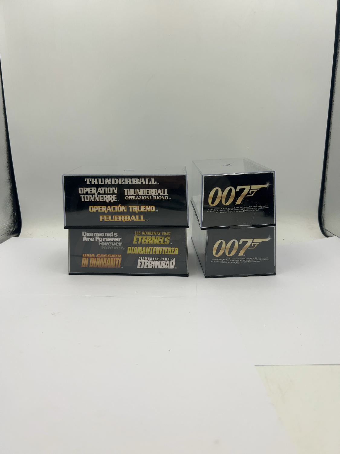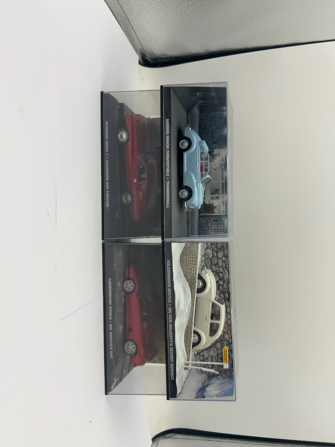 A collection of four contemporary die-cast metal model cars, each presented in a clear plastic display box with a themed diorama base and branded cardboard packaging. The models depict vehicles from the James Bond film series, including a red Mustang Mach 1 from ‘Diamonds Are Forever,’ a light blue Morris Minor Convertible from ‘Thunderball,’ a red Lamborghini Countach from ‘For Your Eyes Only,’ and an off-white Volkswagen Beetle from ‘On Her Majesty’s Secret Service.’ The packaging features prominent ‘007’ branding and multilingual movie titles, such as French ‘LES DIAMANTS SONT ÉTERNELS’ and ‘OPERATION TONNERRE,’ German ‘DIAMANTENFIEBER’ and ‘FEUERBALL,’ Italian ‘DIAMANTI PER L’ETERNITÀ’ and ‘OPERAZIONE TUONO,’ and Spanish ‘DIAMANTES PARA LA ETERNIDAD’ and ‘OPERACIÓN TRUENO.’ These items are consistent with contemporary manufacture die-cast cars often sold as part of a collection.