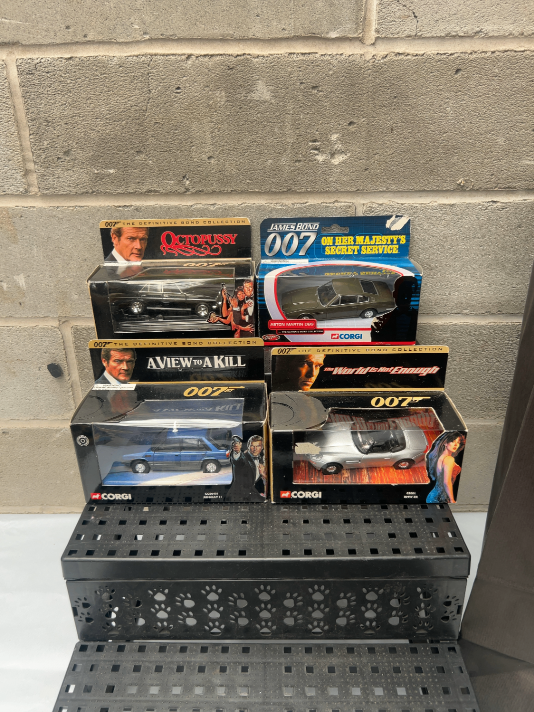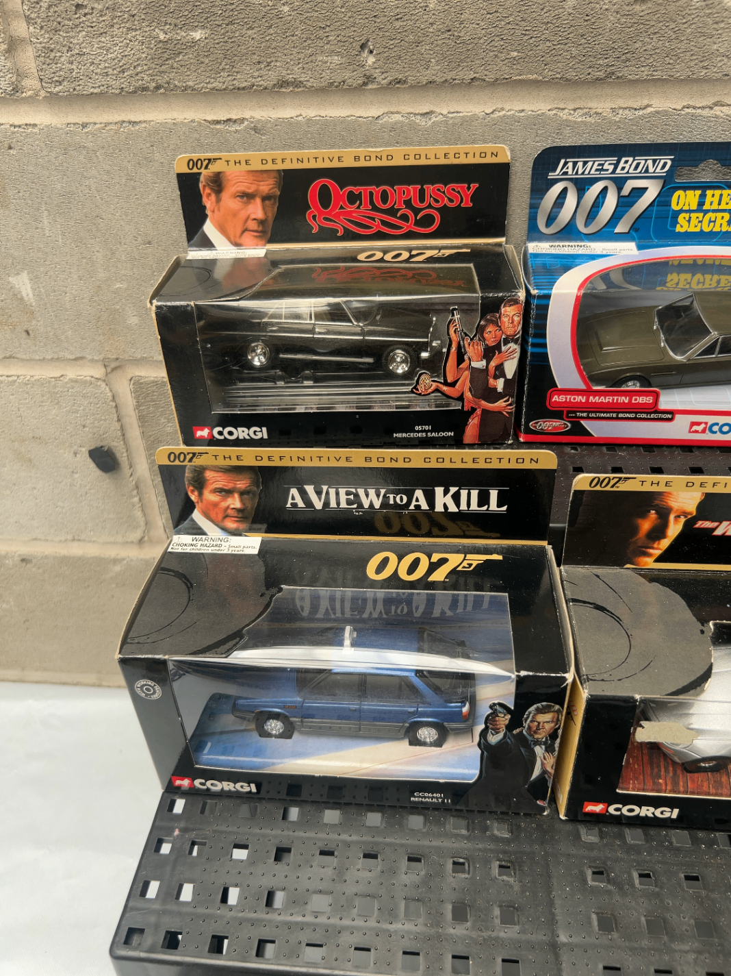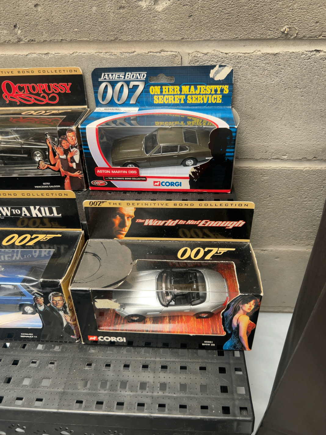 A collection of four Corgi James Bond 007 Ultimate Collection die-cast model vehicles. Each model is individually packaged within its original cardboard and plastic display box or blister pack. Three models are explicitly labeled “007 THE DEFINITIVE BOND COLLECTION”: “OCTOPUSSY” (Mercedes Saloon 05701), “A VIEW TO A KILL” (Renault 11 05901), and “THE WORLD IS NOT ENOUGH” (BMW Z8 05801), featuring corresponding actors and movie art. The fourth model is an Aston Martin DBS from “JAMES BOND 007 ON HER MAJESTY’S SECRET SERVICE.”