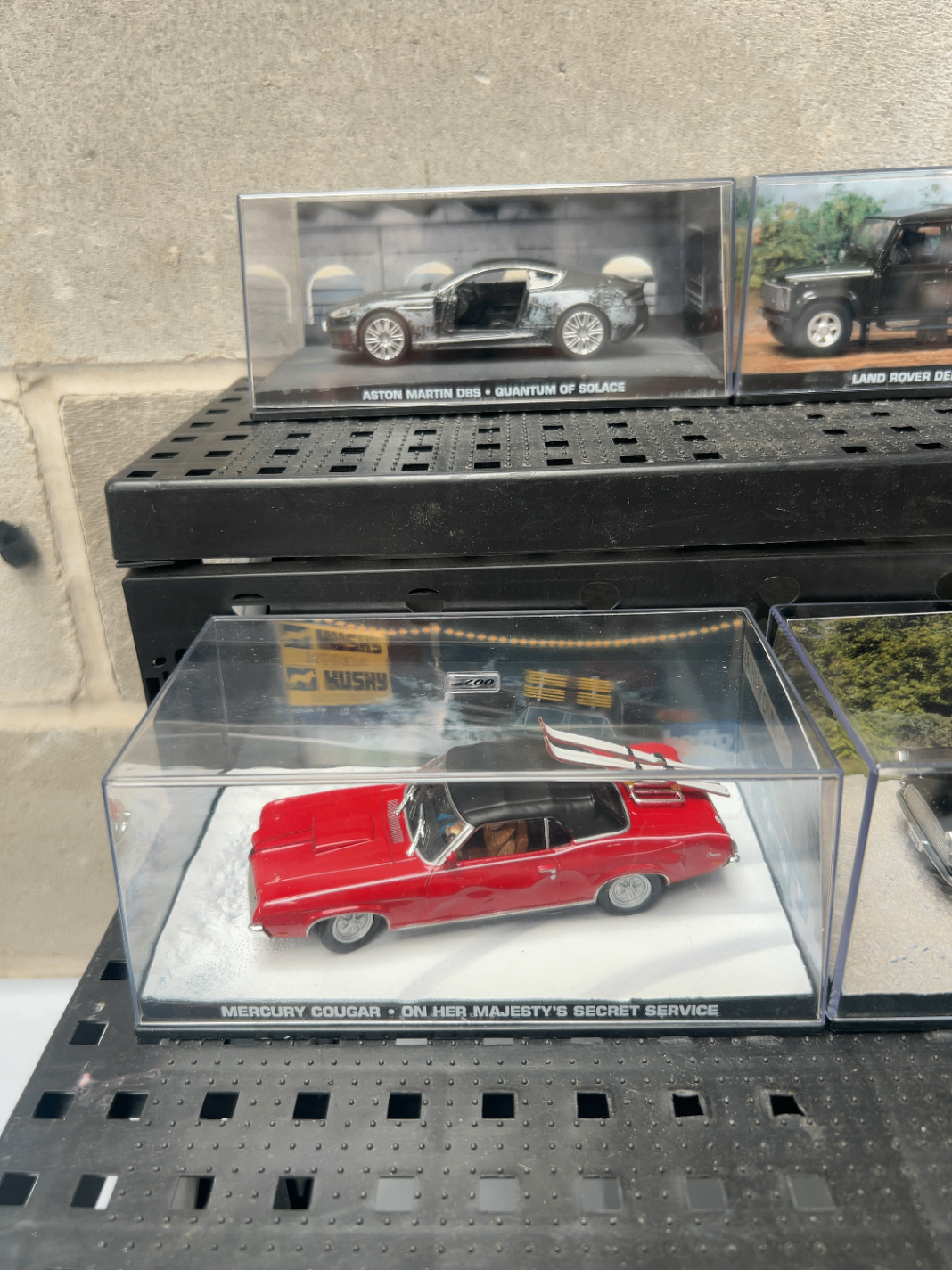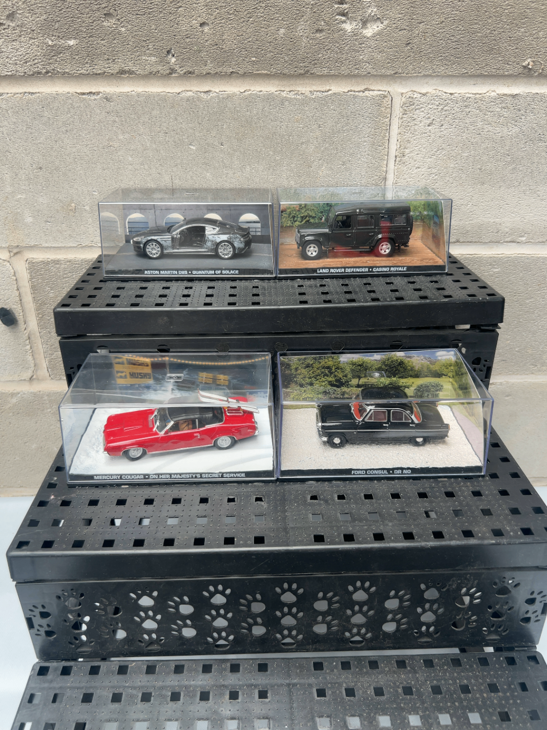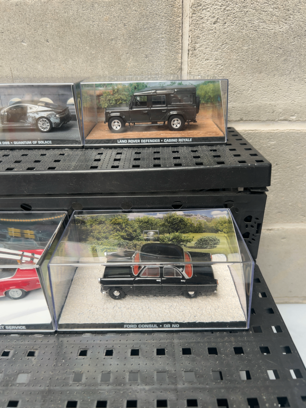 A group of Eaglemoss James Bond Collection die-cast model cars. This collection comprises four modern replicas of vehicles featured in the James Bond film series, each presented in a clear acrylic display case with a black plastic base and a themed scenic background insert. The models include a silver Aston Martin DBS from *Quantum of Solace*, a black Land Rover Defender from *Casino Royale*, a red Mercury Cougar from *On Her Majesty’s Secret Service*, and a black Ford Consul from *Dr. No*.