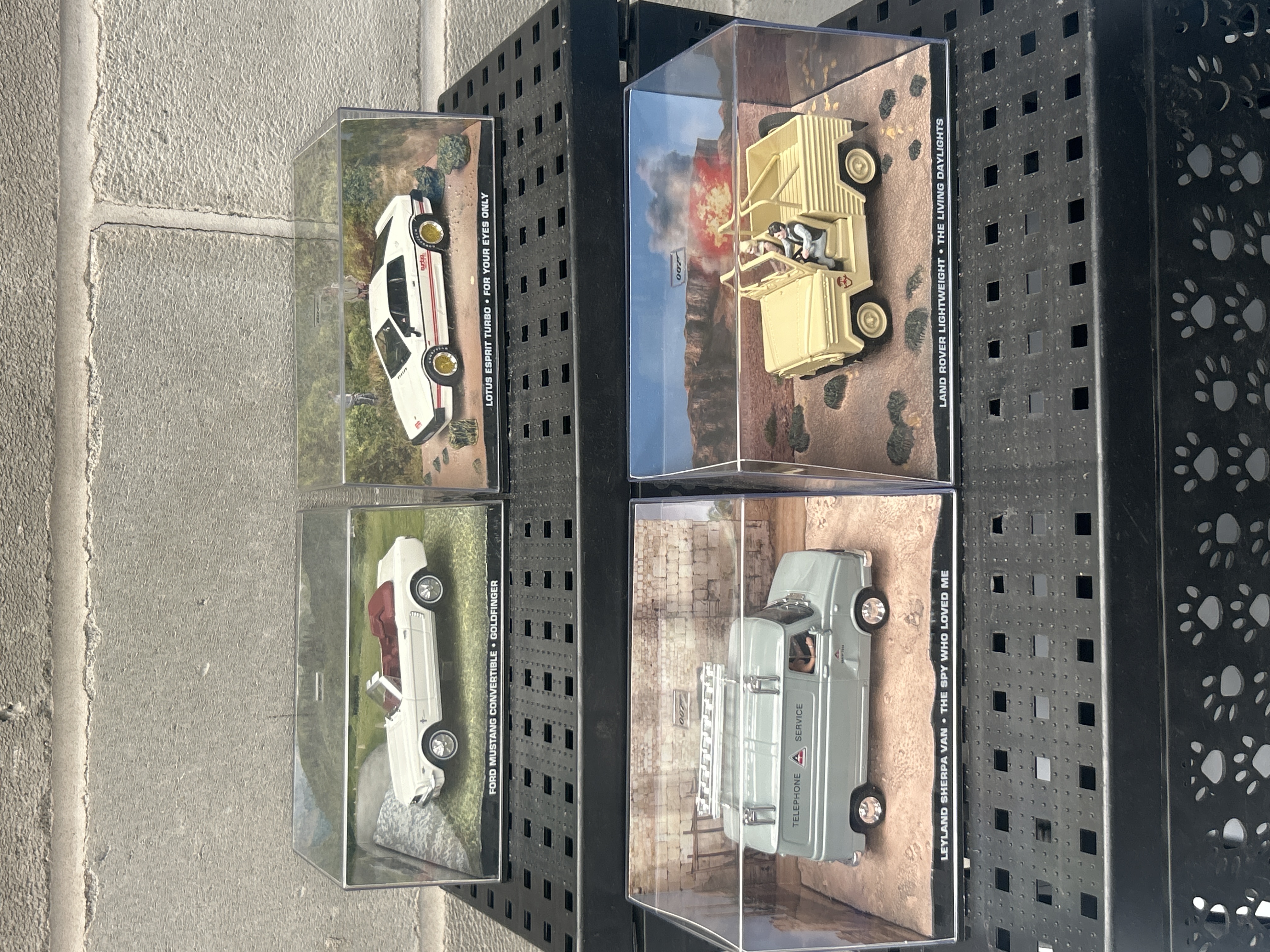 A group of four Eaglemoss James Bond 007 die-cast model vehicles, each presented within individual clear plastic display cases featuring diorama-style bases. The collection includes a white Ford Mustang Convertible with a red interior, identified as from “GOLDFINGER”; a white Lotus Esprit Turbo with red stripes and “Goodyear” tire branding, identified as from “FOR YOUR EYES ONLY”; a grey Leyland Sherpa Van with a roof rack, marked “TELEPHONE SERVICE” and “MAP 7314,” identified as from “THE SPY WHO LOVED ME”; and a tan Land Rover Lightweight, complete with two miniature figures and a small red parachute symbol, identified as from “THE LIVING DAYLIGHTS.” “007” branding is visible within the background of two dioramas, firmly establishing their James Bond film memorabilia style.