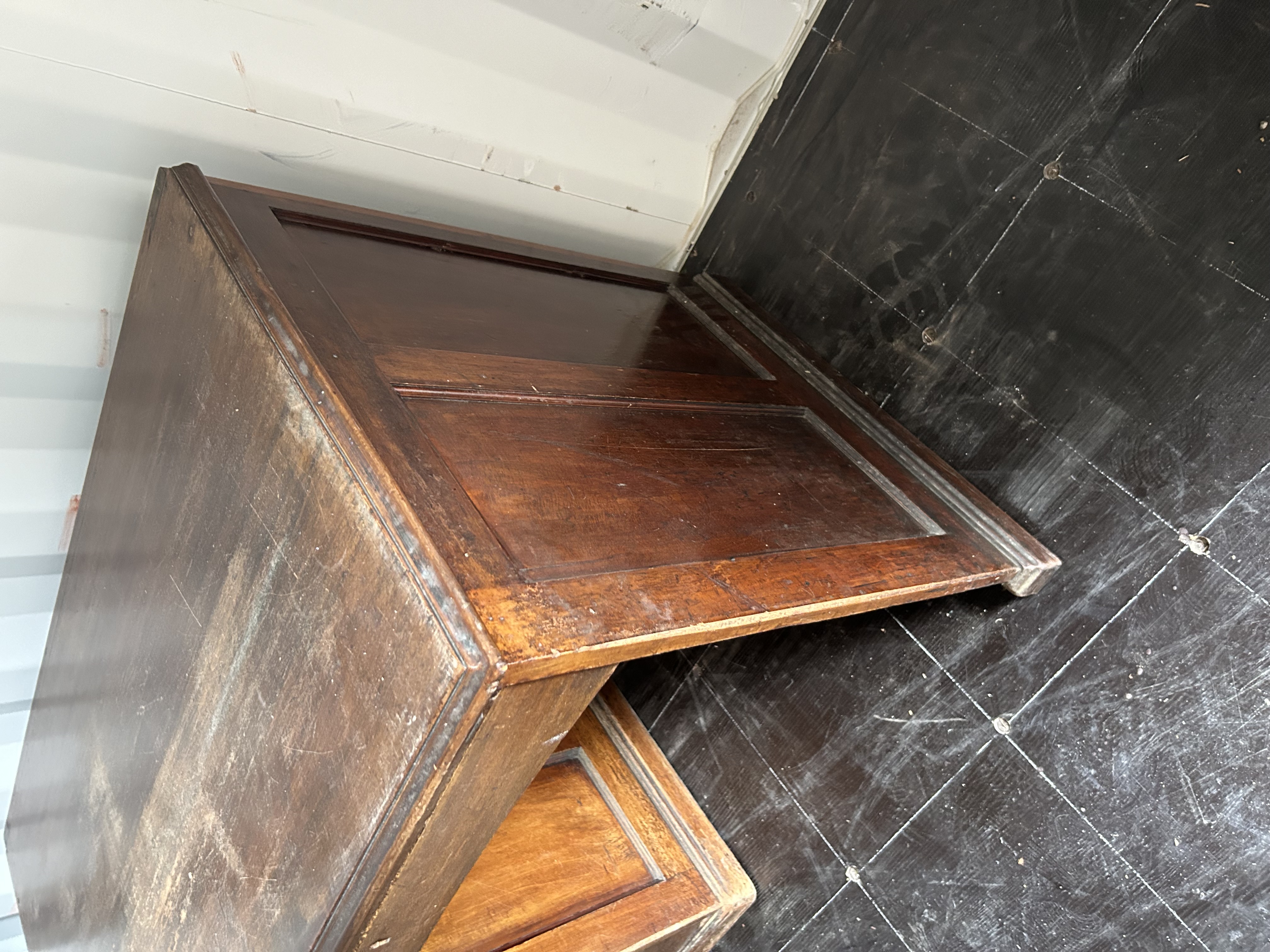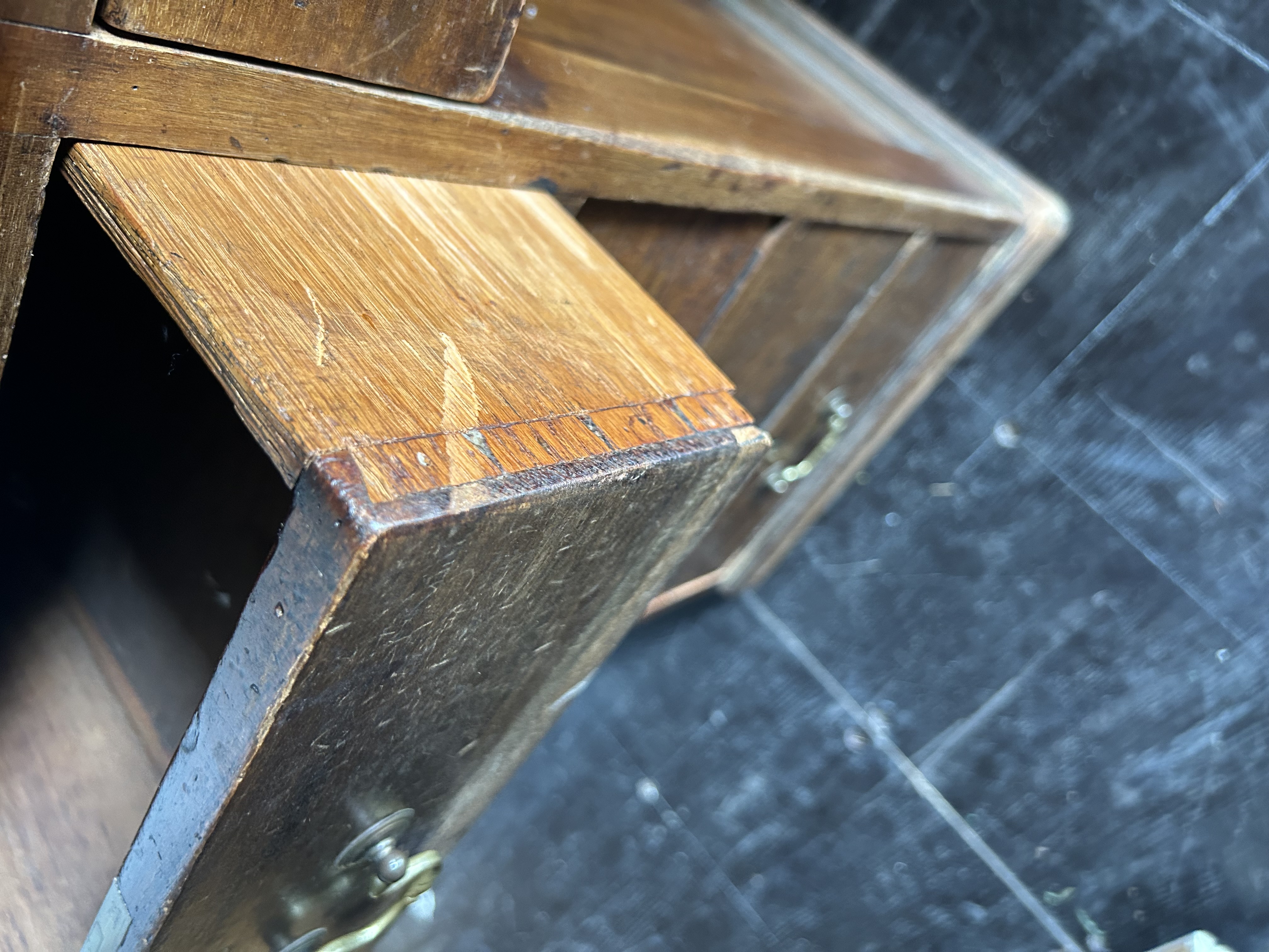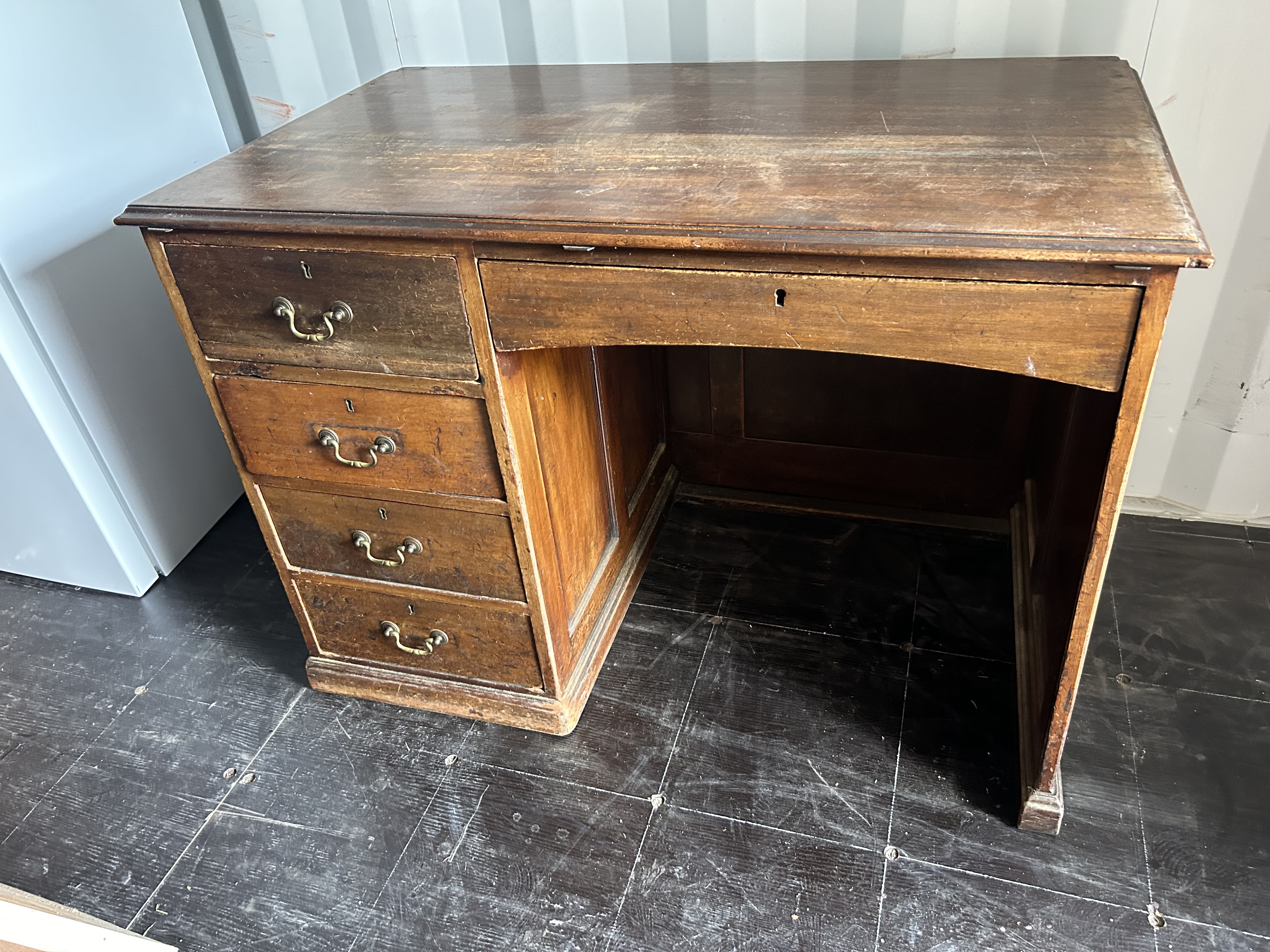 A traditional-style single pedestal writing desk, constructed of C2486. The desk features a bank of four dovetailed drawers with ornate brass-toned pulls on the left, a central kneehole, and an additional single drawer above. A brass plaque inside the top drawer reads “G. GIBBARD STRATFORD, ONT.”, identifying the manufacturer as Gibbard Furniture of Stratford, Ontario, Canada.