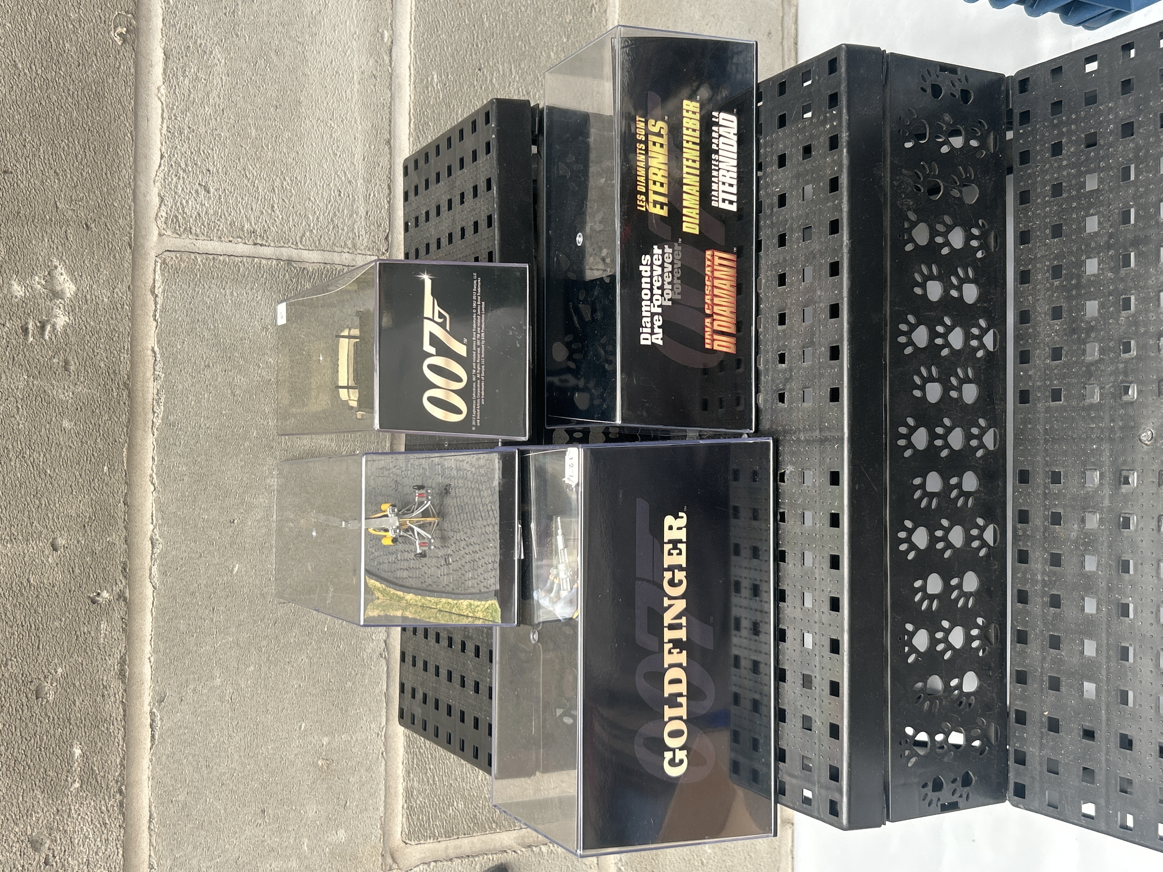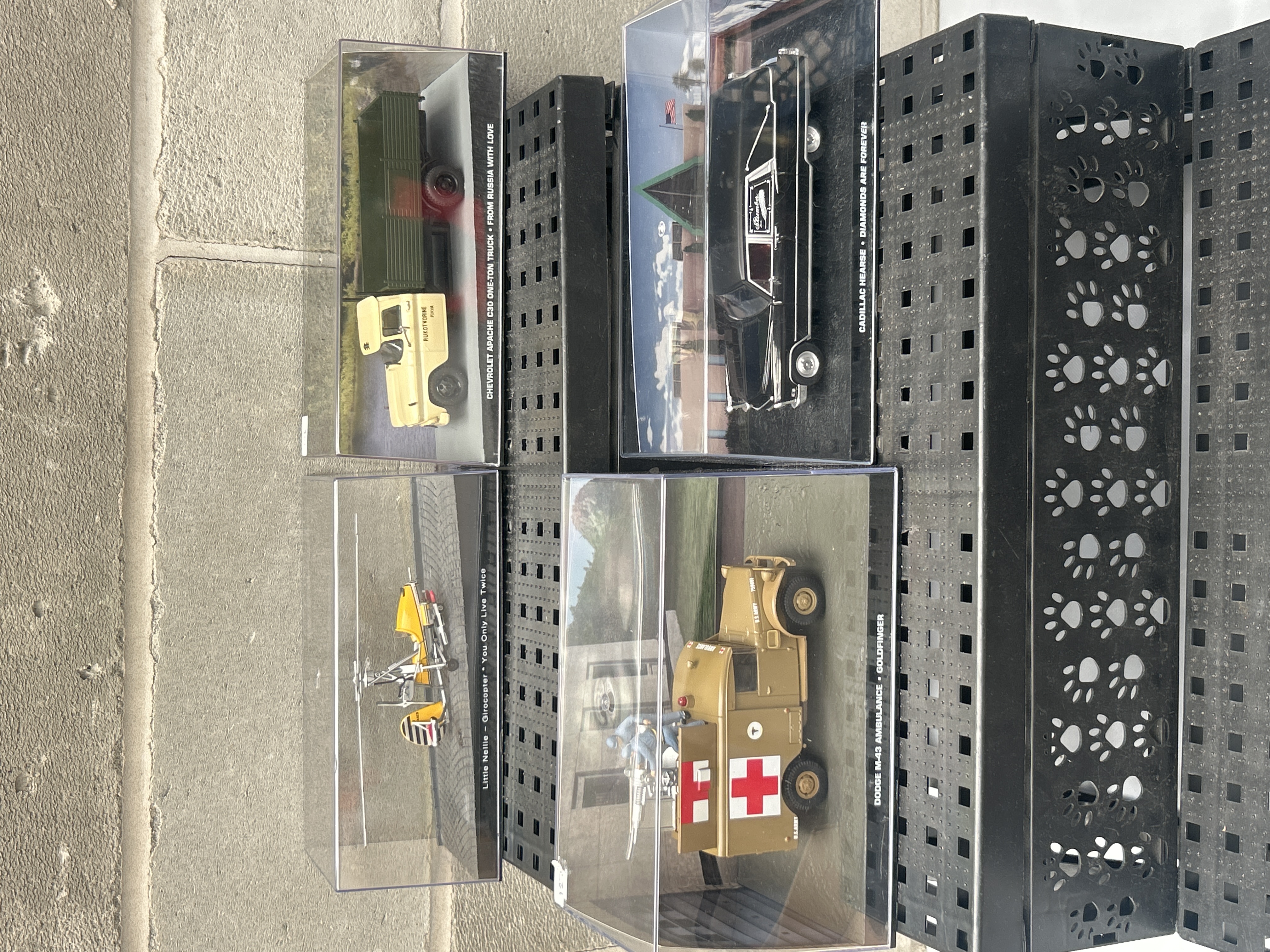 A group of four Eaglemoss James Bond 007 1:43 die-cast model vehicles, each individually encased in a clear plastic display box with a black base. The collection includes a yellow “Little Nellie” Gyrocopter from “You Only Live Twice,” a beige “CHEVROLET APACHE 030 ONE TON TRUCK” from “From Russia With Love,” a tan “DODGE M-43 AMBULANCE” from “Goldfinger,” and a black “CADILLAC HEARSE” from “Diamonds Are Forever.” The reverse sides of the packaging feature “007” James Bond branding and movie titles, with “GOLDFINGER” clearly visible on one and “Diamonds Are Forever” translated into multiple languages on another: French (“LES DIAMANTS SONT ÉTERNELS”), German (“DIAMANTENFIEBER”), Italian (“UNA CASCATA DI DIAMANTI”), and Spanish (“DIAMANTES PARA LA ETERNIDAD”).