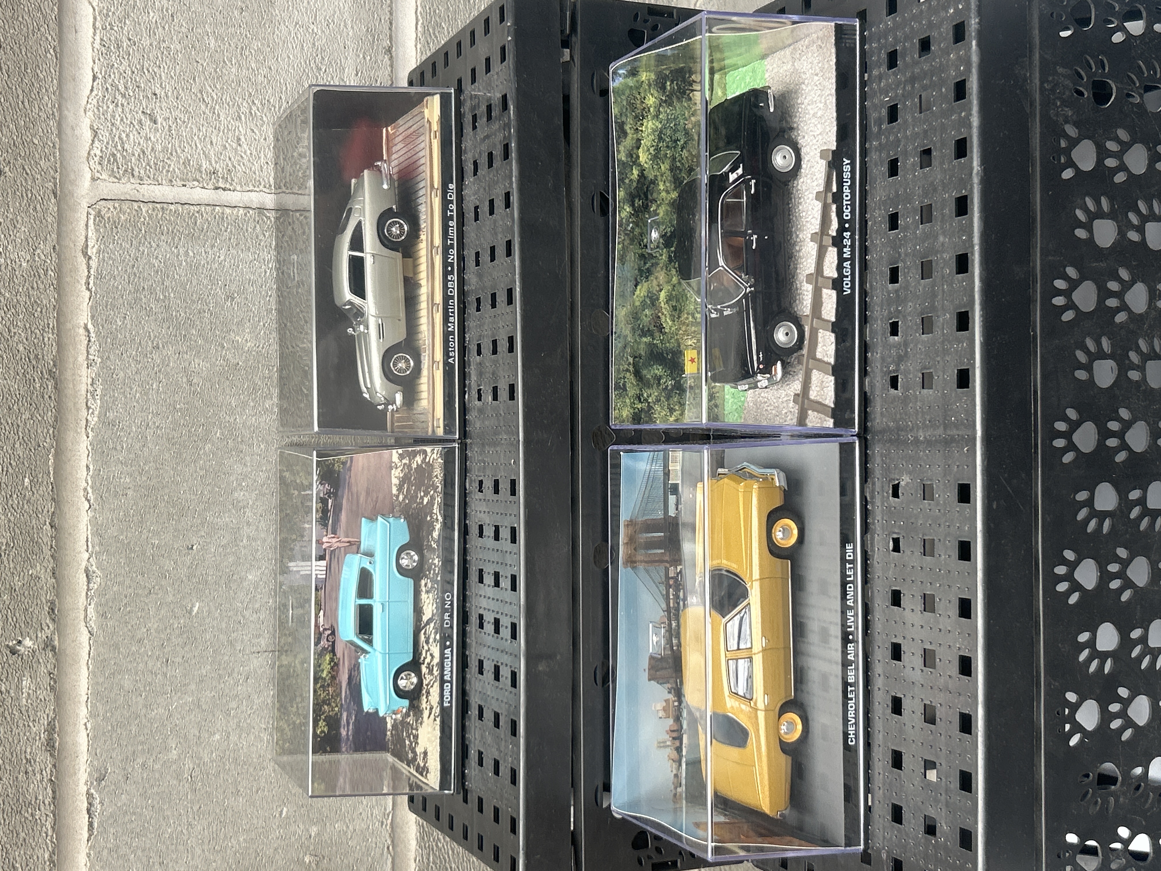 A group of Eaglemoss James Bond 1:43 scale die-cast model cars, each individually housed within a clear acrylic display case featuring a unique thematic diorama base. The collection includes a light blue Ford Anglia from *Dr. No*, a silver Aston Martin DB5 from *No Time To Die*, a gold Chevrolet Bel Air from *Live and Let Die*, and a black Volga M-24 from *Octopussy*. Each display base is marked with the respective car model and film title in English. The models are constructed from die-cast metal and plastic. The group is presented on a black plastic tiered shelf.