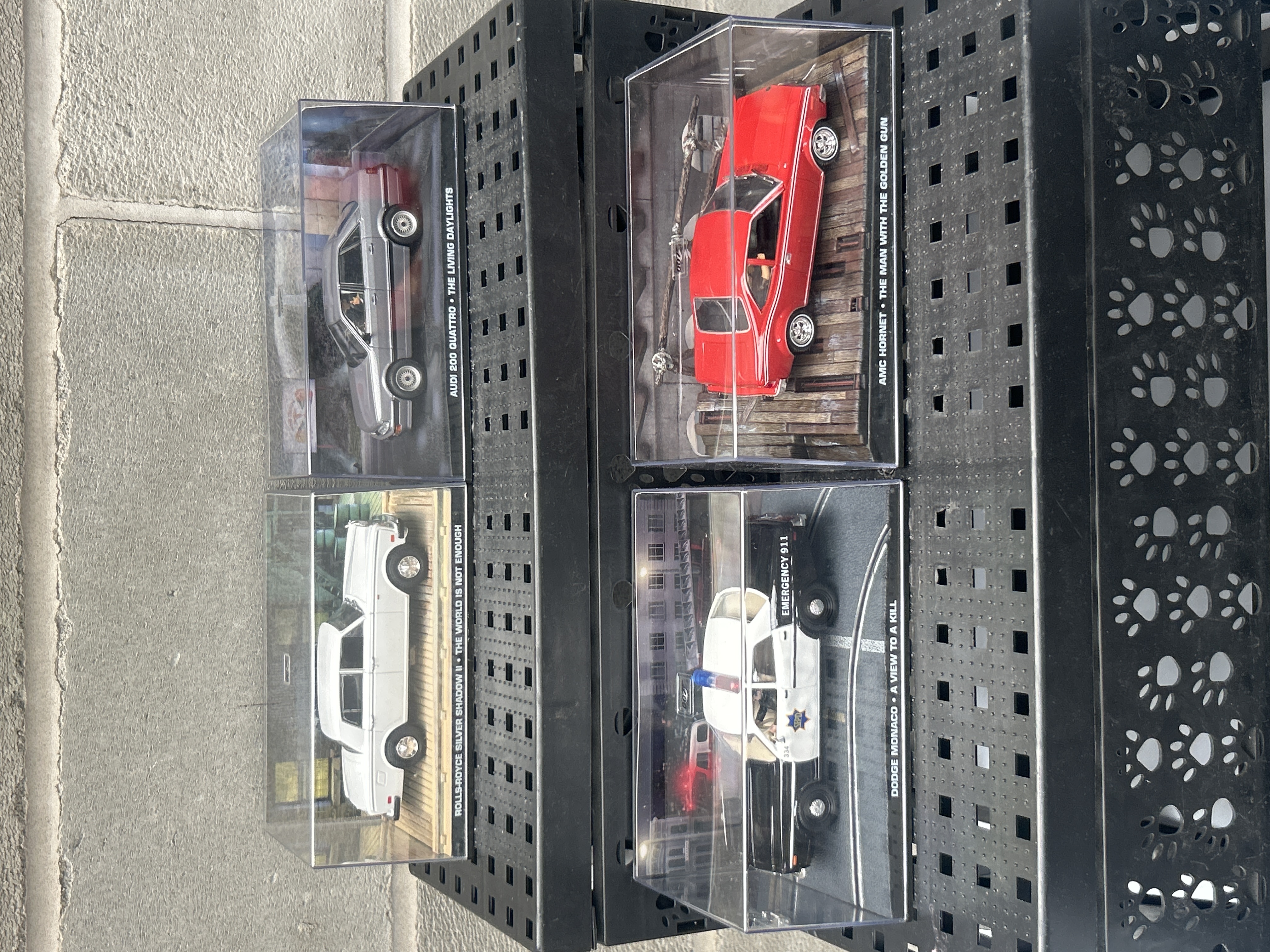 A group of four Eaglemoss James Bond 1:43 die-cast model cars. Each model is presented in a clear acrylic display case atop a black plastic base. The individual models include a white Rolls-Royce Silver Shadow II (from ‘The World Is Not Enough’), a grey Audi 200 Quattro (from ‘The Living Daylights’), a black and white Dodge Monaco police car with “SFPD,” “334,” and “EMERGENCY 911” markings (from ‘A View to a Kill’), and a red AMC Hornet (from ‘The Man With the Golden Gun’). Each base features engraved text linking the vehicle to its associated James Bond film. These highly detailed replicas, likely of mixed media (metal and plastic), represent vehicles primarily from the 1970s and 1980s.