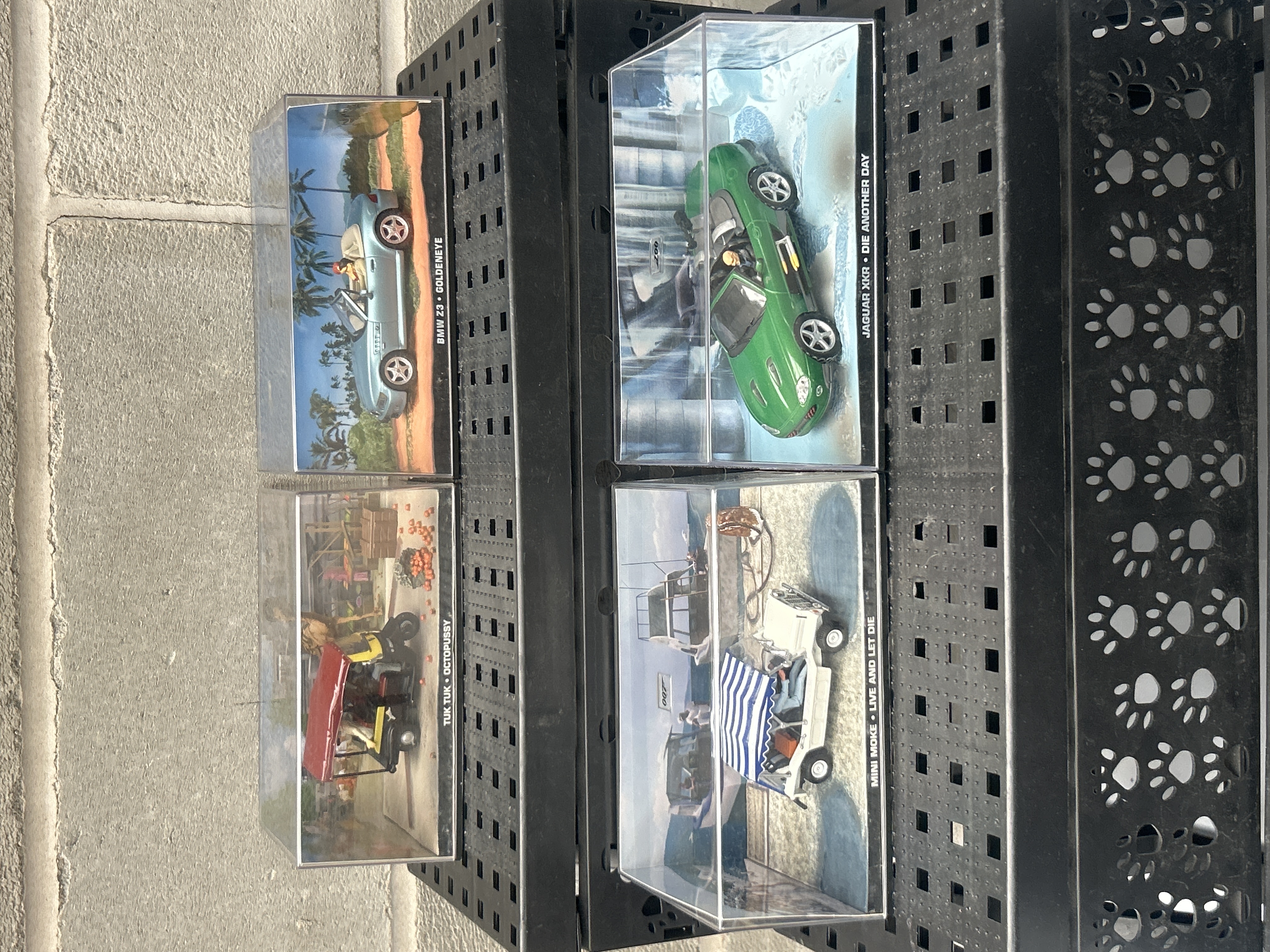 A collection of four Eaglemoss James Bond 1:43 scale die-cast model vehicles, each presented within a themed diorama and enclosed in a clear acrylic display case with a black base. The collection features iconic vehicles from the James Bond film series, including a red and yellow Tuk Tuk from “Octopussy”, a light blue BMW Z3 from “GoldenEye”, a white Mini Moke with a striped canopy from “Live and Let Die”, and a green Jaguar XKR from “Die Another Day”. Each diorama includes a miniature figure and scenic elements, with “007” branding visible within the scenes of the bottom two cases. Constructed primarily from die-cast metal and plastic, these items represent a collectible series likely produced in the late 20th to early 21st century.