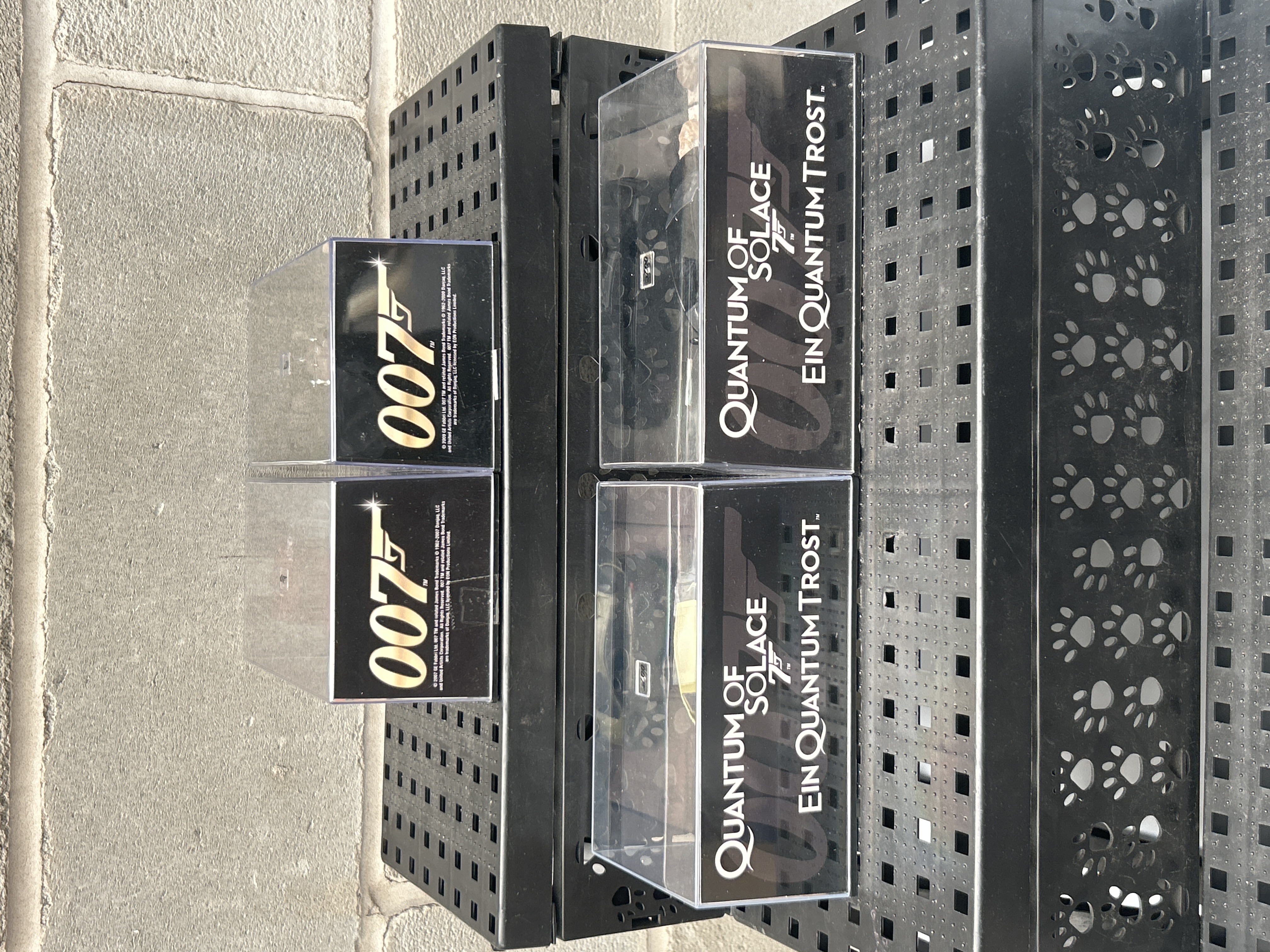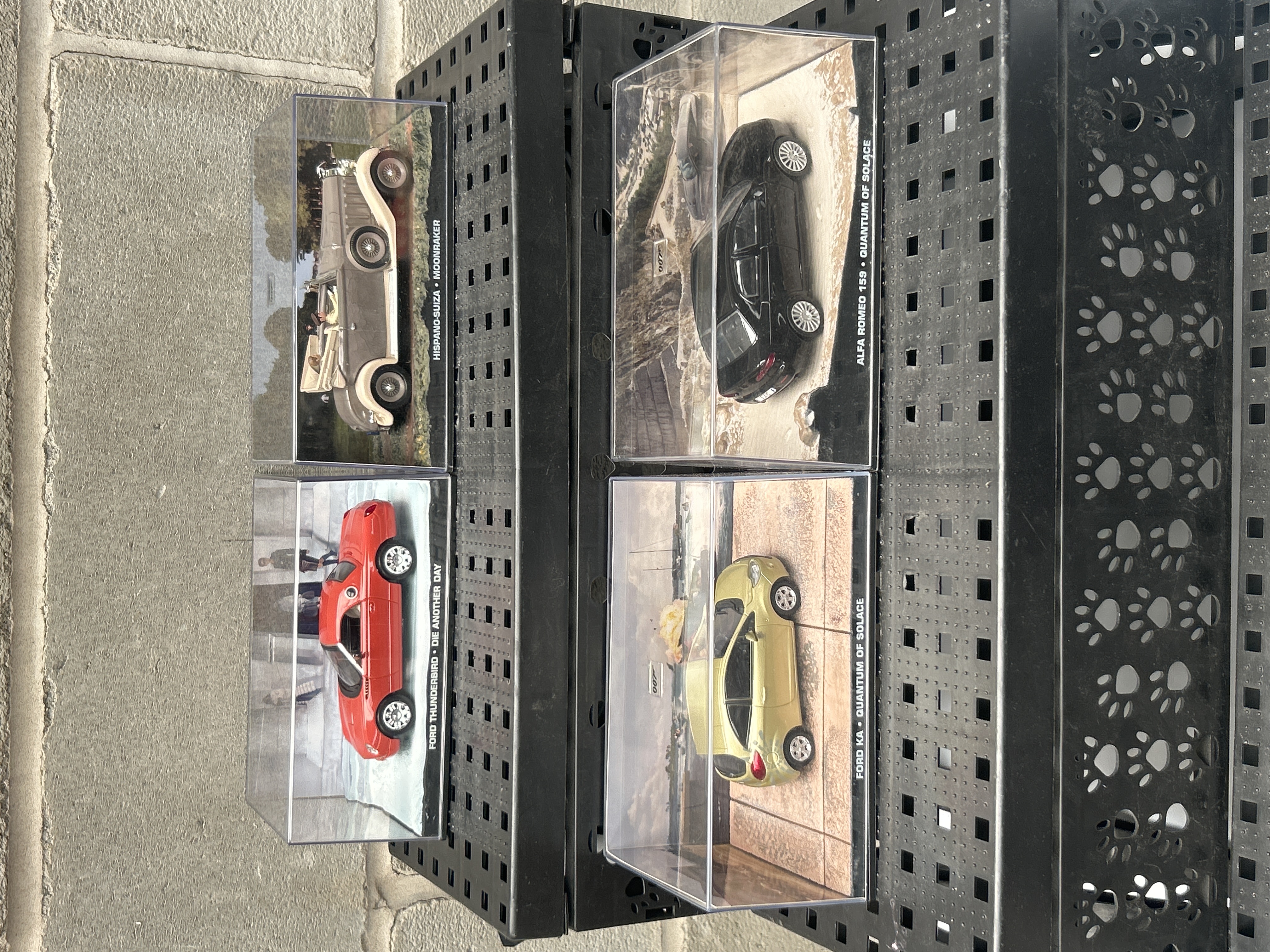 A group of Eaglemoss James Bond 1:43 die-cast model cars from The Official James Bond Die-Cast Collection. The group comprises four models, each presented in a clear plastic display case with a black base and a printed diorama background. The models include a red Ford Thunderbird from “DIE ANOTHER DAY,” a beige/brown Hispano-Suiza from “MOONRAKER,” a gold Ford Ka from “QUANTUM OF SOLACE,” and a black Alfa Romeo 159 also from “QUANTUM OF SOLACE.” Each display case prominently features the “007” logo, with the two cases for the “QUANTUM OF SOLACE” models additionally displaying the film title in English and German (“EIN QUANTUM TROST”).