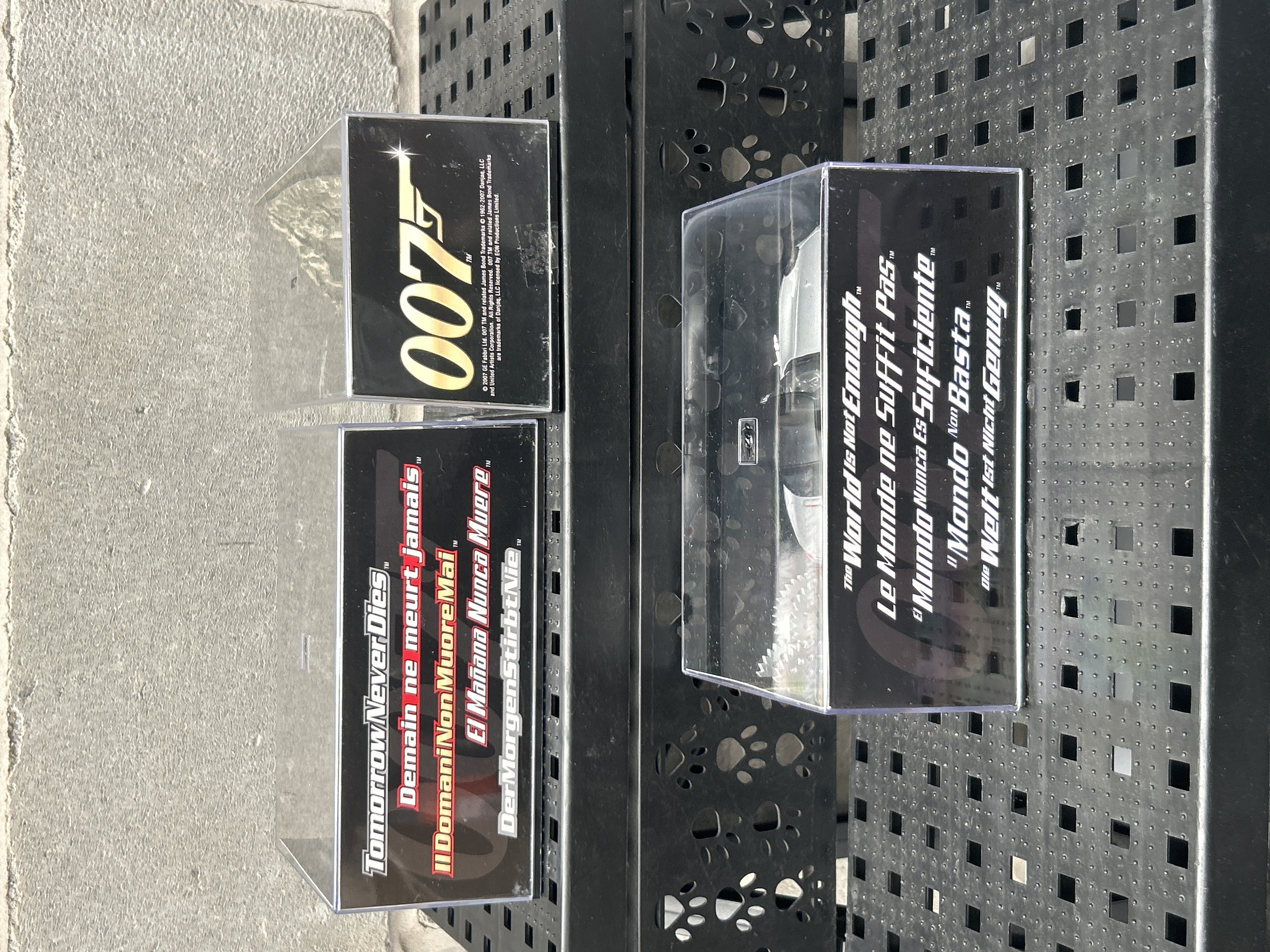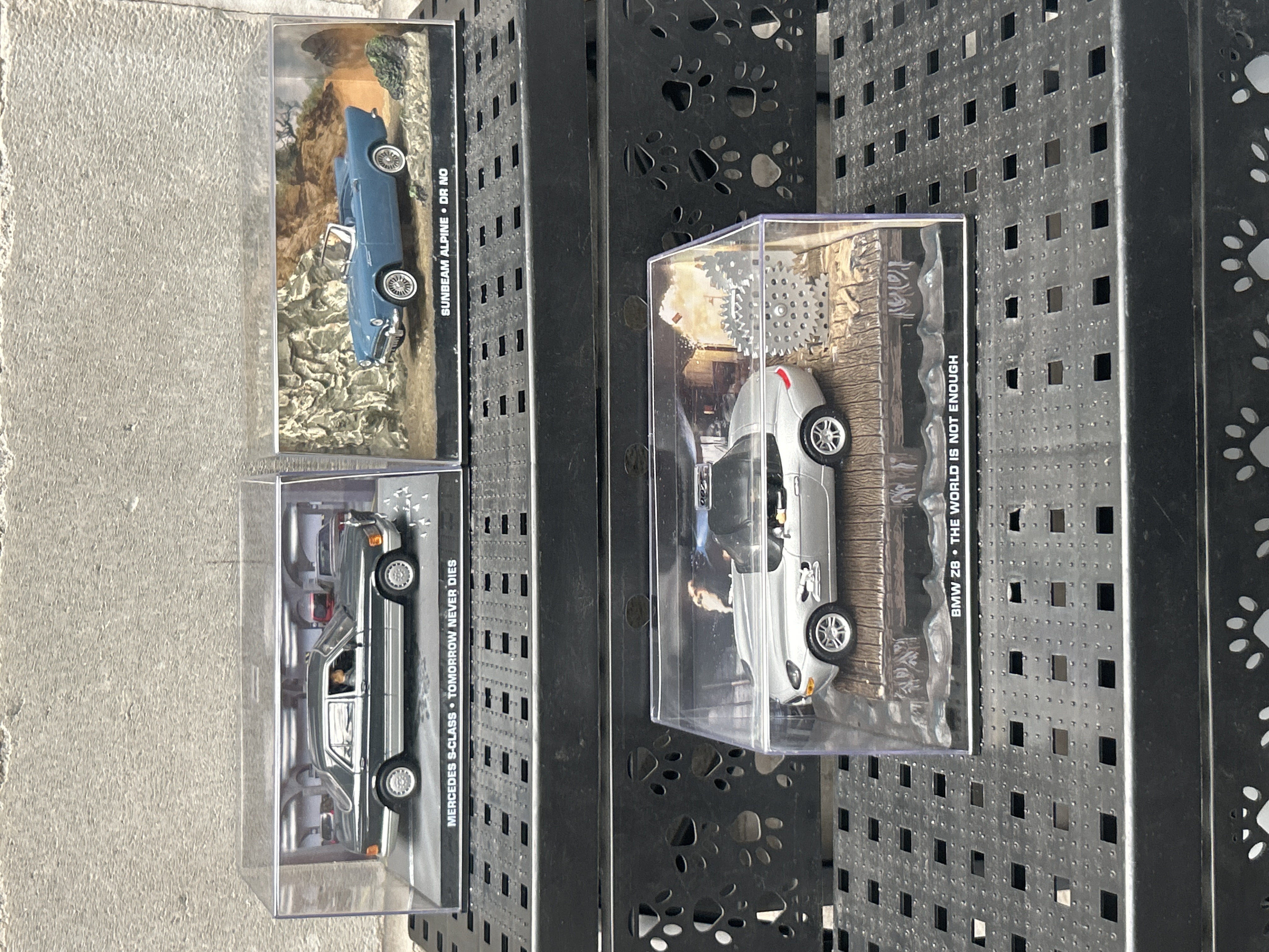 A collection of three Eaglemoss James Bond 1:43 die-cast model cars, each presented in a clear plastic display case with a thematic diorama base. The lot includes a dark grey Mercedes S-Class from “Tomorrow Never Dies,” a light blue Sunbeam Alpine from “Dr. No,” and a silver BMW Z8 from “The World Is Not Enough.” Each display case is marked with the 007™ logo and multilingual film titles, including French, Italian, Spanish, and German translations for “Tomorrow Never Dies” and “The World Is Not Enough.” The cars replicate vehicles spanning from the 1960s to the early 2000s.