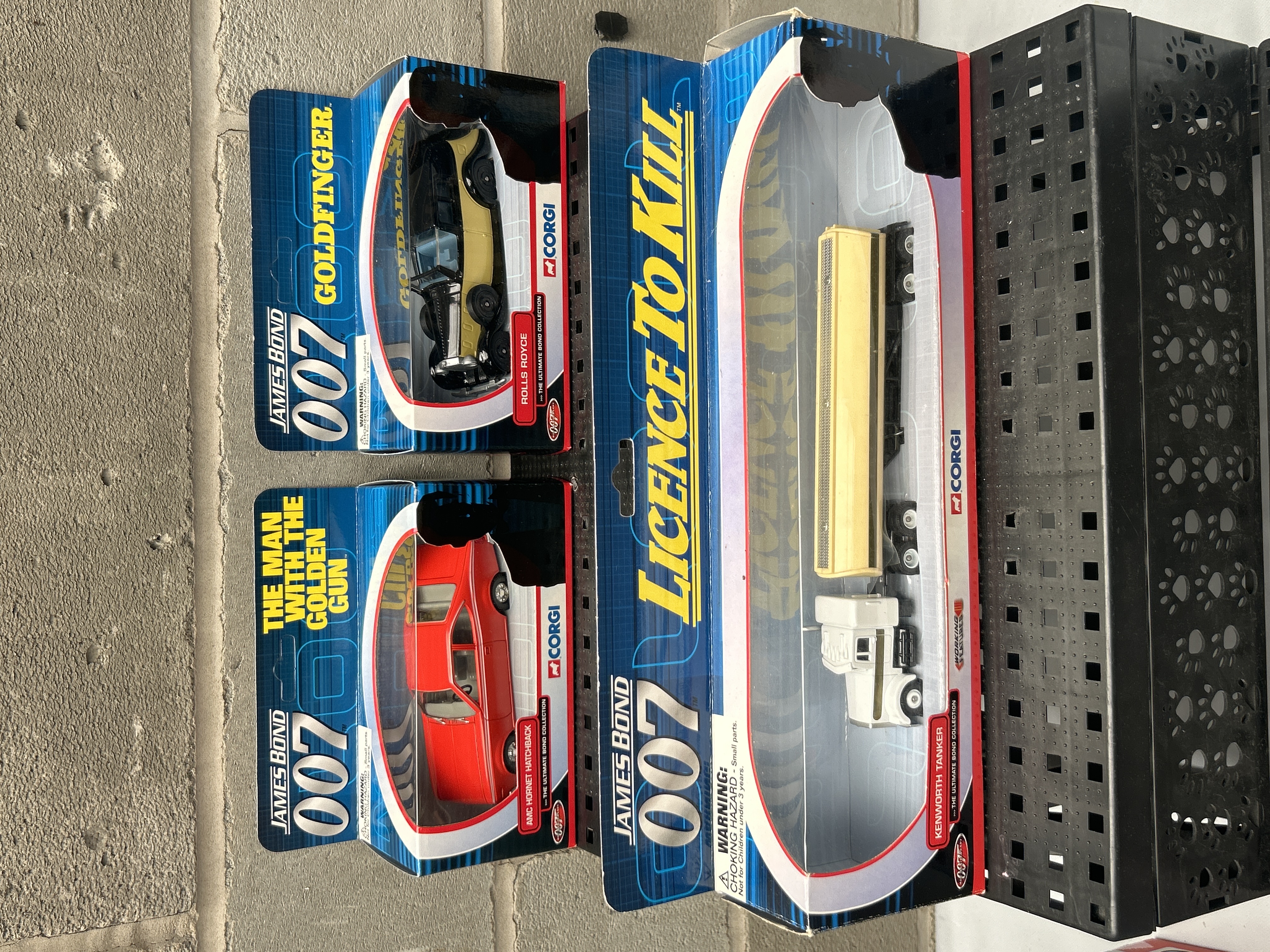 This lot comprises three Corgi ‘James Bond 007: The Ultimate Bond Collection’ die-cast model vehicles. Each model is presented new in its original cardboard and clear plastic window box packaging. The items include an AMC Hornet Hatchback from “The Man With The Golden Gun,” a Rolls Royce from “Goldfinger,” and a Kenworth Tanker from “Licence To Kill.” All packaging features prominent “JAMES BOND 007” and “CORGI” branding, alongside film titles and vehicle descriptions. Visible warning labels on the packaging indicate “CHOKING HAZARD – Small parts. Not for Children under 3 years.”