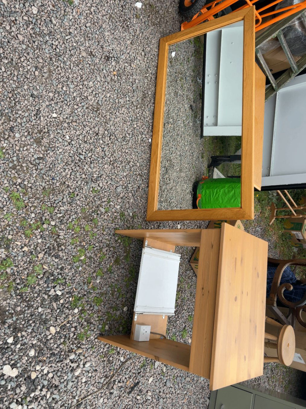 A contemporary rectangular mirror with a simple, light-toned pine frame, accompanied by a complementary light-toned pine console table. The table features a flat top surface and an open lower shelf. Both items present a clean, unadorned design consistent with a minimalist aesthetic, likely dating from the late 20th or early 21st century. Both the mirror frame and table are constructed from solid softwood, likely pine, exhibiting visible grain and knots. No discernible manufacturer’s marks or textual inscriptions are visible.
