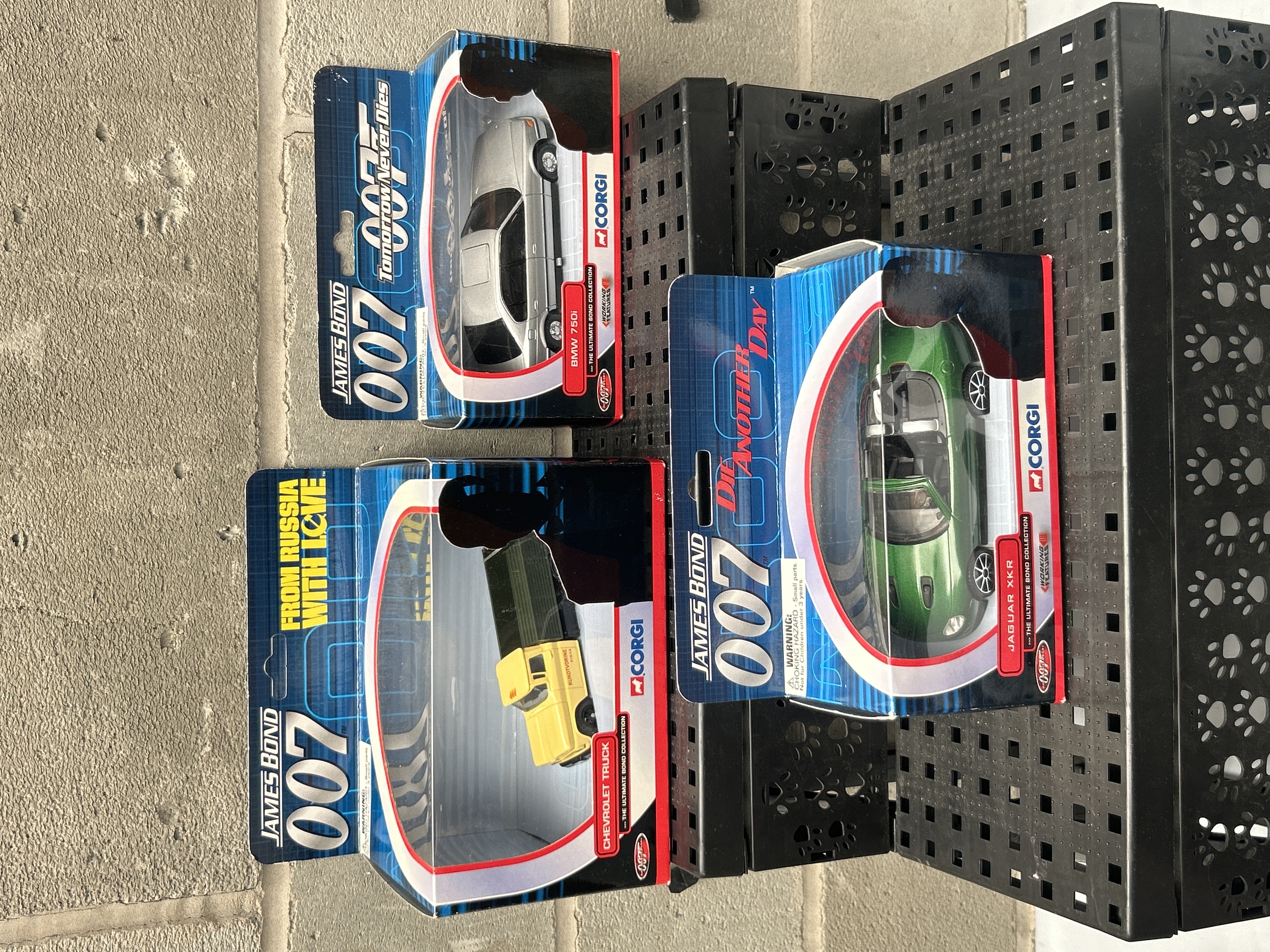 Three Corgi ‘James Bond 007 The Ultimate Bond Collection’ die-cast model vehicles. Each is sealed in its original cardboard and clear plastic window box packaging. The items include a yellow Chevrolet Truck, referencing *From Russia With Love* (1963), with the visible text “RUKOTVORINE PIKVA” on its side; a silver BMW 750i from *Tomorrow Never Dies* (1997); and a green Jaguar XKR from *Die Another Day* (2002). All models are constructed from metal and plastic.