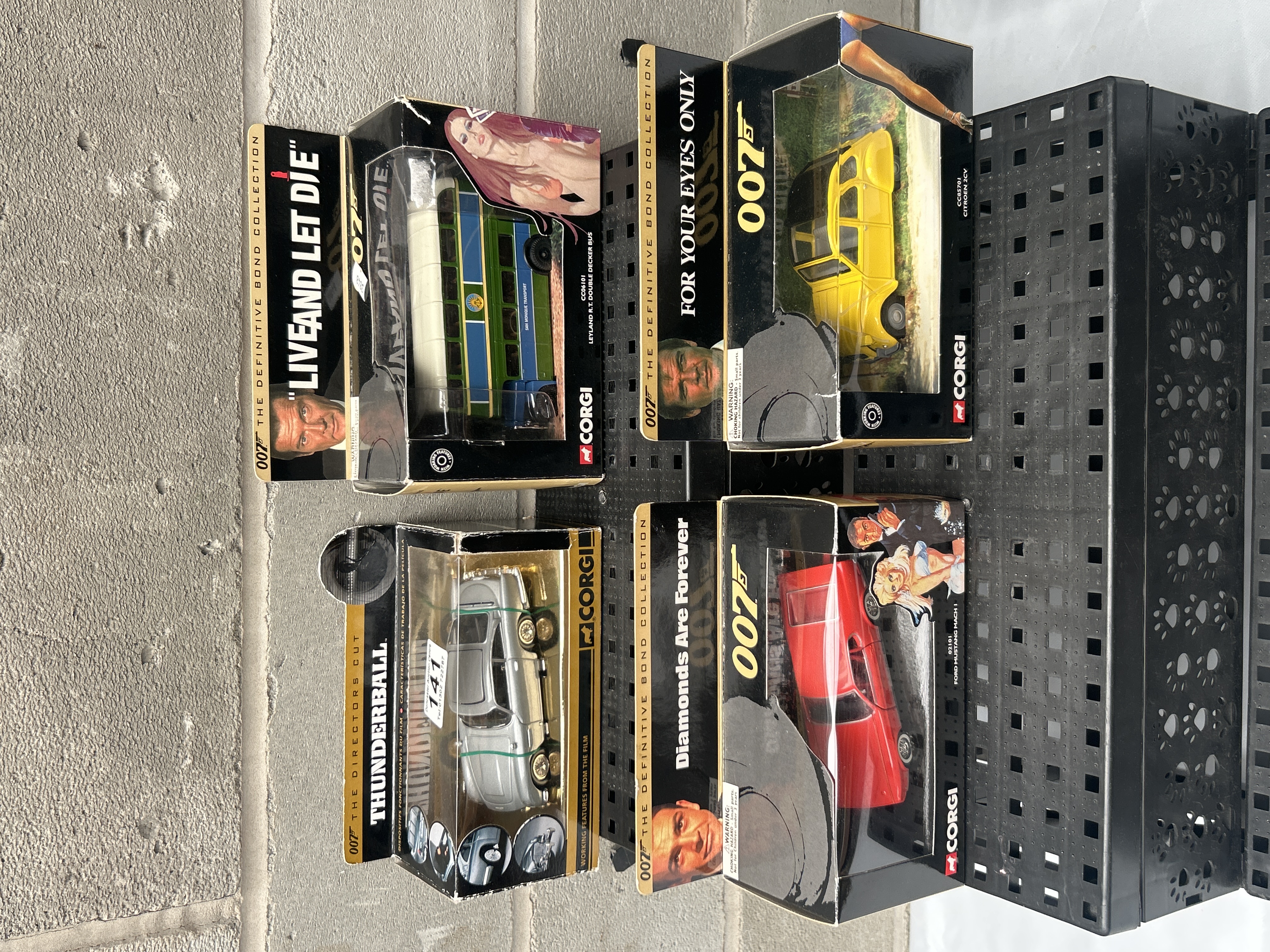 A group of Corgi James Bond 007 die-cast model vehicles, comprising four items, each housed in its original, sealed cardboard and plastic window box. The collection includes models primarily from the “007 The Definitive Bond Collection” and one from “007 The Directors Cut.” Specific vehicles include a silver vehicle for “Thunderball,” a blue and green Leyland RTL Double Decker Bus for “Live And Let Die,” a red Ford Mustang Mach I for “Diamonds Are Forever,” and a yellow Citroën 2CV for “For Your Eyes Only.” Each box features movie titles, “007” branding, character images (including Sean Connery and Roger Moore), and multilingual text such as “Working Features From The Film” (also “DISPOSITIFS FONCTIONNANTS DU FILM” and “CARACTERÍSTICAS DE TRABAJO DE LA PELÍCULA”). A “CHOKING HAZARD” warning is present on the packaging. A white sticker marked “Doncaster Auction Centre 141” is affixed to the “Thunderball” box.