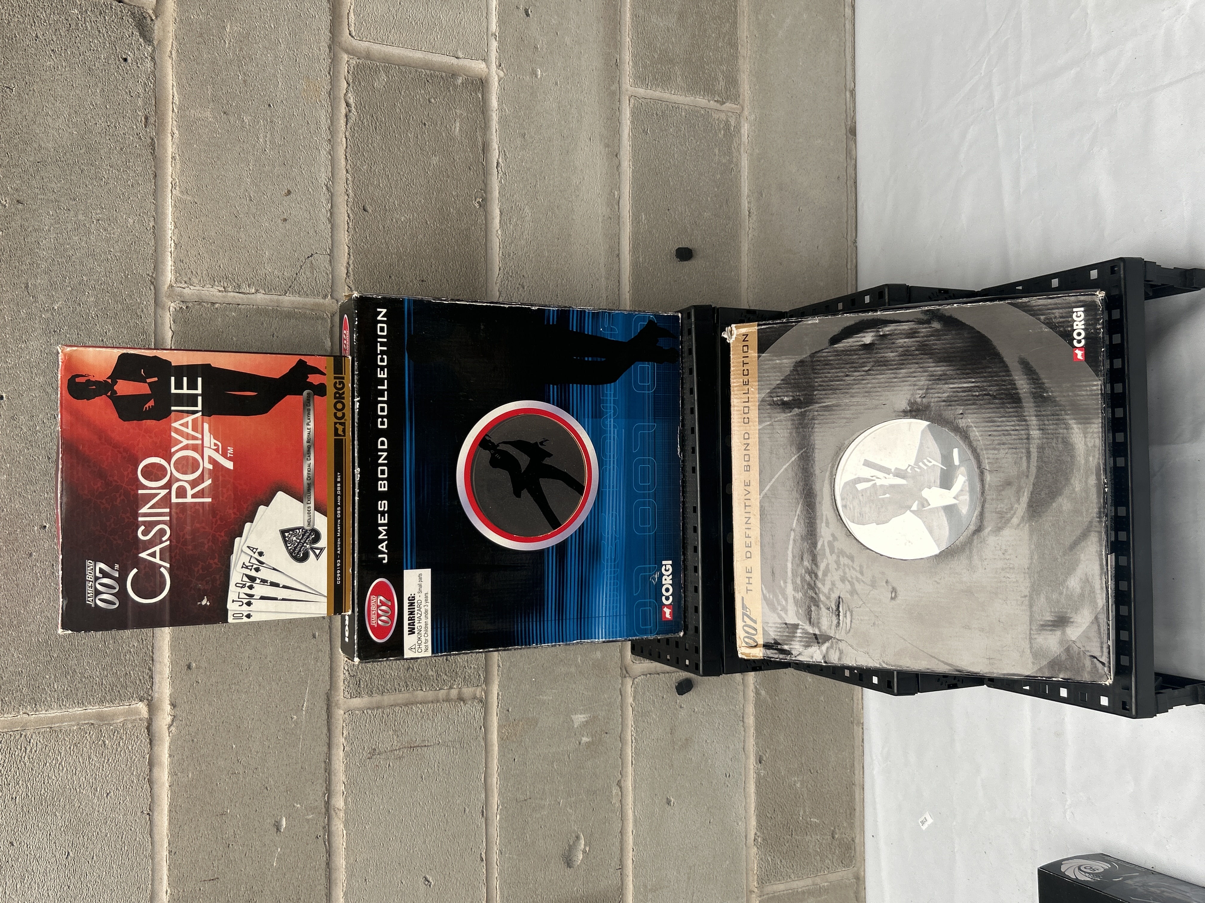 A group of three Corgi James Bond 007 Collection die-cast vehicle sets, dating from the late 20th or early 21st century. The uppermost item is a red-themed “Casino Royale” set (CC99193 – Aston Martin DBS and DB5 Set), presented in cardboard packaging featuring poker cards and a Bond silhouette. Below this is a “James Bond Collection” set housed in a dark blue and black cardboard box, displaying a gun barrel graphic and a visible “WARNING: CHOKING HAZARD” label. The bottom item is a large, flat “The Definitive Bond Collection” in a grayscale cardboard box, showcasing a circular emblem with a Bond silhouette, with a clear protective covering. All items are by Corgi and appear to be in their original, likely unopened, packaging.