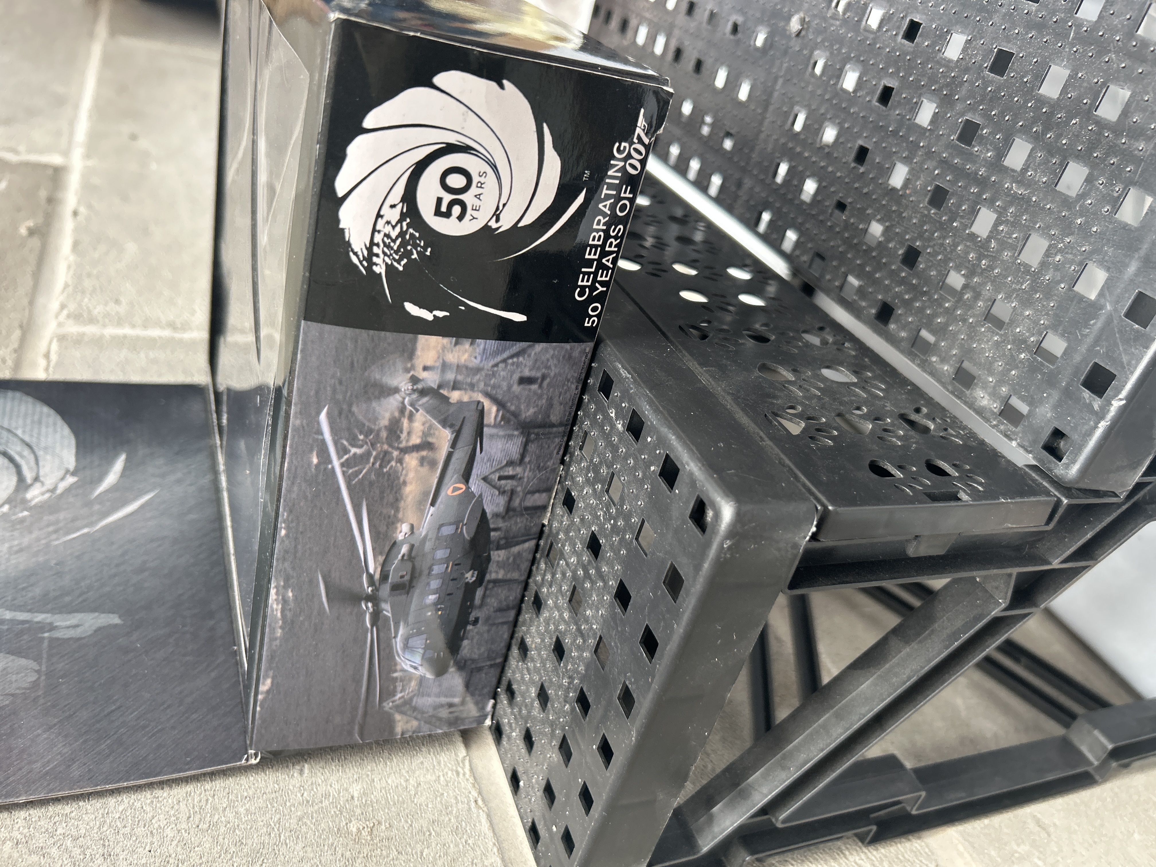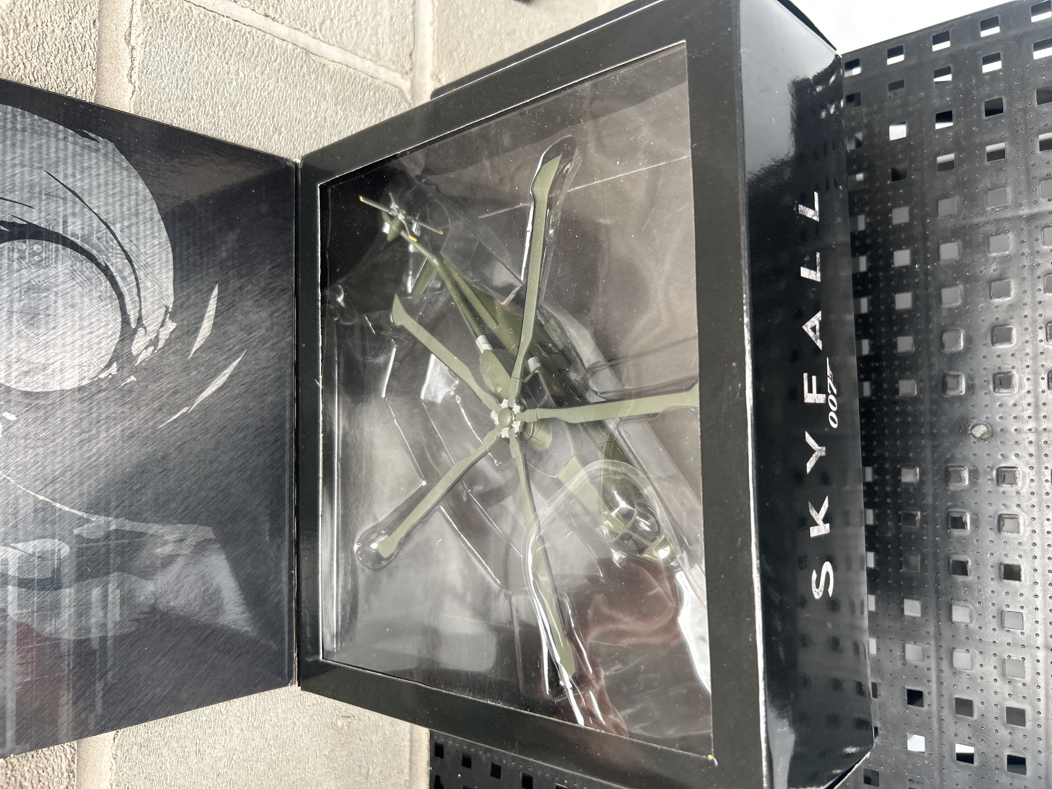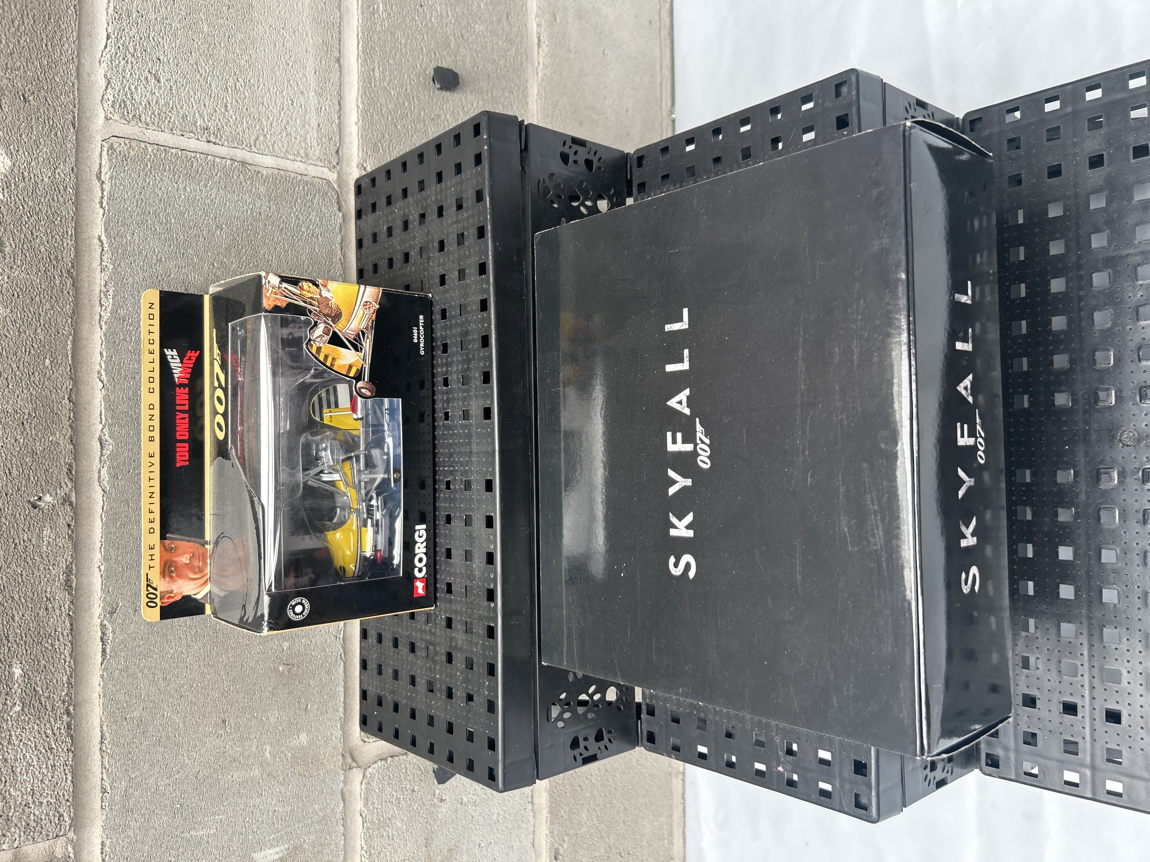 A JAMES BOND 007 SKYFALL AGUSTA WESTLAND HELICOPTER COLLECTABLE 1/100 SCALE MODEL, presented in its original black box, prominently labeled “SKYFALL 007” on multiple sides and additionally marked “CELEBRATING 50 YEARS OF 007” with a ’50 YEARS’ logo. The box contains an olive green/grey model helicopter with a multi-bladed rotor, securely presented in a clear plastic interior display. Accompanying this is a yellow Corgi die-cast gyrocopter, identified by packaging text as “007 THE DEFINITIVE BOND COLLECTION,” model “DBSB1 GYROCOPTER” from “YOU ONLY LIVE TWICE,” and features an image of Sean Connery. Both models are officially licensed and appear new in their original packaging.