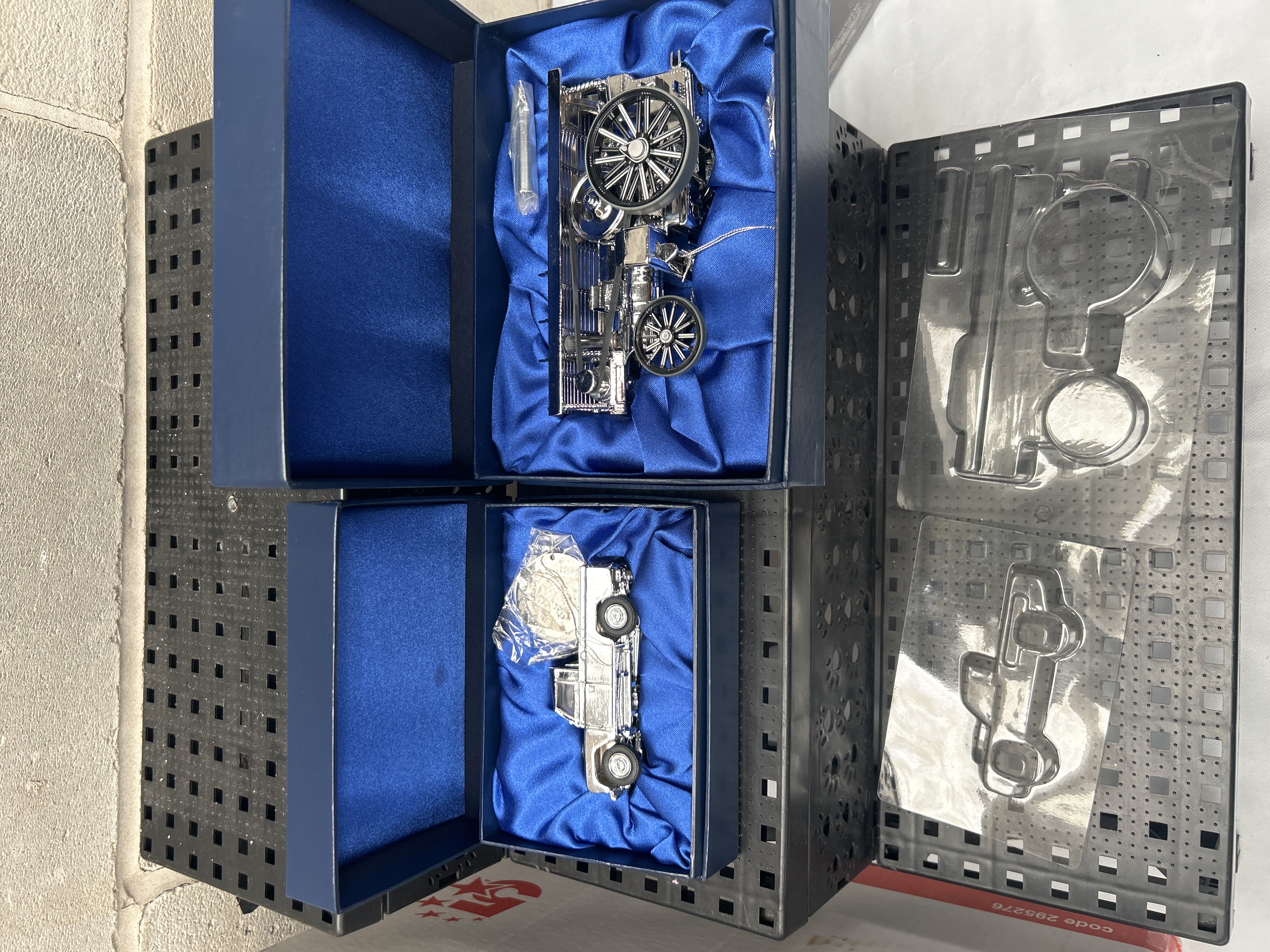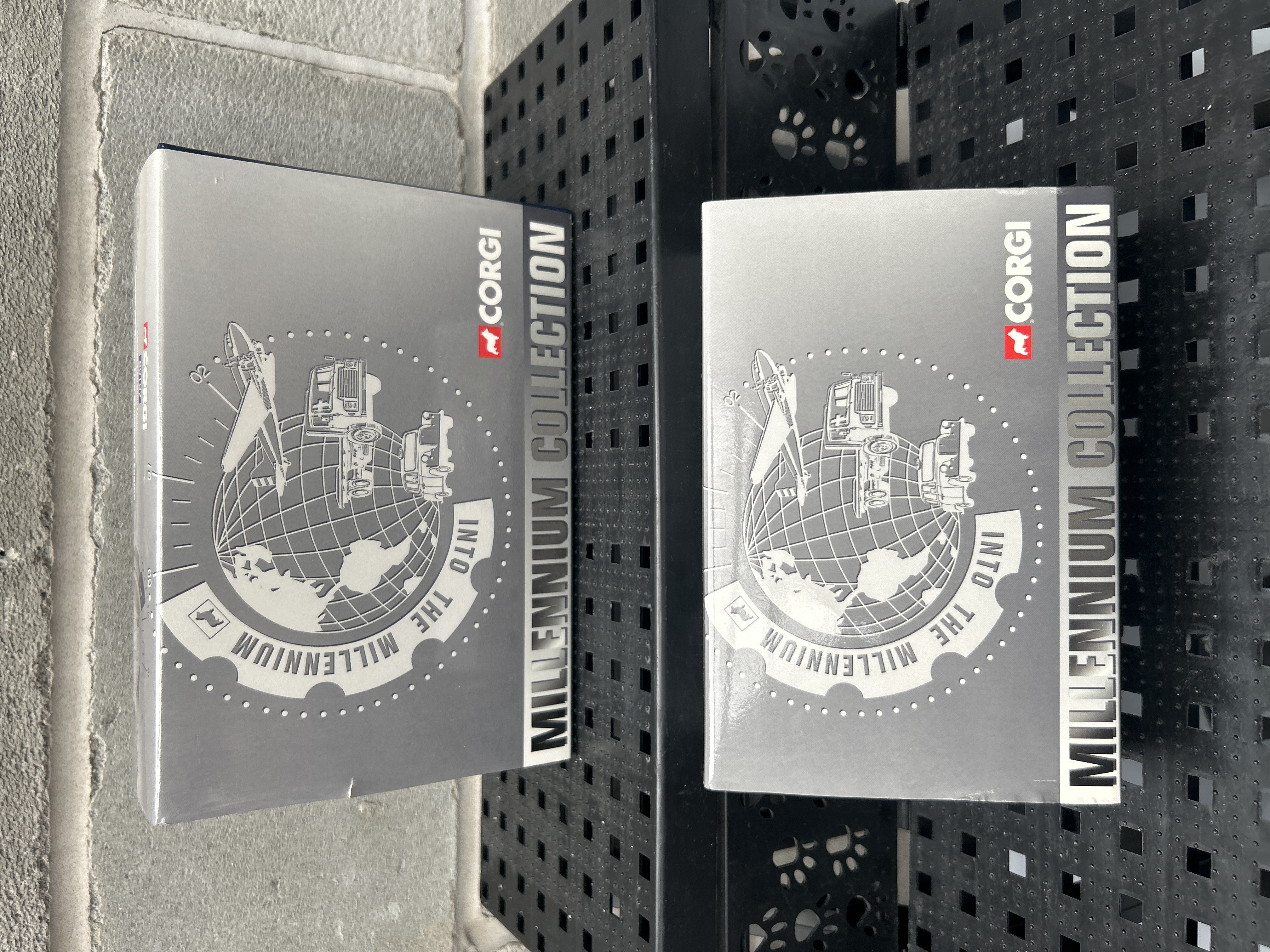 A pair of Corgi Millennium Collection die-cast models, comprising model 80107, a Fowler B6 Super Lion Showmans Engine (1:50 scale), and model 07105, a Land Rover (1:43 scale). Each model is presented in its original grey cardboard outer box, uniformly marked with the ‘CORGI’ brand logo and a central graphic of a globe encircled by the text ‘INTO THE MILLENNIUM’, with images of a plane, truck, and car. When opened, each box reveals a blue satin-lined interior housing a single polished silver-tone die-cast model. The Land Rover model depicts a classic-style utility vehicle, while the Showmans Engine is a detailed steam traction engine.