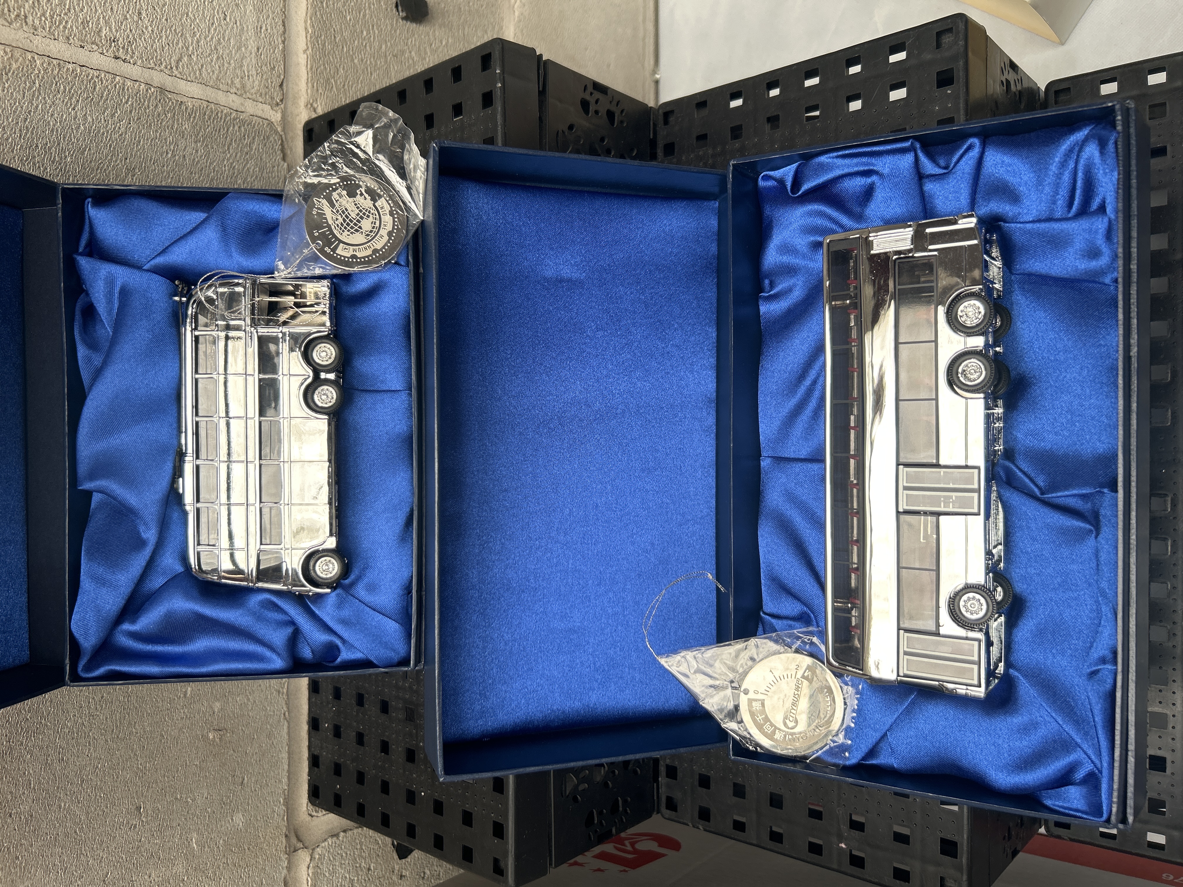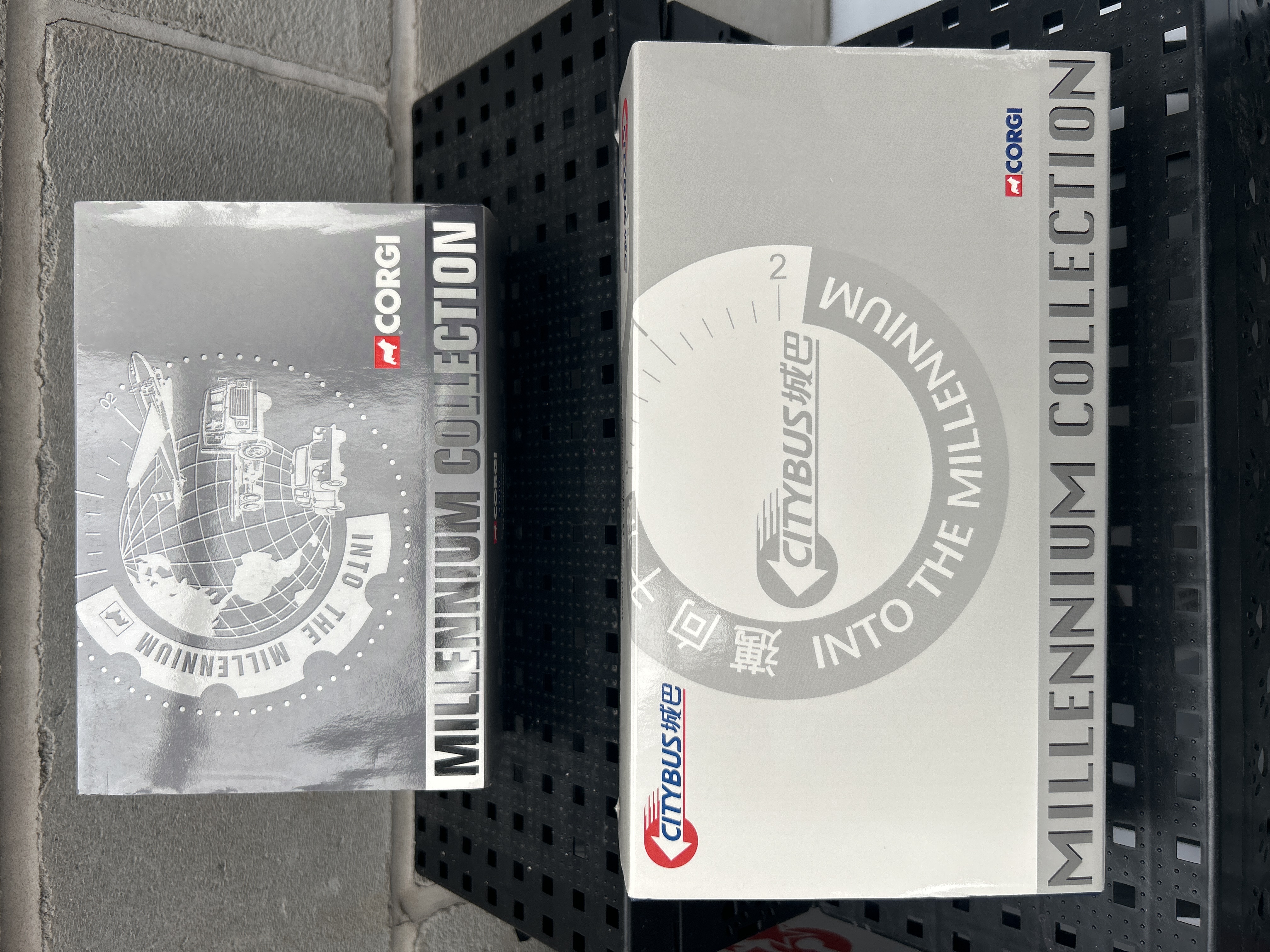 This lot comprises two Corgi Millennium Collection chrome-plated die-cast double-decker bus models, each presented in a dark blue satin-lined hard case. One model is identified as a Corgi Original Omnibus Company (OOC) 44508 Dennis Trident III, 1:76 scale, featuring Hong Kong Citybus livery with “Into the Millennium” and Chinese characters “回歸向” (Towards the Return/Handover) on its packaging. The other model, an older-style double-decker, is also part of the Millennium Collection and features a global motif with various vehicles and “Into the Millennium” branding on its packaging. Both sets include a circular medallion or coin, still sealed in a clear pouch, with designs consistent with the box art. The models exhibit bright, reflective finishes.