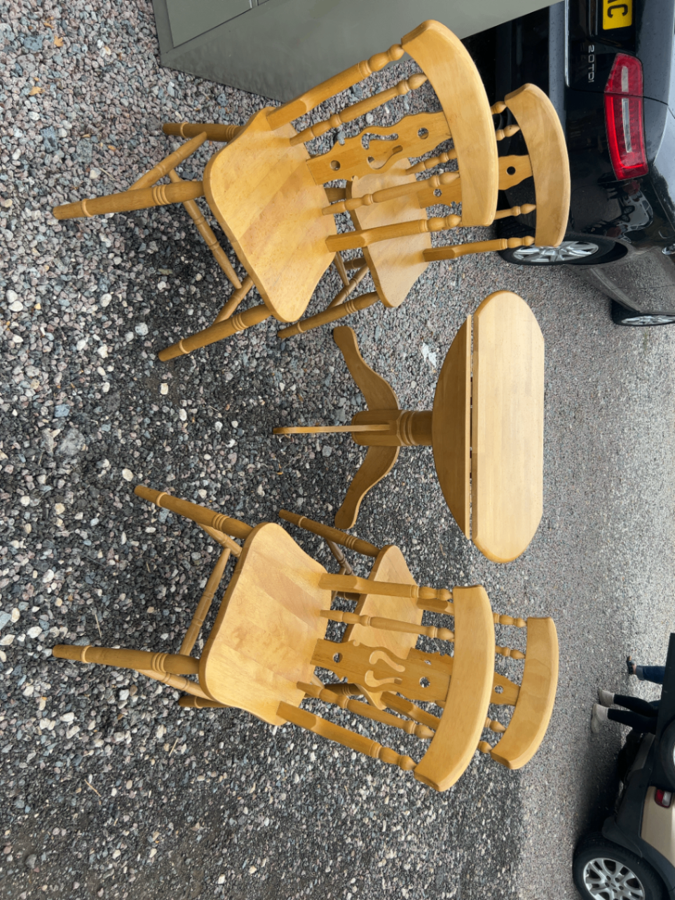 A three-piece Pine dining set, dating to the Late 20th Century, presented in a country or farmhouse style. The set comprises two spindle-back chairs, each featuring a carved central splat and turned legs. Accompanying the chairs is a matching drop-leaf table, supported by a turned pedestal base with splayed feet. All pieces are constructed from Pine with a clear or light-stained finish. No manufacturer’s marks or labels are visible.