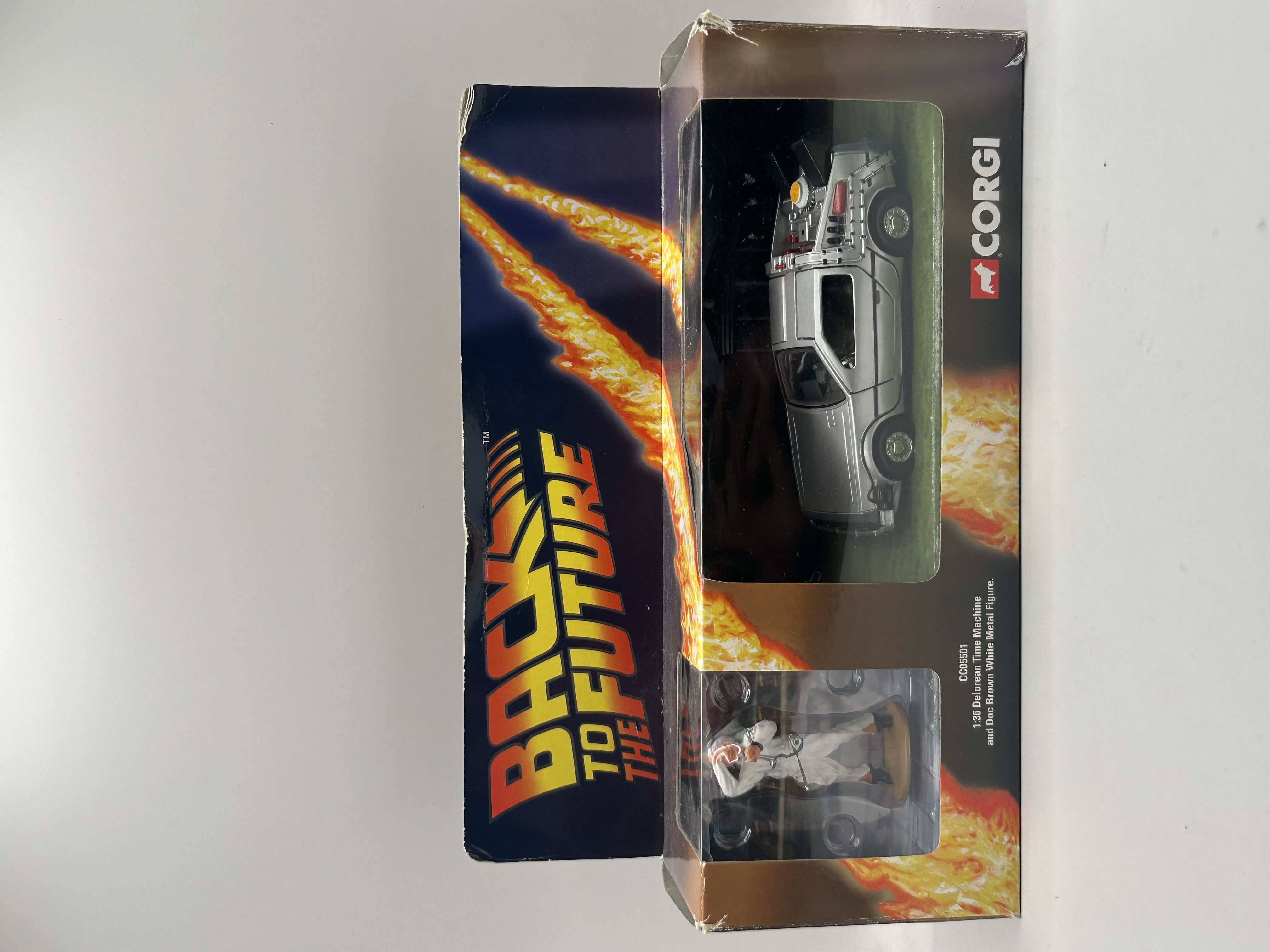 A Corgi collectible set, CC05501, themed after the “Back to the Future” movie franchise. The set comprises a 1:36 scale silver-colored die-cast model of the DeLorean Time Machine and a white metal figure of Doc Brown in a white hazmat suit. Both items appear to be new and are secured within their original internal plastic trays. The set is presented in its original cardboard box with a clear plastic window, prominently displaying the “BACK TO THE FUTURE™” logo and Corgi branding.
