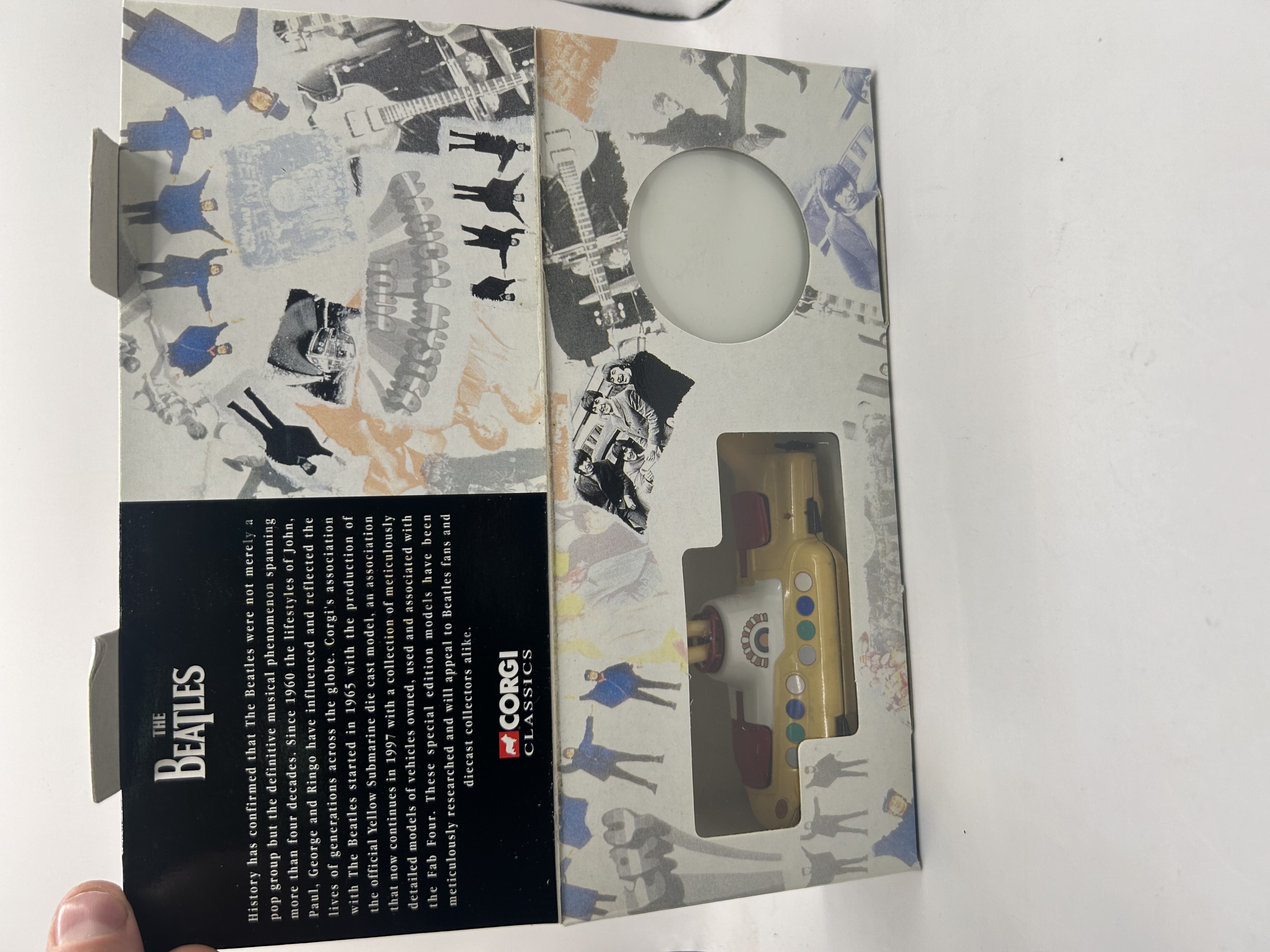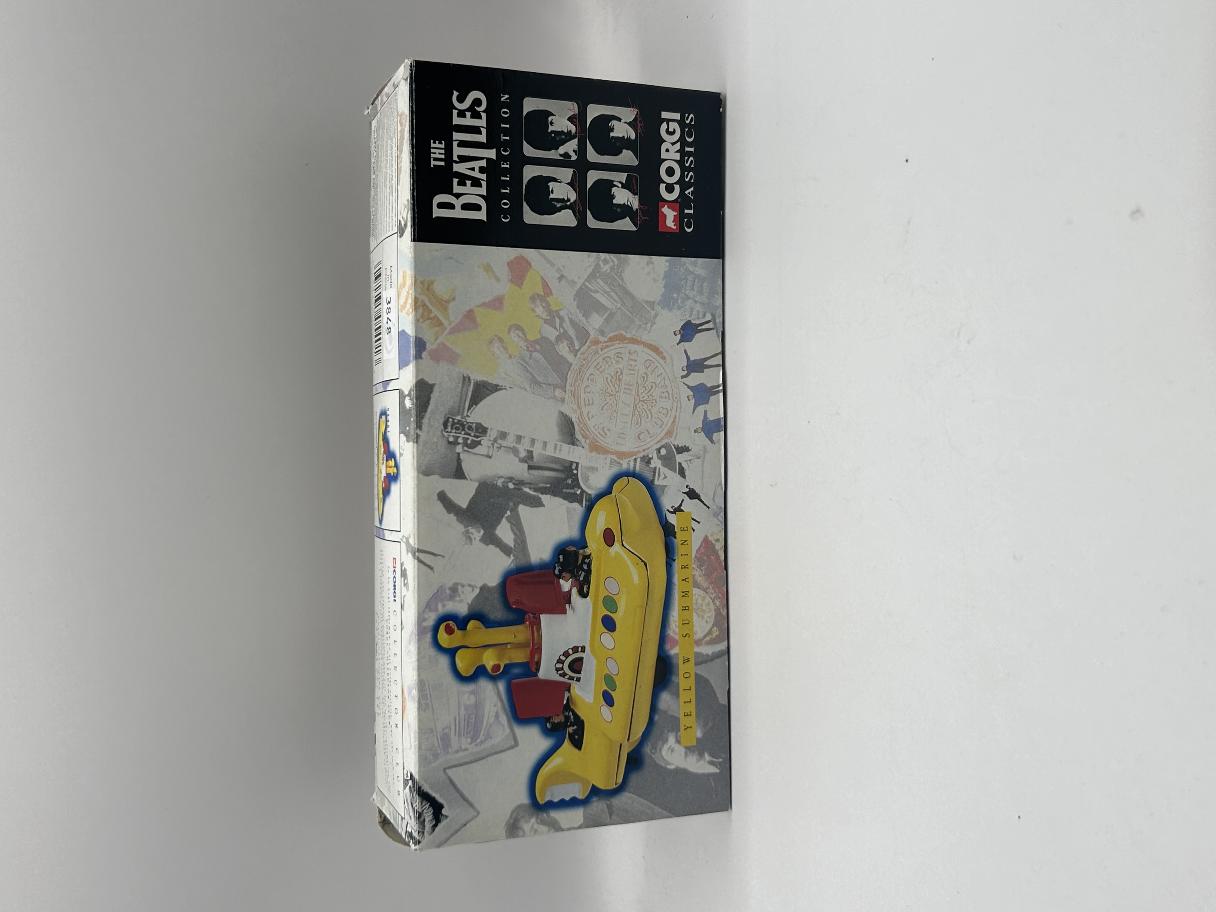 A Corgi Classics die-cast model of The Beatles’ Yellow Submarine, model number 05401, from The Beatles Collection, produced in 1997. The item is presented new in its original retail packaging. The yellow metal submarine model features multi-colored accents and partially visible ‘YELLOW SUBMARINE’ text, visible through a clear plastic window. The cardboard box is branded ‘THE BEATLES COLLECTION’ and ‘CORGI CLASSICS,’ displaying iconic imagery of The Beatles and the submarine. Text on the packaging indicates Corgi’s association with The Beatles began in 1995 and continued into 1997 for this official die-cast model.