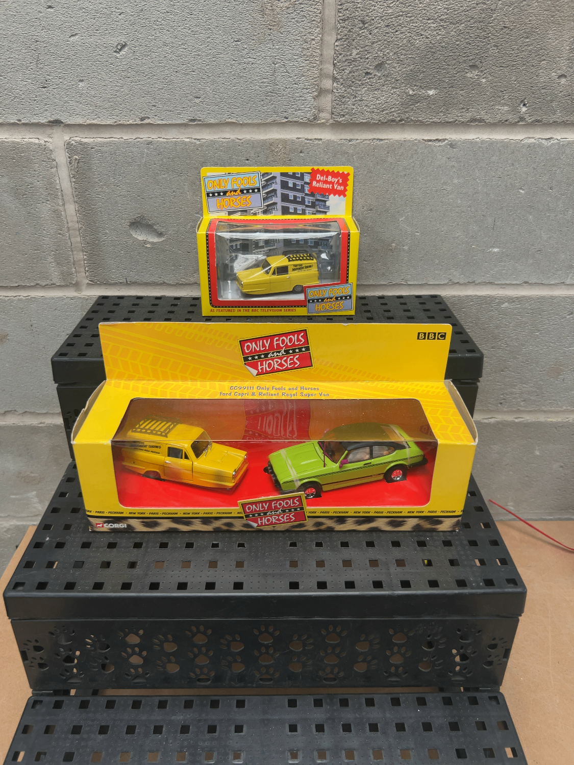 Two Corgi ‘Only Fools and Horses’ die-cast model vehicle sets. The first set, marked ‘CC99111’, features a yellow Reliant Regal Supervan III and a green Ford Capri. It is presented in its original yellow and red branded cardboard and clear plastic packaging. The second set contains a single yellow Reliant Regal Supervan III, identifiable as ‘Del-Boy’s Reliant Van’ with ‘Trotters Independent Traders’ branding, housed in yellow and red packaging. Both sets commemorate the popular BBC television series ‘Only Fools and Horses’.