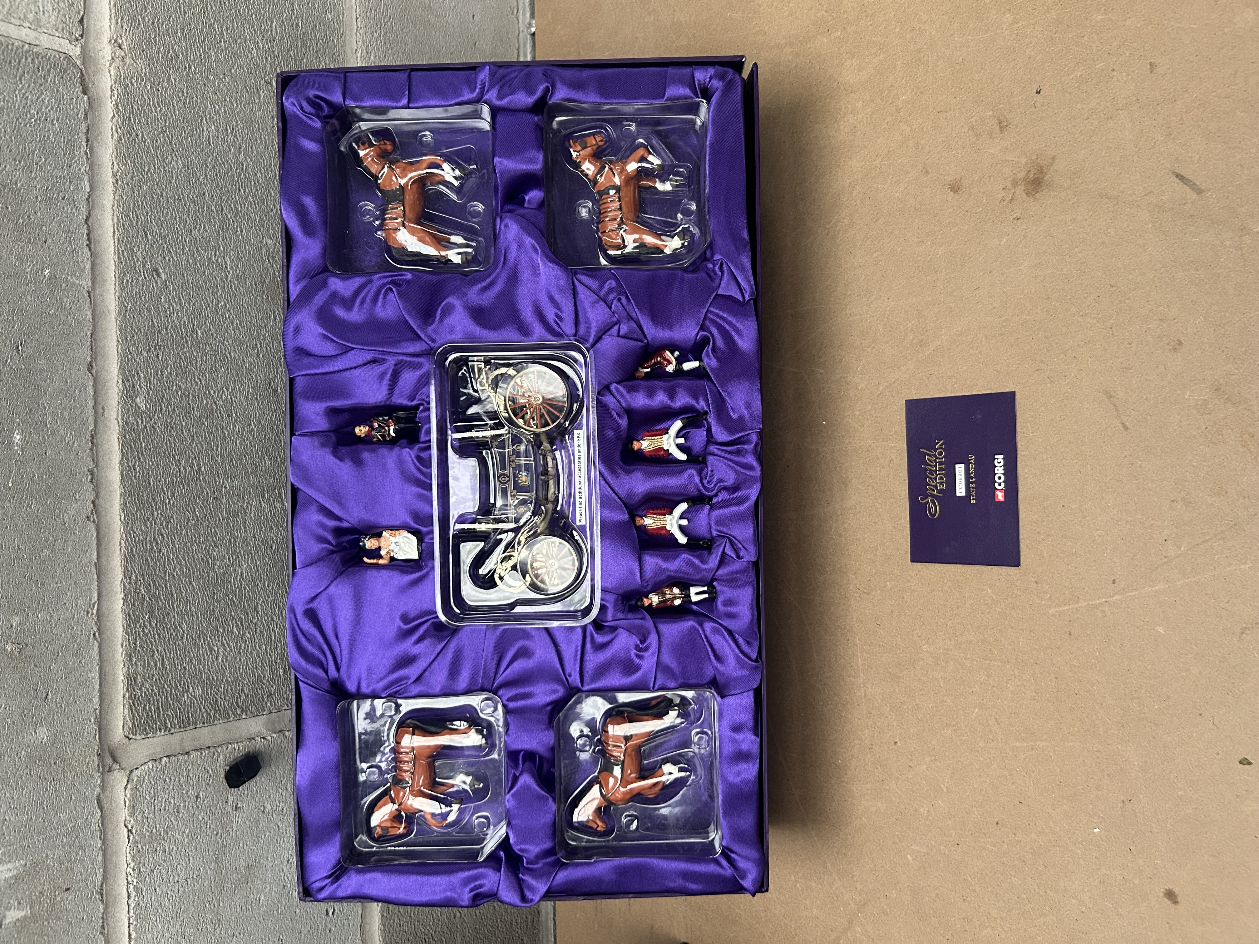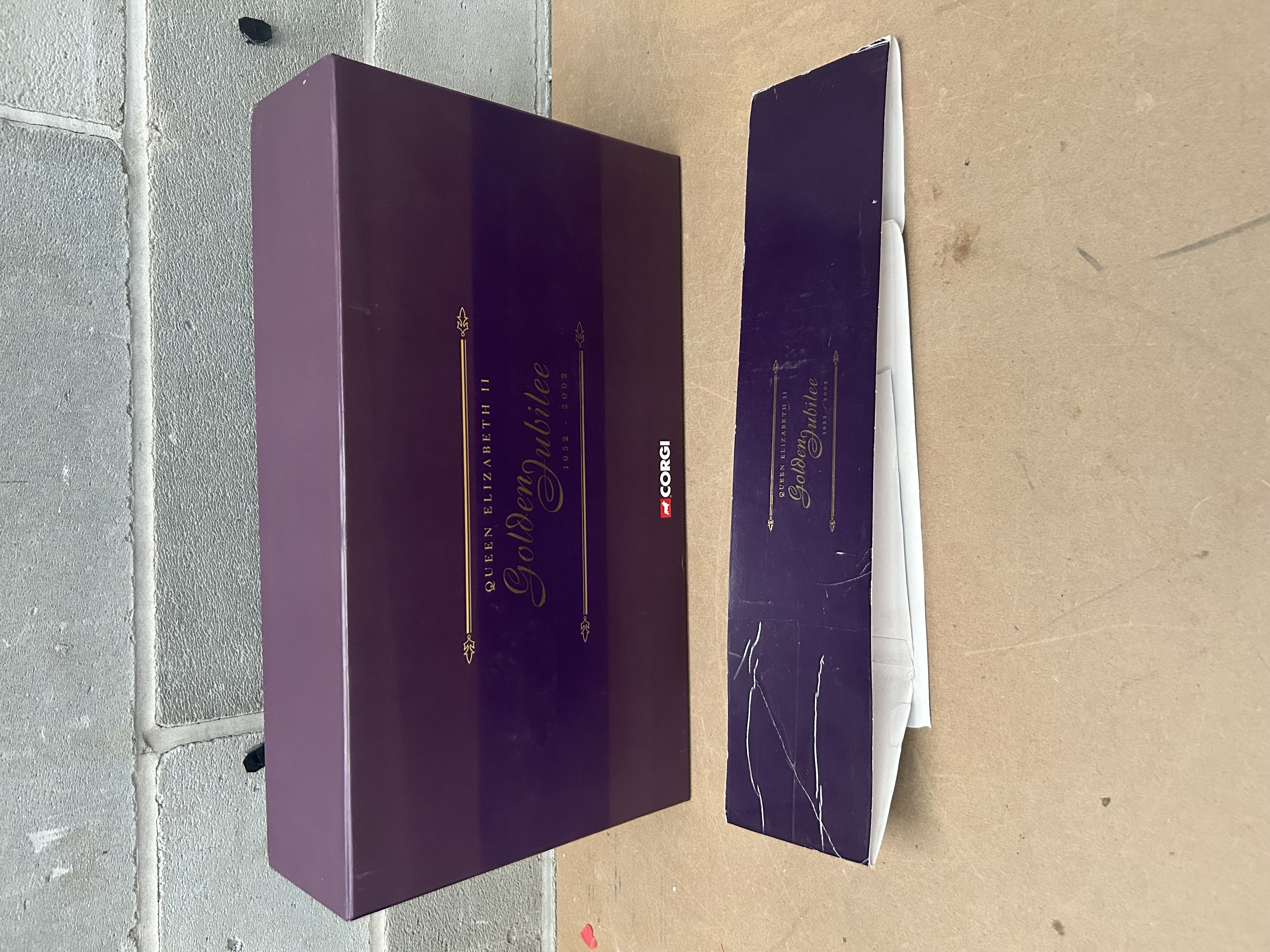 A Corgi ‘Special Edition’ boxed collector’s set, commemorating Queen Elizabeth II’s Golden Jubilee from 1952 to 2002. The deep purple cardboard box is marked “QUEEN ELIZABETH II Golden Jubilee 1952 – 2002” and bears the “CORGI” logo. Inside, the set features a highly-detailed die-cast metal model of a ceremonial State Landau coach, accompanied by four horses and six human figures in ceremonial attire, all meticulously arranged within a purple satin-lined interior.