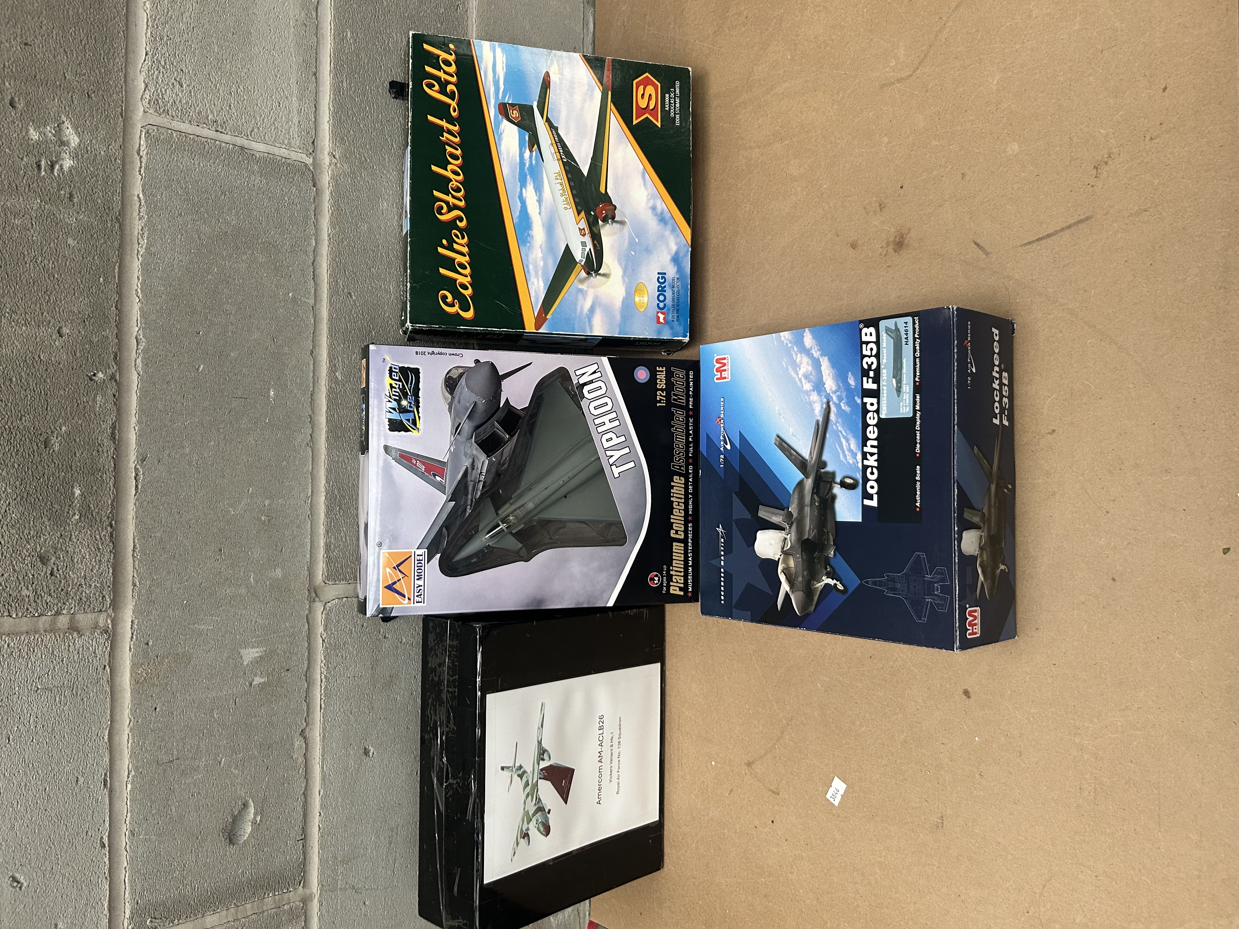 This lot comprises a collection of four boxed, pre-assembled scale model aircraft, predominantly 1:72 scale. The collection includes an Easy Models Platinum Eurofighter Typhoon RAF 100, PKEA33300, 1:72 Scale, described as a ‘Full Plastic, Platinum Collectible Assembled Model’ from 2018. Also included are an Amercom AM-ACLB26 Vickers Valiant B Mk.1, a Corgi ‘Limited Edition’ Douglas DC-3 in ‘Eddie Stobart Ltd.’ livery, and an HM (Hobby Master) ‘Air-Power Series’ Lockheed F-35B, described as a ‘Die-cast Display Model’. All models are in their original packaging, which appears to be factory-sealed or otherwise unopened. No models are visible outside their boxes.