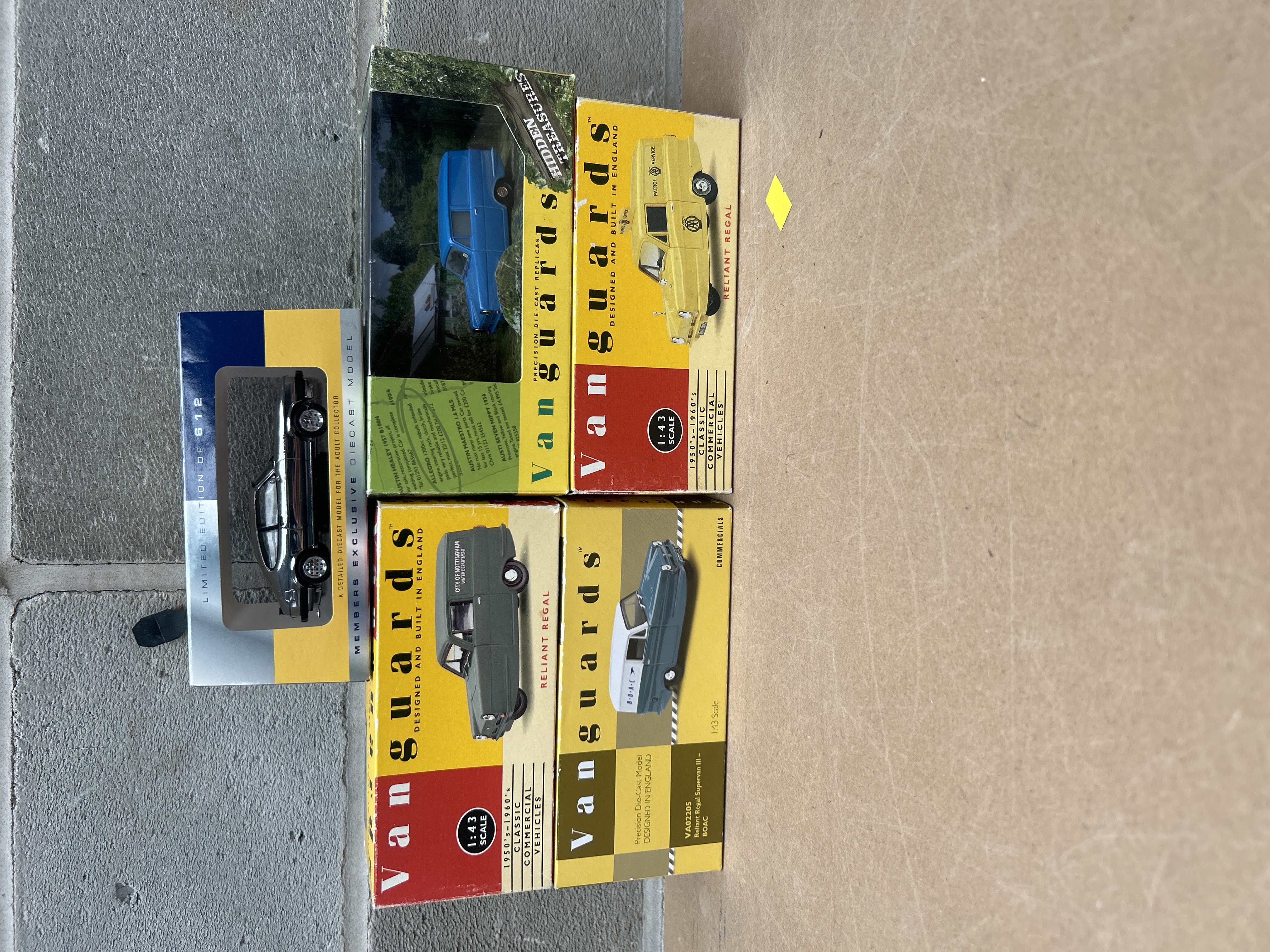 A group of five diecast model vehicles. The lot comprises four Vanguards 1:43 scale ‘1950’s-1960’s Classic Commercial Vehicles’ of ‘Reliant Regal’ vans. These include a grey van marked ‘City of Nottingham Water Department,’ a blue van from the ‘Hidden Treasures’ sub-series, a blue and white ‘VA02205 Reliant Regal Supervan III – BOAC,’ and a yellow ‘PATROL AA SERVICE’ van. One Vanguards box features a green label with visible English text detailing various vintage car classified advertisements. The lot also includes a dark grey coupe, identified as a ‘LIMITED EDITION OF 612’ and a ‘MEMBERS EXCLUSIVE DIECAST MODEL FOR THE ADULT COLLECTOR.’ All models are packaged in their original, factory-sealed boxes.