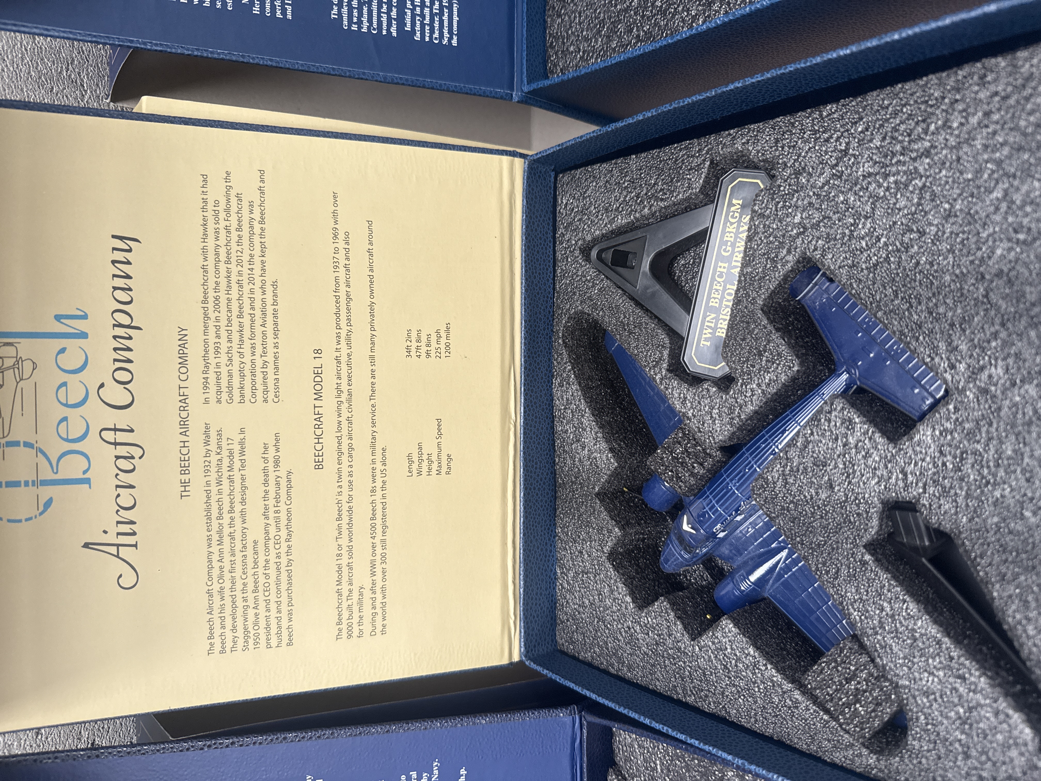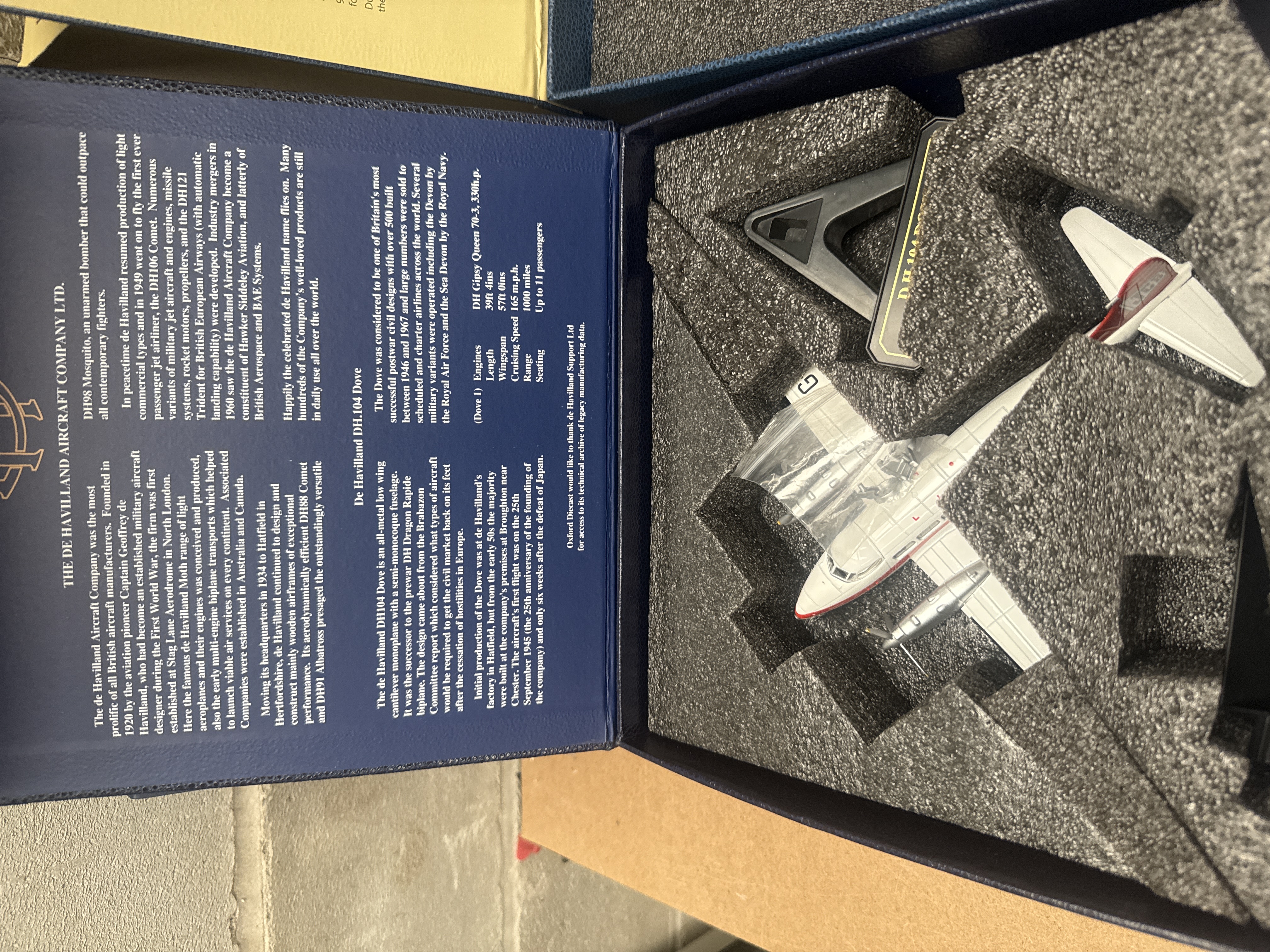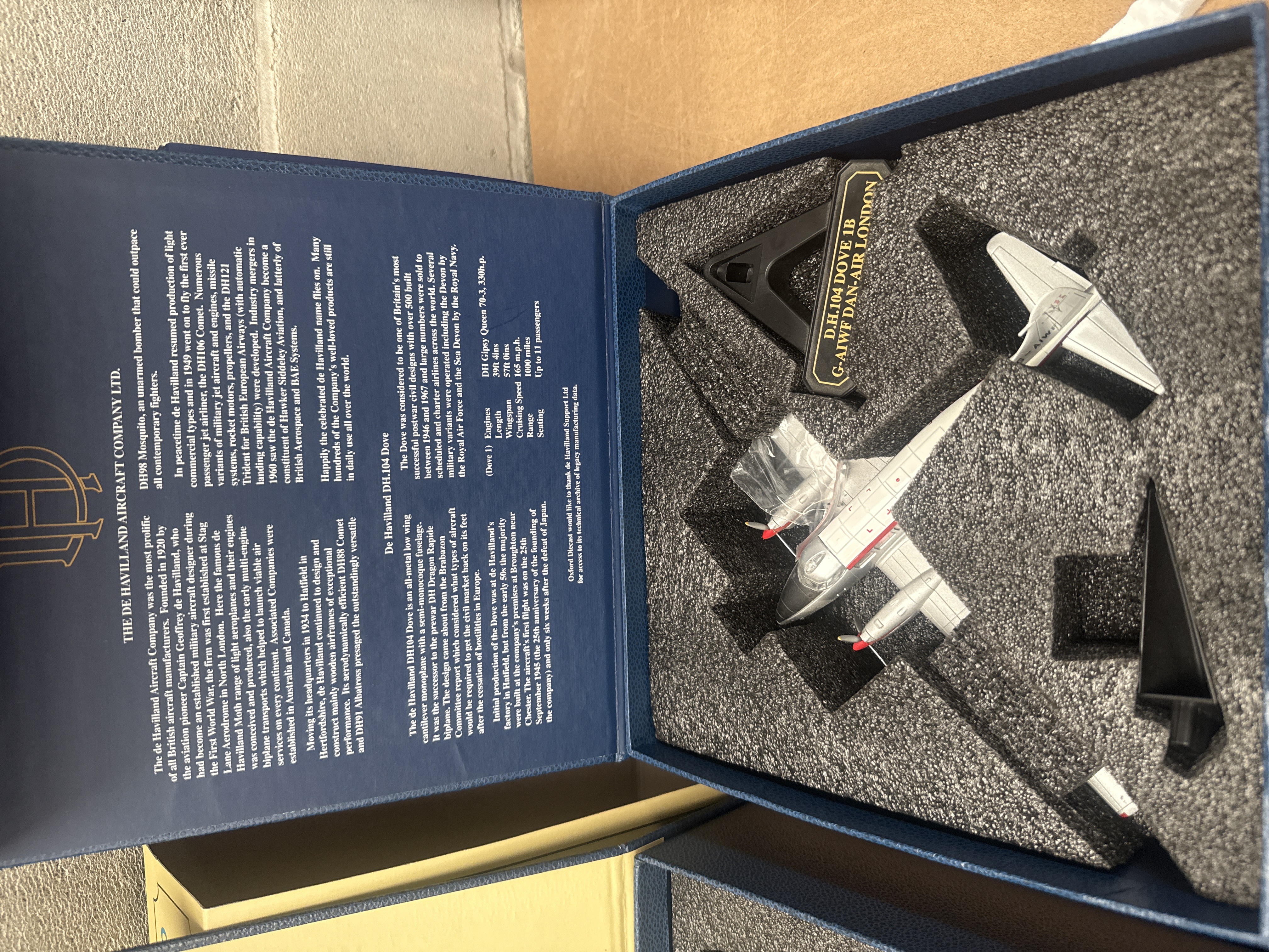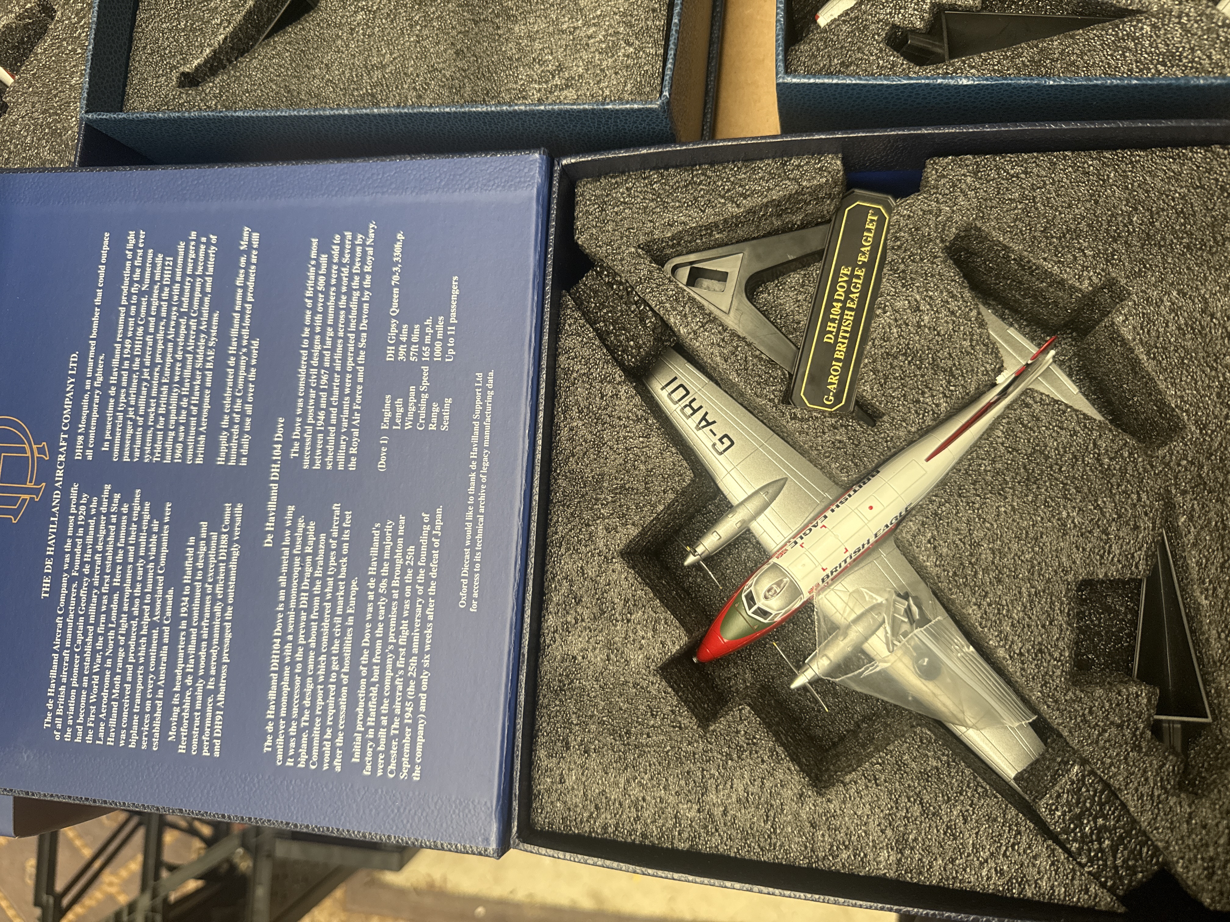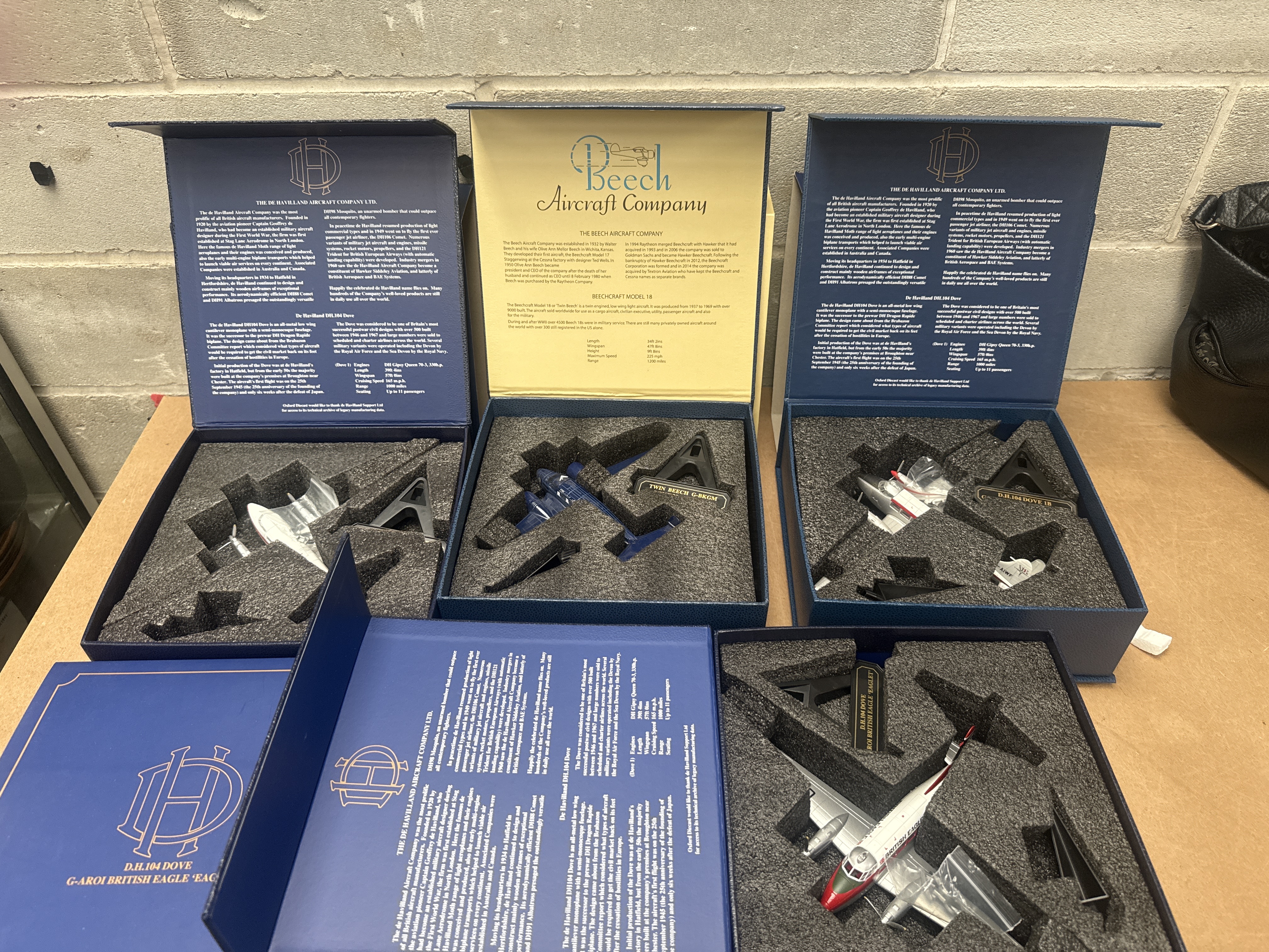 A group of four individually boxed collector’s edition scale model aircraft sets by Oxford Diecast, dating from the late 20th or early 21st century. Each set comprises a die-cast aircraft model and a black display stand, secured within a custom-cut black foam insert. Three sets are presented in blue cardboard boxes with gold foil text, featuring “THE DE HAVILLAND AIRCRAFT COMPANY LTD.” on the lid. These include two De Havilland DH.104 Doves: one with registration G-AROI in British Eagle ‘Eaglet’ livery, and another G-AIWF in Dan-Air London livery. The fourth set is in a cream-colored box with green text, marked “Beech Aircraft Company,” containing a dark blue Twin Beech (Beechcraft Model 18) with registration G-BRGM in Bristol Airways livery. The interior lids of all boxes display extensive historical information in English about the specific aircraft model and its manufacturer. Each model’s display stand is clearly marked with its aircraft type, registration, and operator.