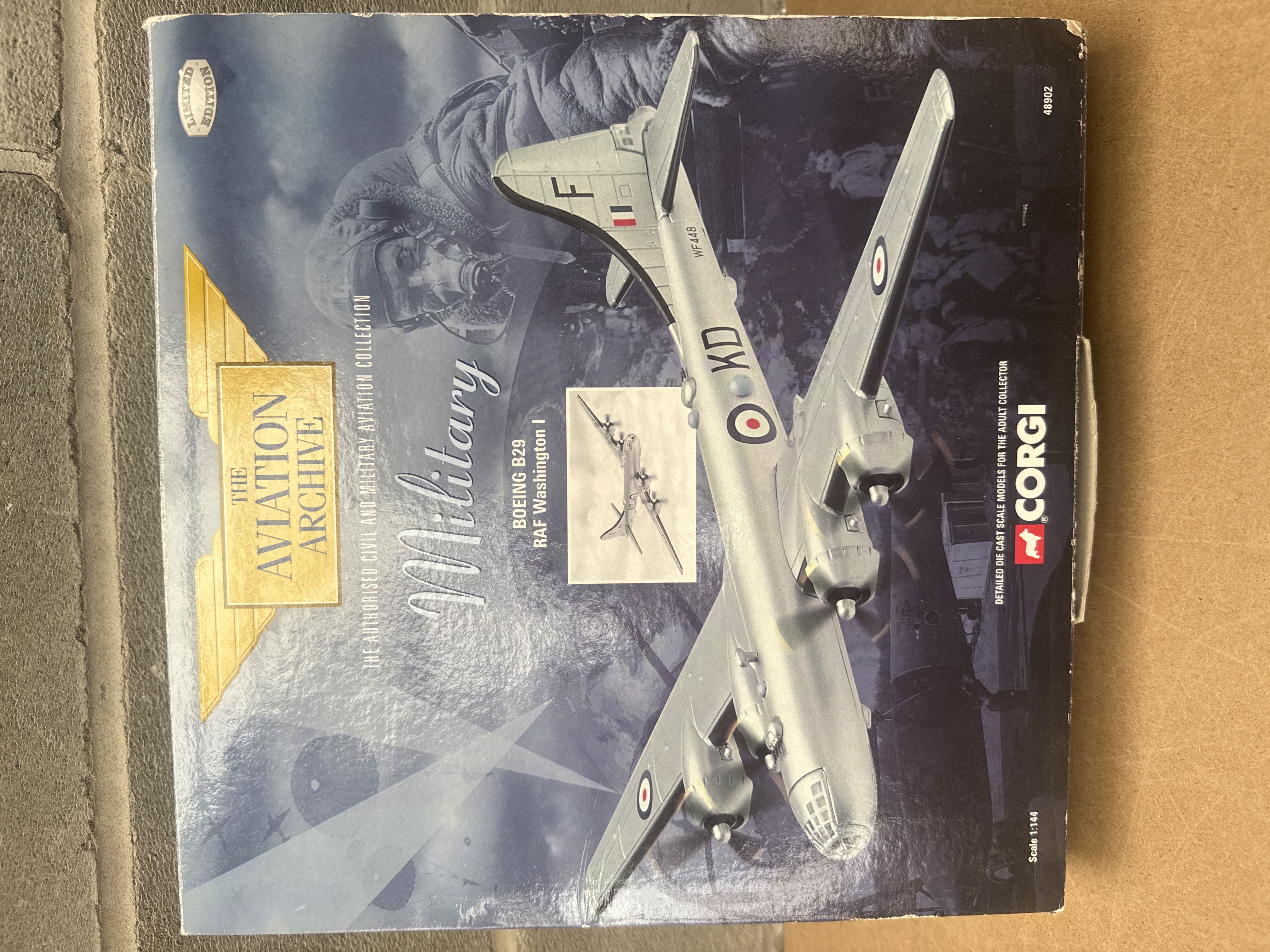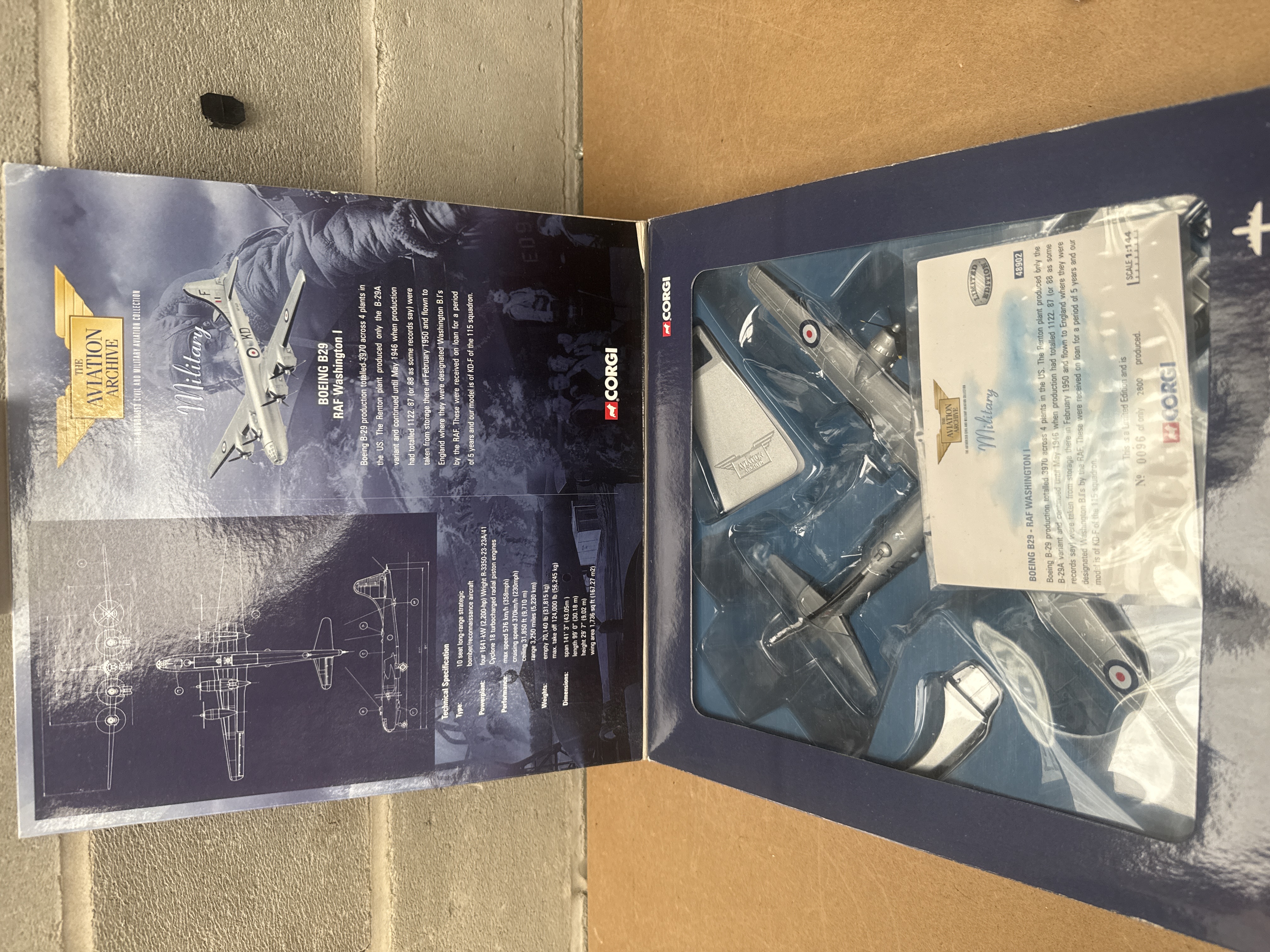 A Corgi Aviation Archive Limited Edition die-cast model aircraft, specifically a Boeing B29 RAF Washington I, model number 48902. This 1:144 scale model is part of ‘The Aviation Archive’ series, identified as ‘Military’ and marketed as ‘DETAILED DIE CAST SCALE MODELS FOR THE ADULT COLLECTOR’. The internal packaging confirms it as edition ‘No. 0090 of 4000 produced’. The model is presented in multiple components, including the main fuselage and wings, securely housed within a clear plastic insert. Internal flaps within the packaging provide detailed ‘Technical Specifications’ for the actual aircraft and additional contextual information.