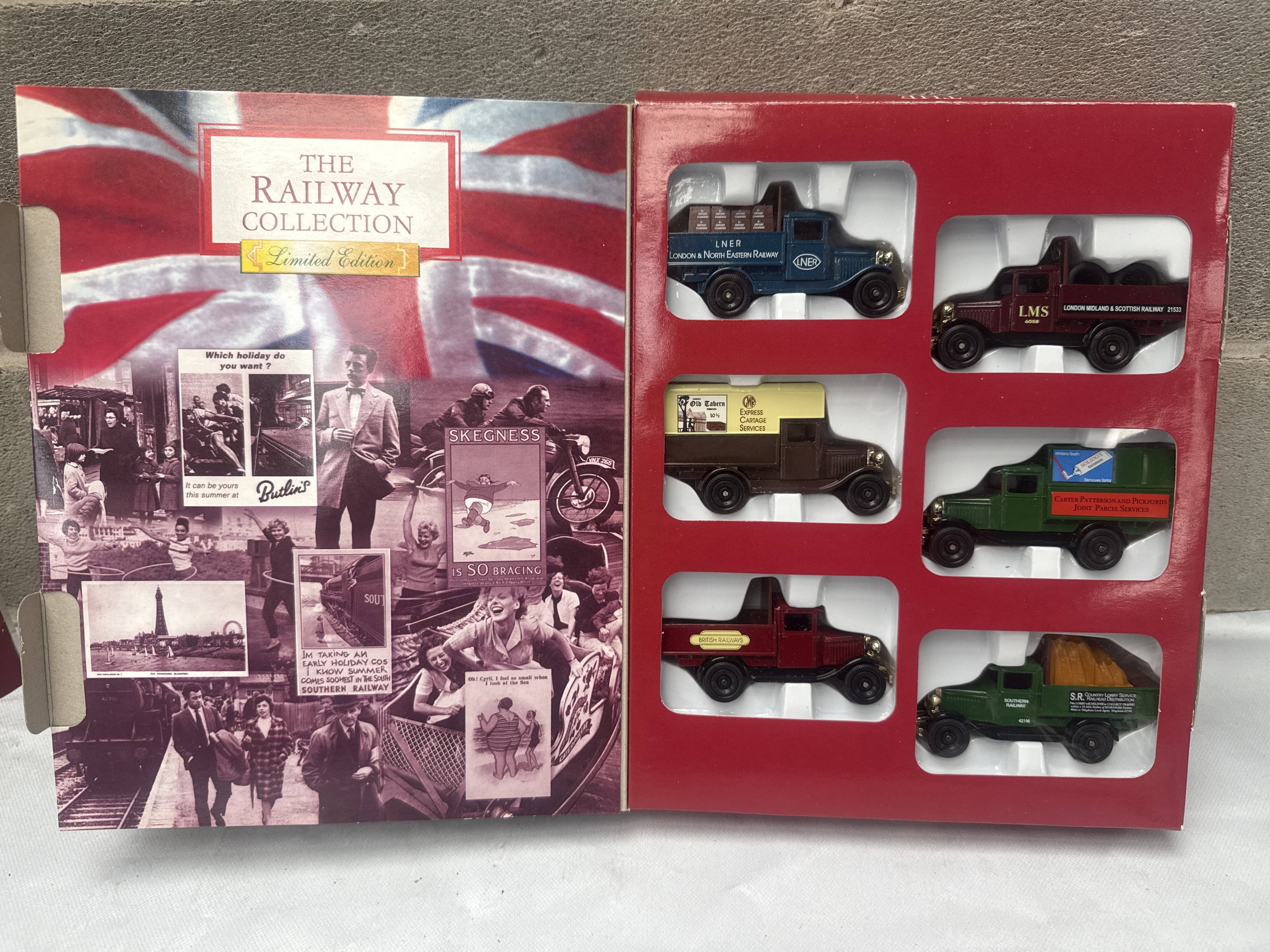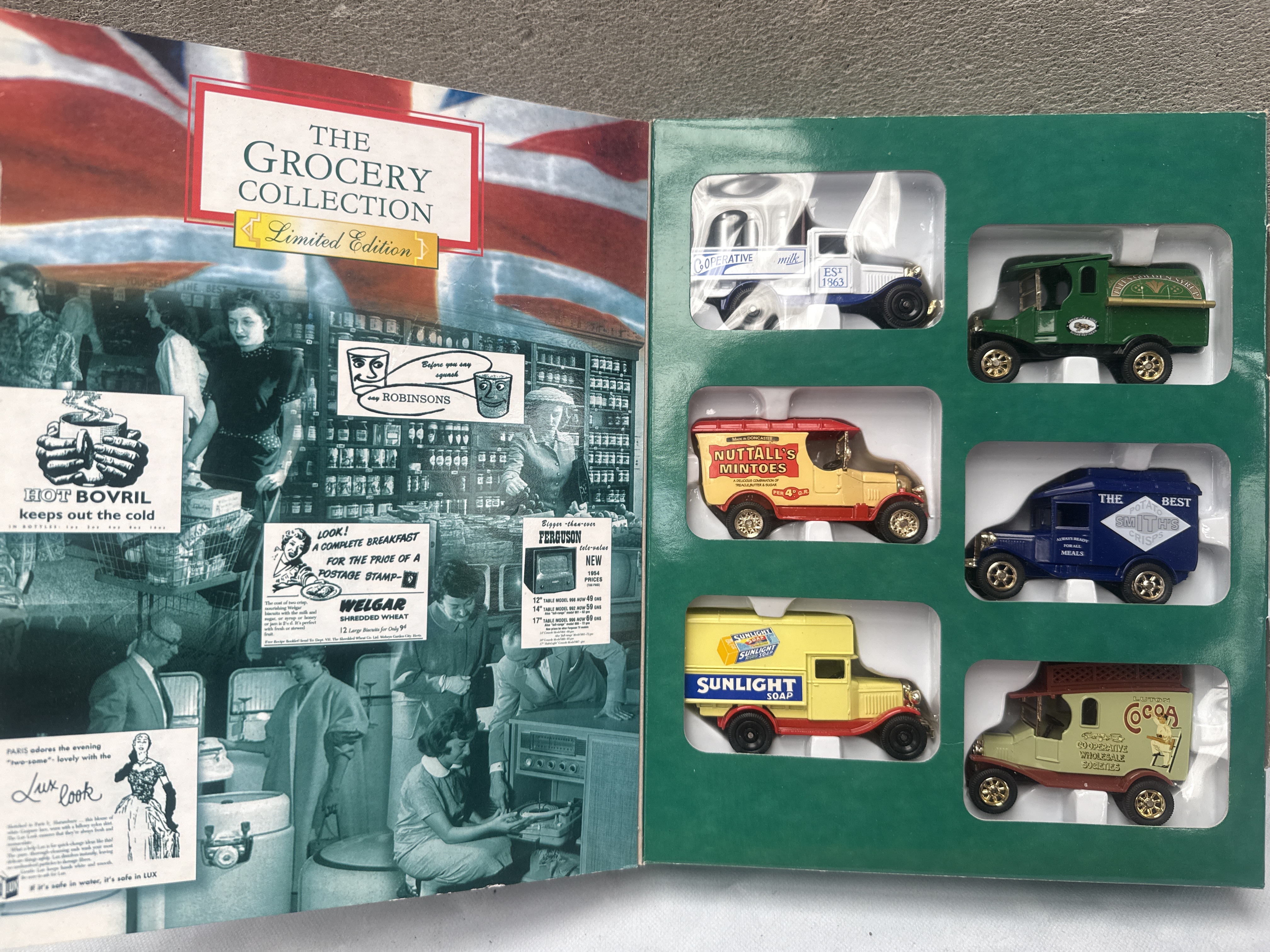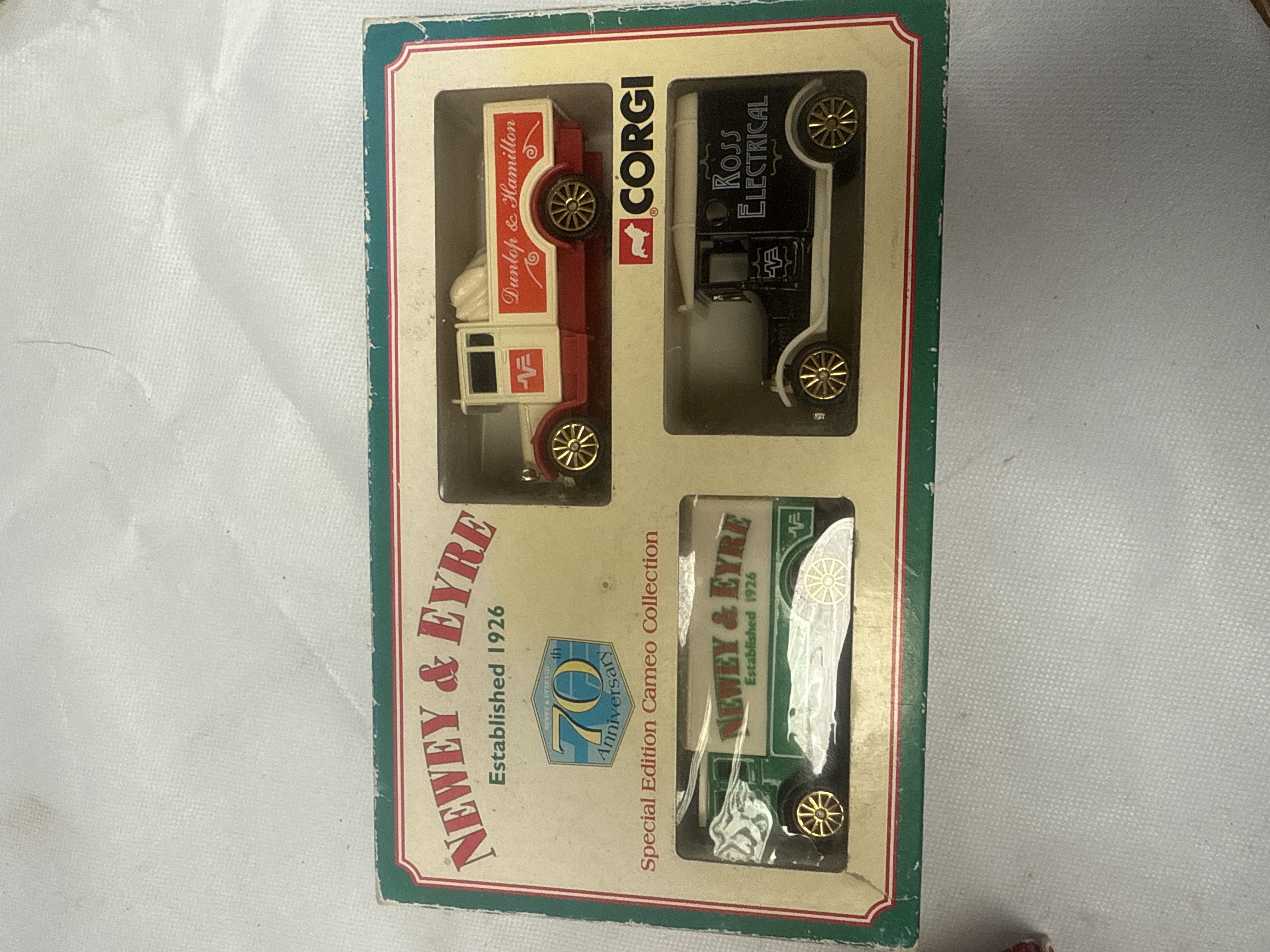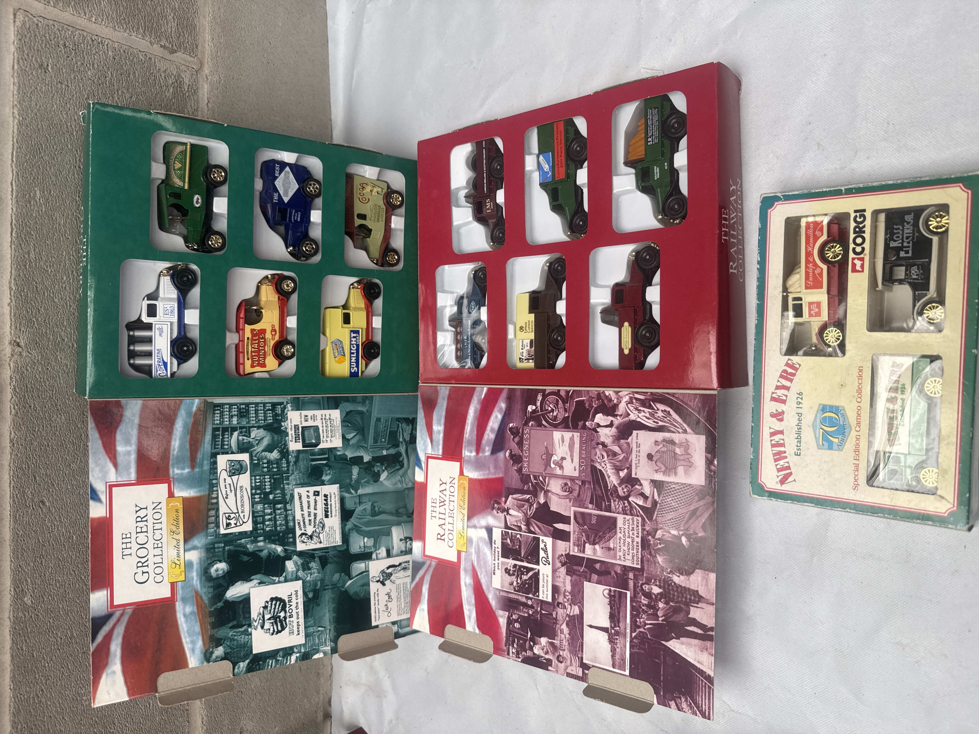 A collection of three Corgi die-cast miniature model vehicle sets. The first is a “NEWEY & EYRE Special Edition Cameo Collection” celebrating a “70th Anniversary” (established 1926), featuring three vintage-style delivery trucks branded for “Dunlop & Hamilton,” “NEWEY & EYRE,” and “Ross Electrical.” The other two sets are “Limited Edition” “book-style” collections, each containing six vintage-style commercial vehicles and featuring period-appropriate advertisements on their inner covers. “THE GROCERY COLLECTION” includes trucks branded for “Nuttall’s Mintoes,” “Sunlight Soap,” “Coca Cola,” and others, while “THE RAILWAY COLLECTION” showcases vehicles with liveries from “LNER,” “LMS,” “GWR,” “Southern Railway,” and “British Railways.” Constructed from die-cast metal and plastic, all models remain in their original cardboard and plastic packaging.