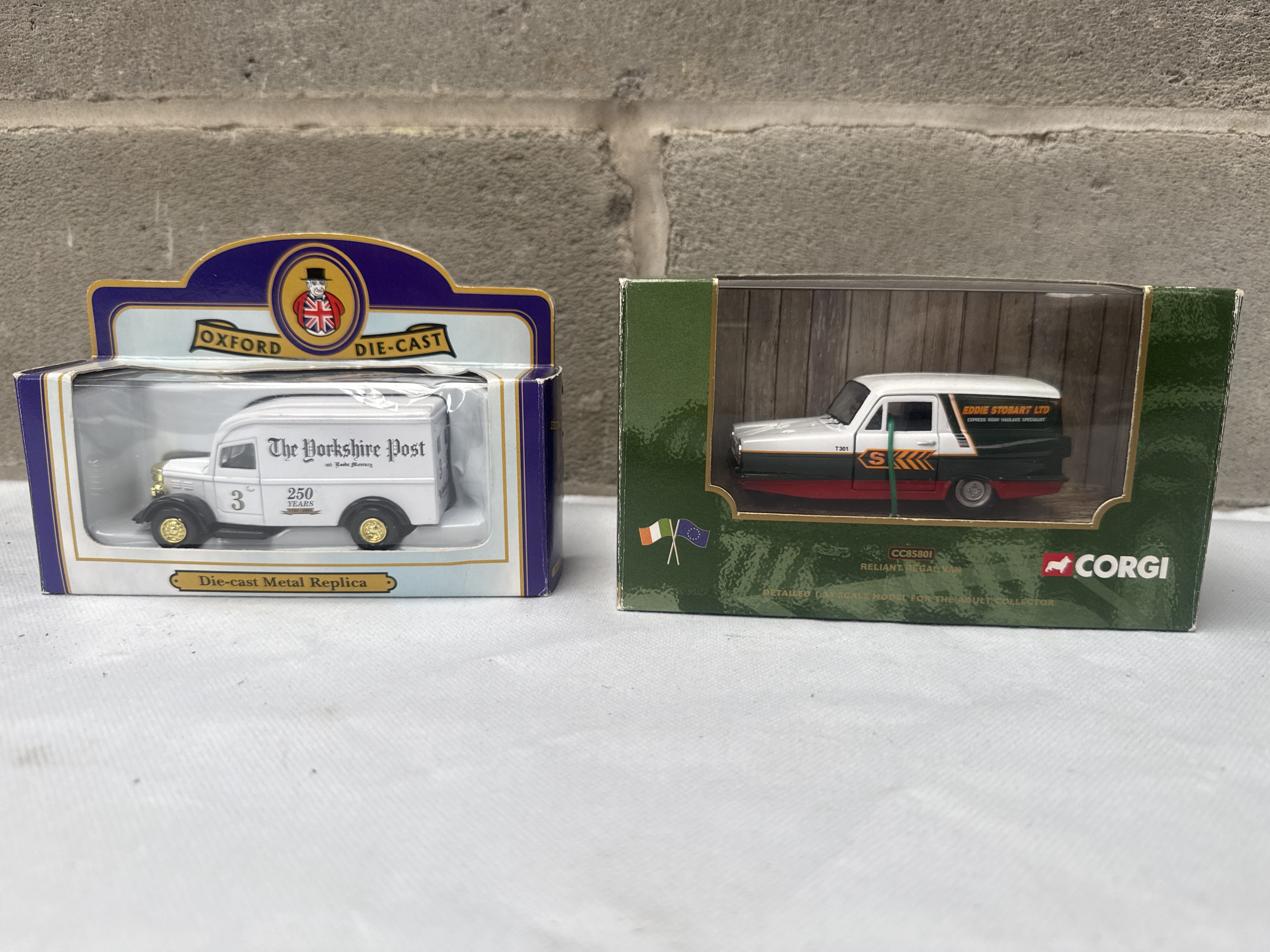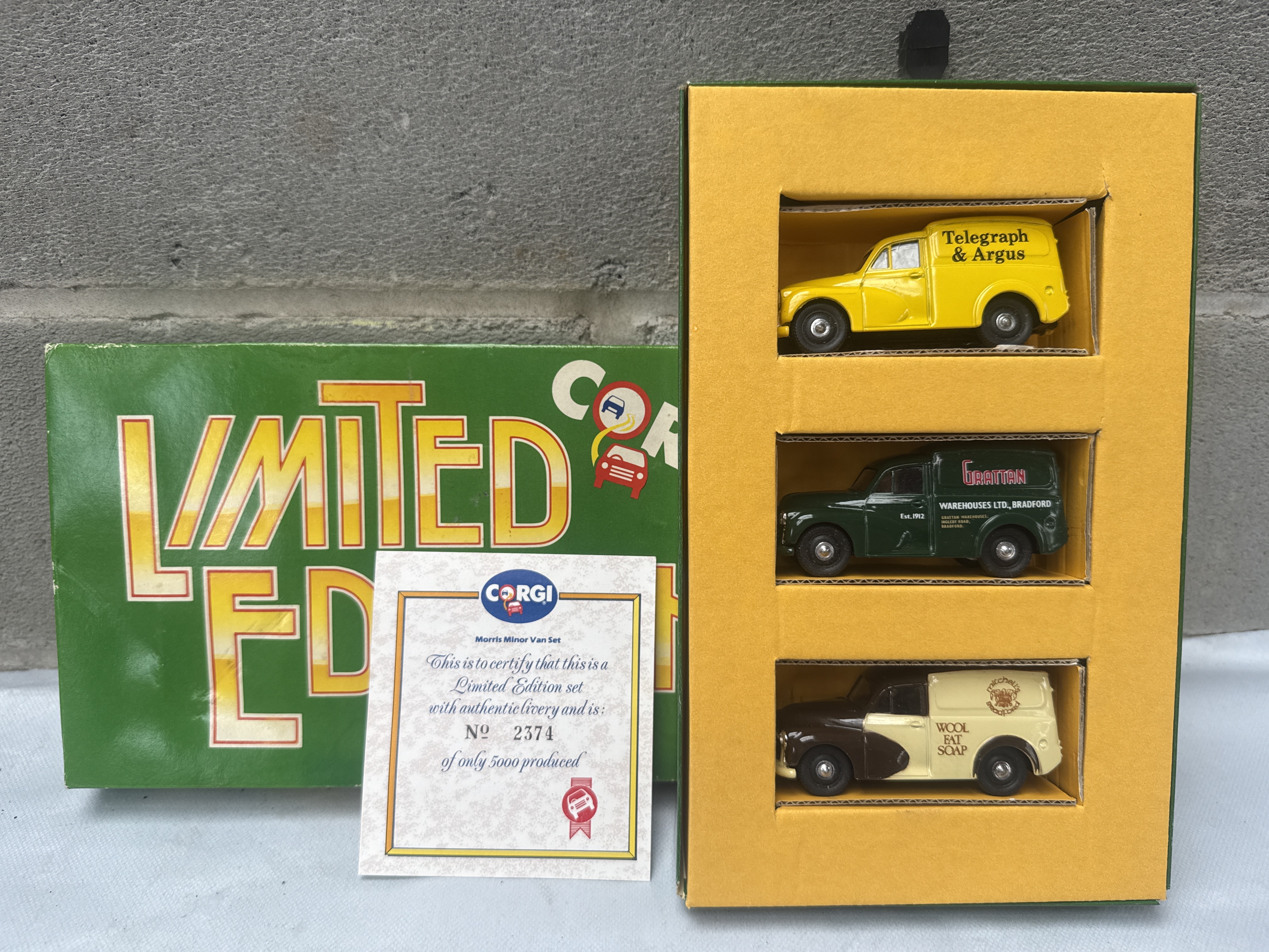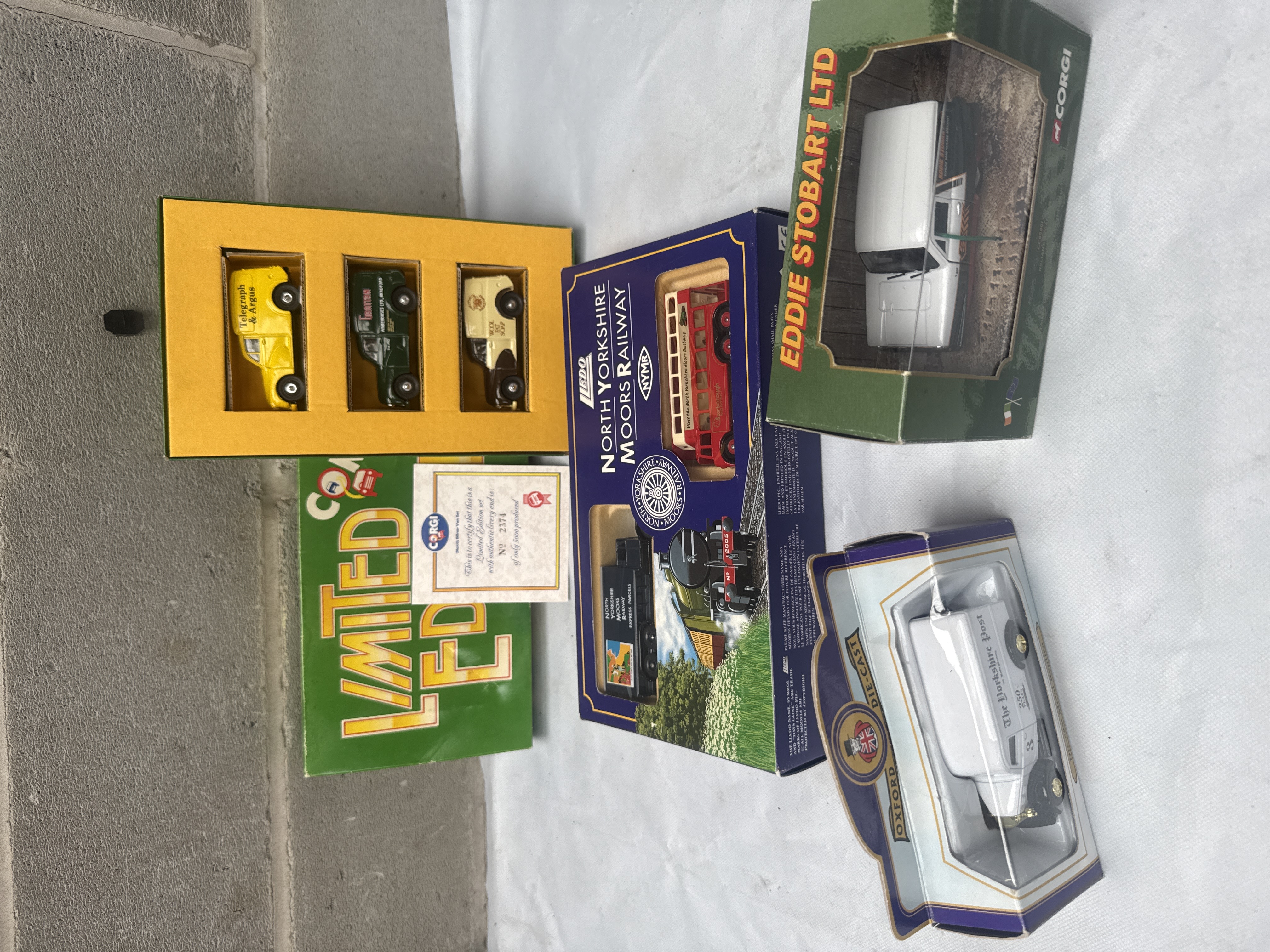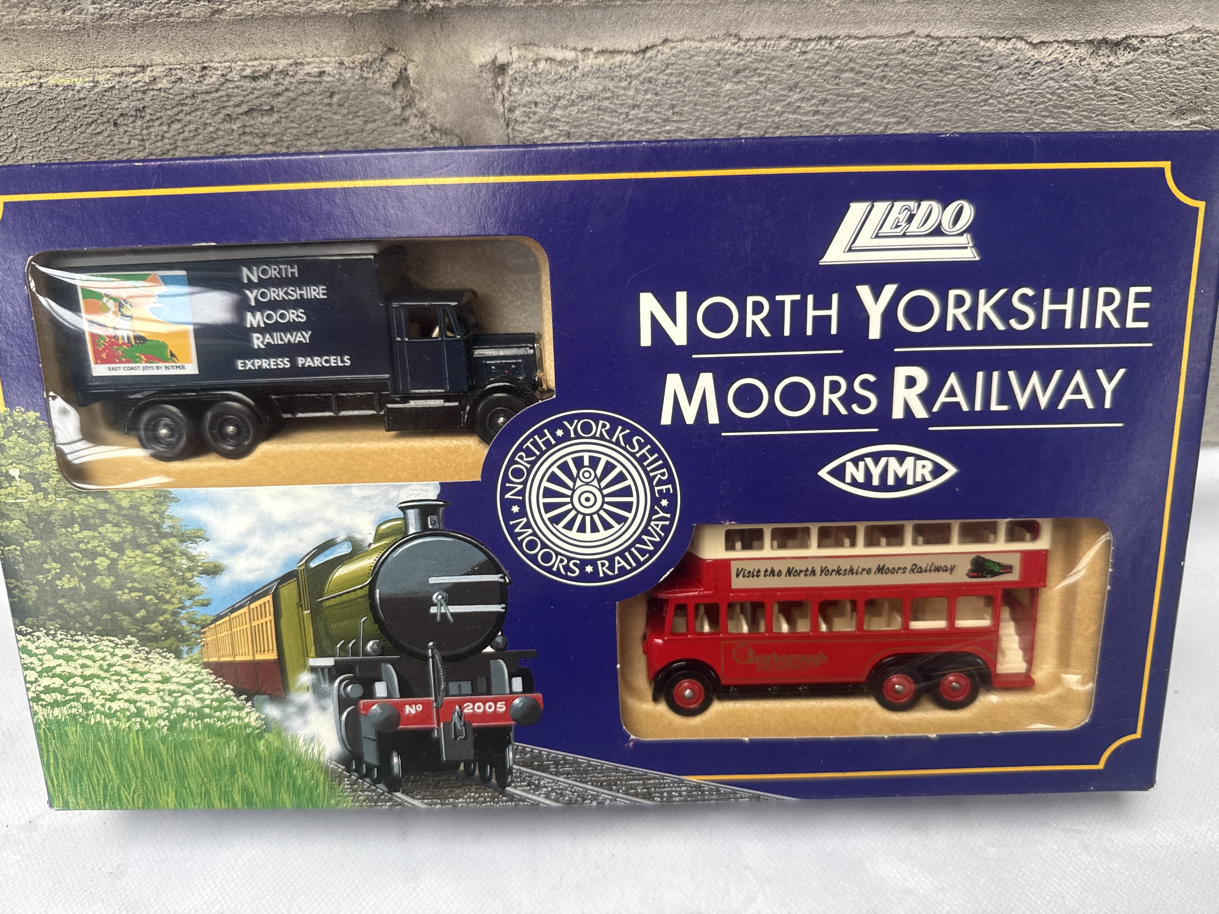 A Lledo North Yorkshire Moors Railway 3-Piece Set (L3P01), comprising a truck, a double-decker bus inscribed ‘Visit the North Yorkshire Moors Railway,’ and a steam locomotive (No. 2005). Also included is a Corgi ‘Morris Minor Van Set,’ numbered 2374 of 5000 produced, featuring three models for ‘Telegraph & Argus,’ ‘Gratton Wholesale Warehouse Ltd., Bradford,’ and ‘WOOL FAT SOAP,’ complete with its certificate. Further models include an Oxford Die-Cast ‘The Yorkshire Post’ van, celebrating ‘250 YEARS,’ and a Corgi ‘Reliant Robin’ model in ‘Eddie Stobart Ltd.’ livery (T391). These models, constructed from die-cast metal and plastic, generally represent British commercial and transport vehicles from the mid-20th century onwards.
