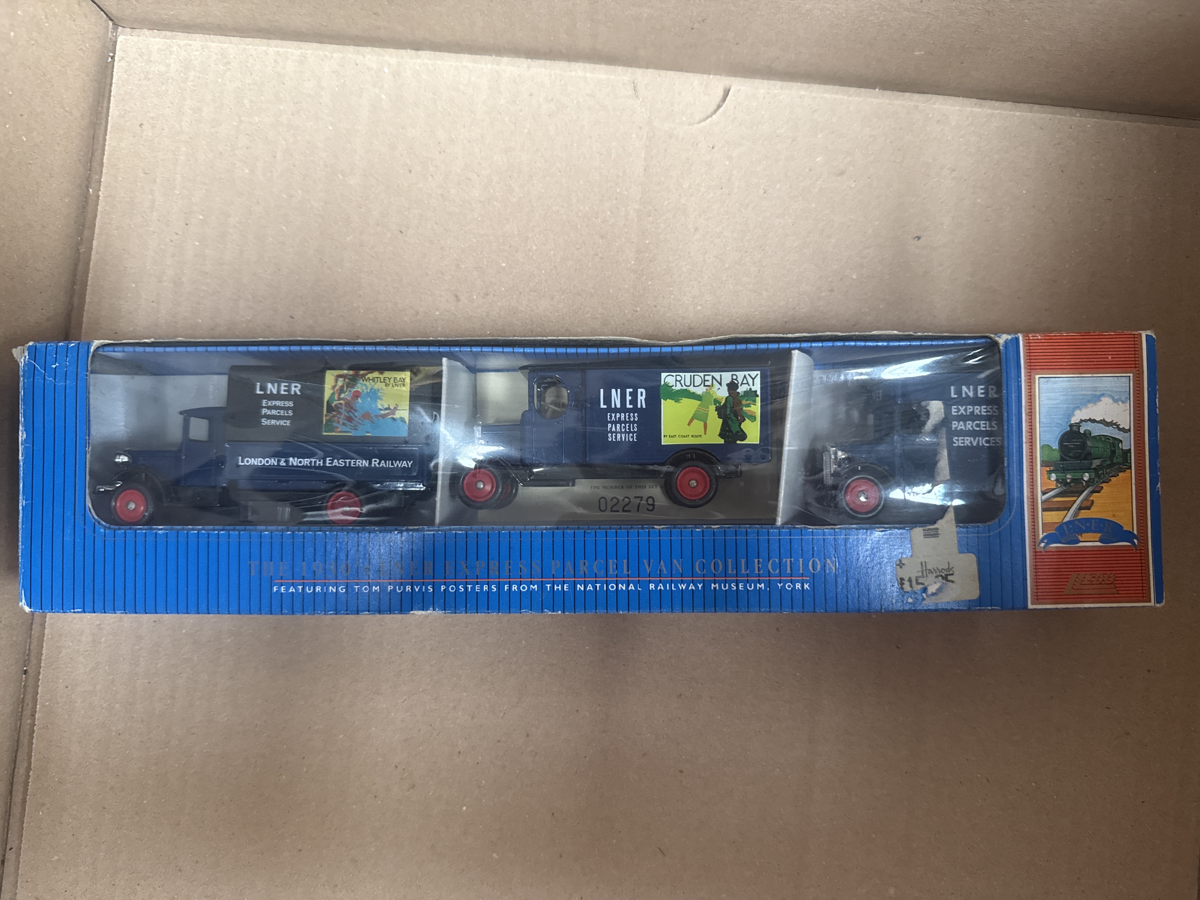 4. An “LNER EXPRESS PARCELS SERVICE MODEL VAN COLLECTION” presented in a blue box, featuring “Tom Purvis posters from the National Railway Museum York” and numbered “022/79.”
