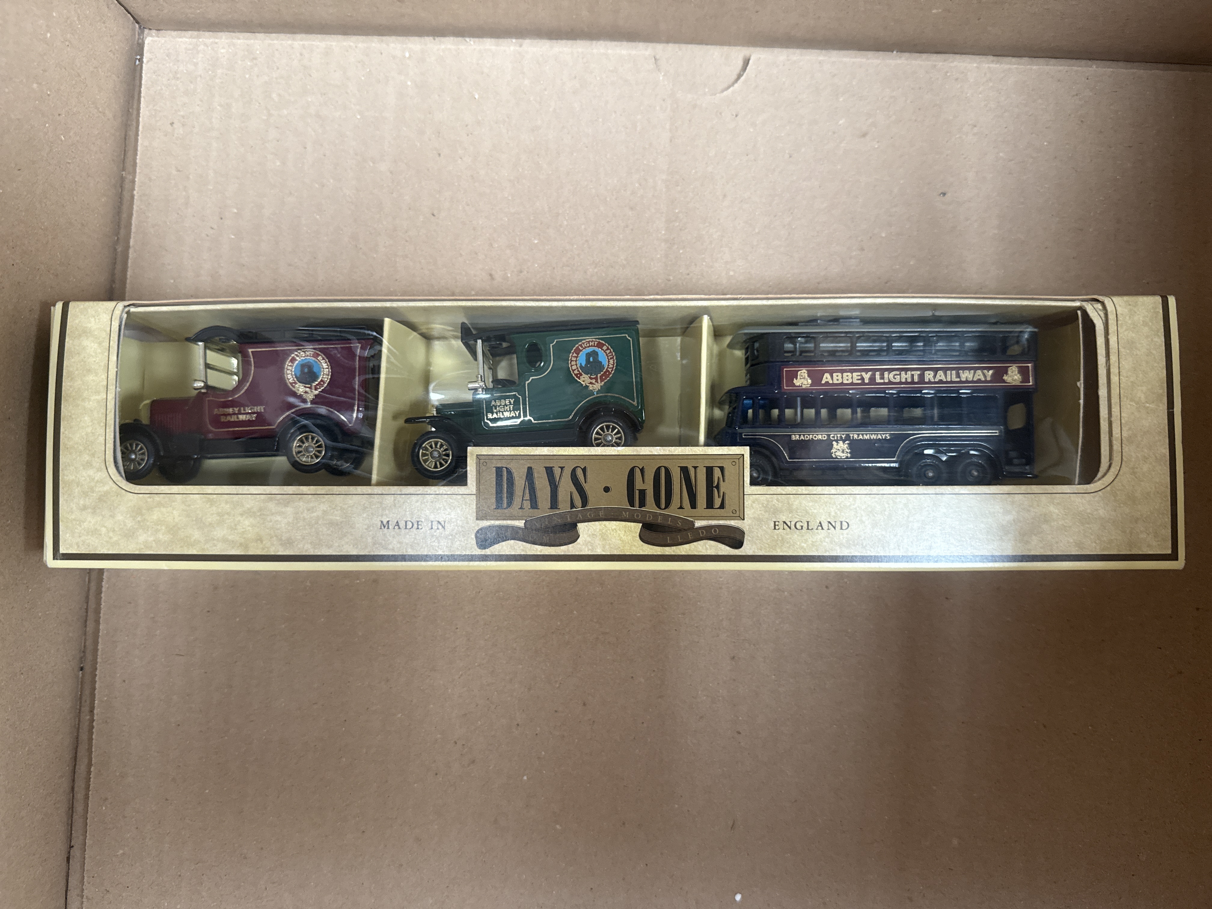 3. A “DAYS GONE” and “MADE IN ENGLAND” branded set, containing three vintage-style vehicles, one specifically marked “ABBEY LIGHT RAILWAY.”