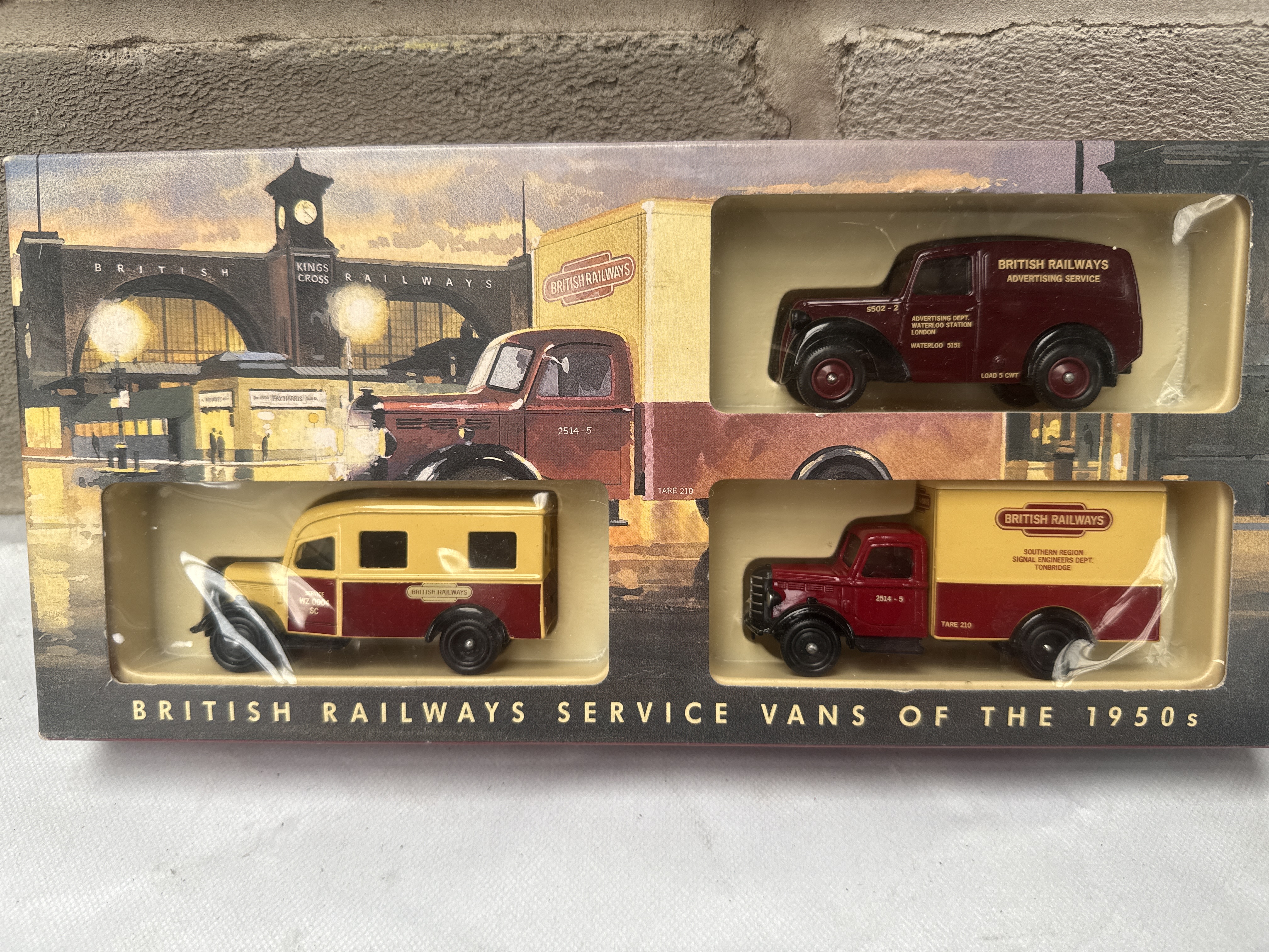 1. A set titled “BRITISH RAILWAYS SERVICE VANS OF THE 1950s,” containing four distinct British Railways branded commercial vehicles.