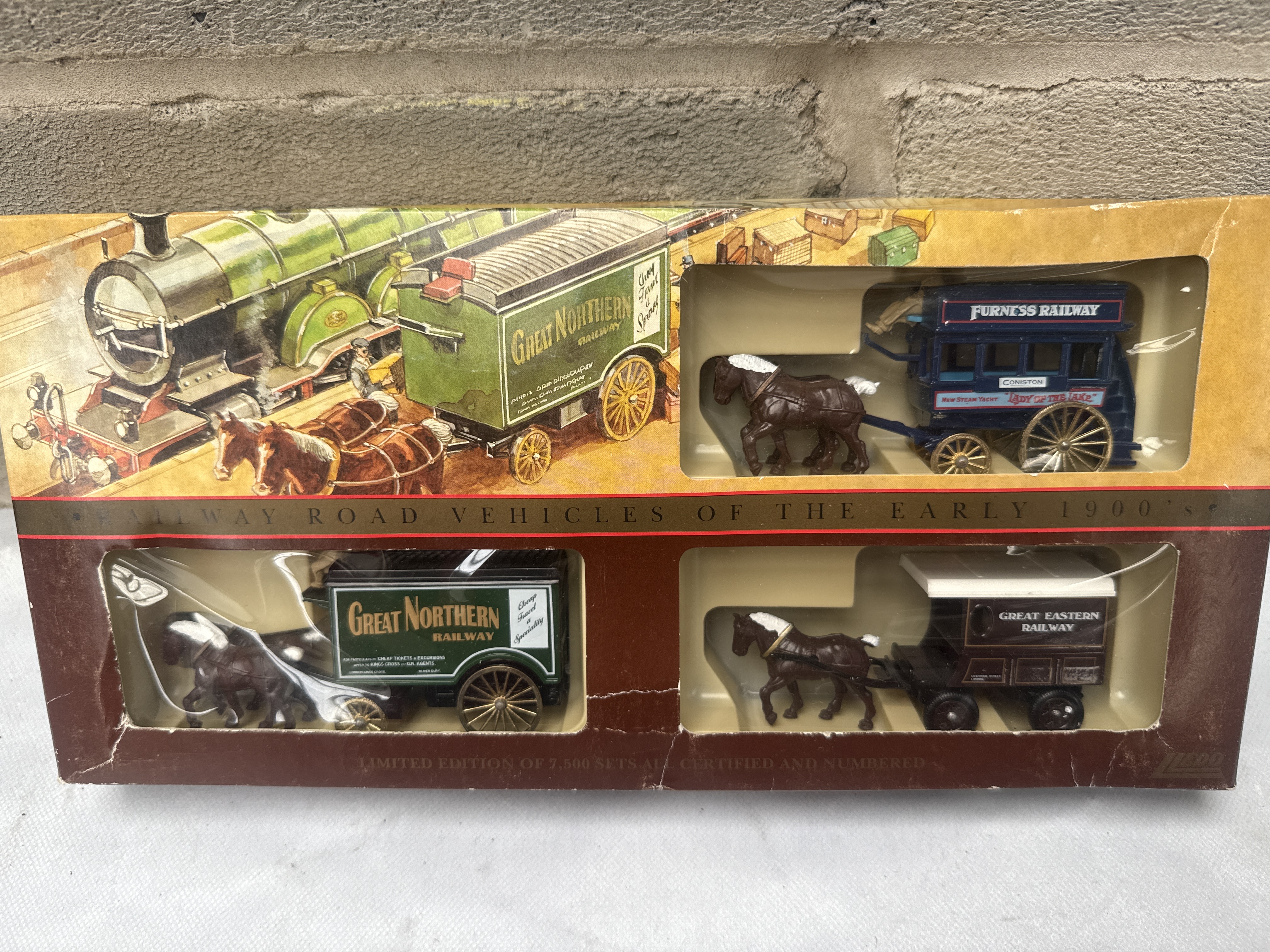 2. A “GREAT NORTHERN RAILWAY ROAD VEHICLES OF THE EARLY 1900’s” set, featuring four models including horse-drawn wagons, marked with “Great Northern Railway,” “Furness Railway,” and “Great Eastern Railway.” This set is a “LIMITED EDITION OF 7,500 SETS ALL CERTIFIED AND NUMBERED.”