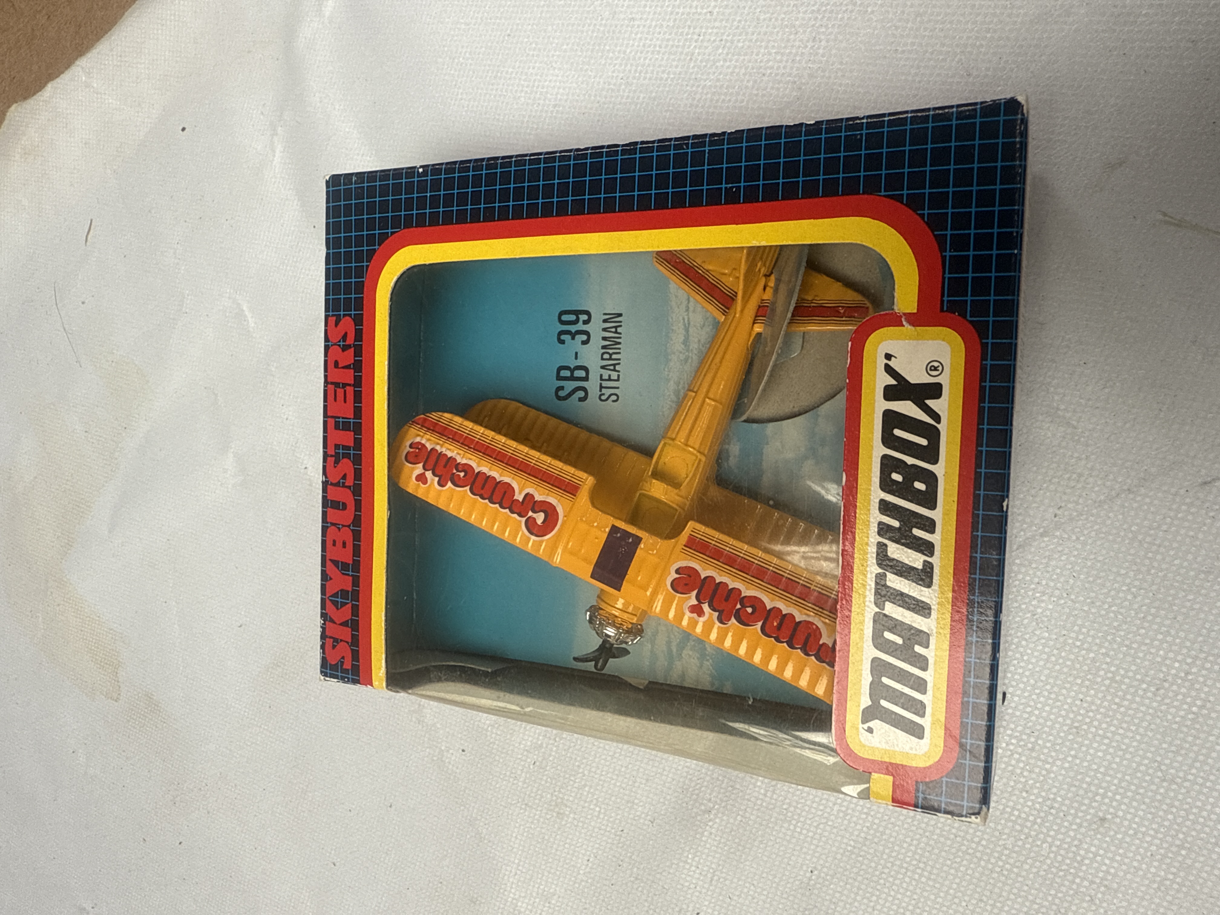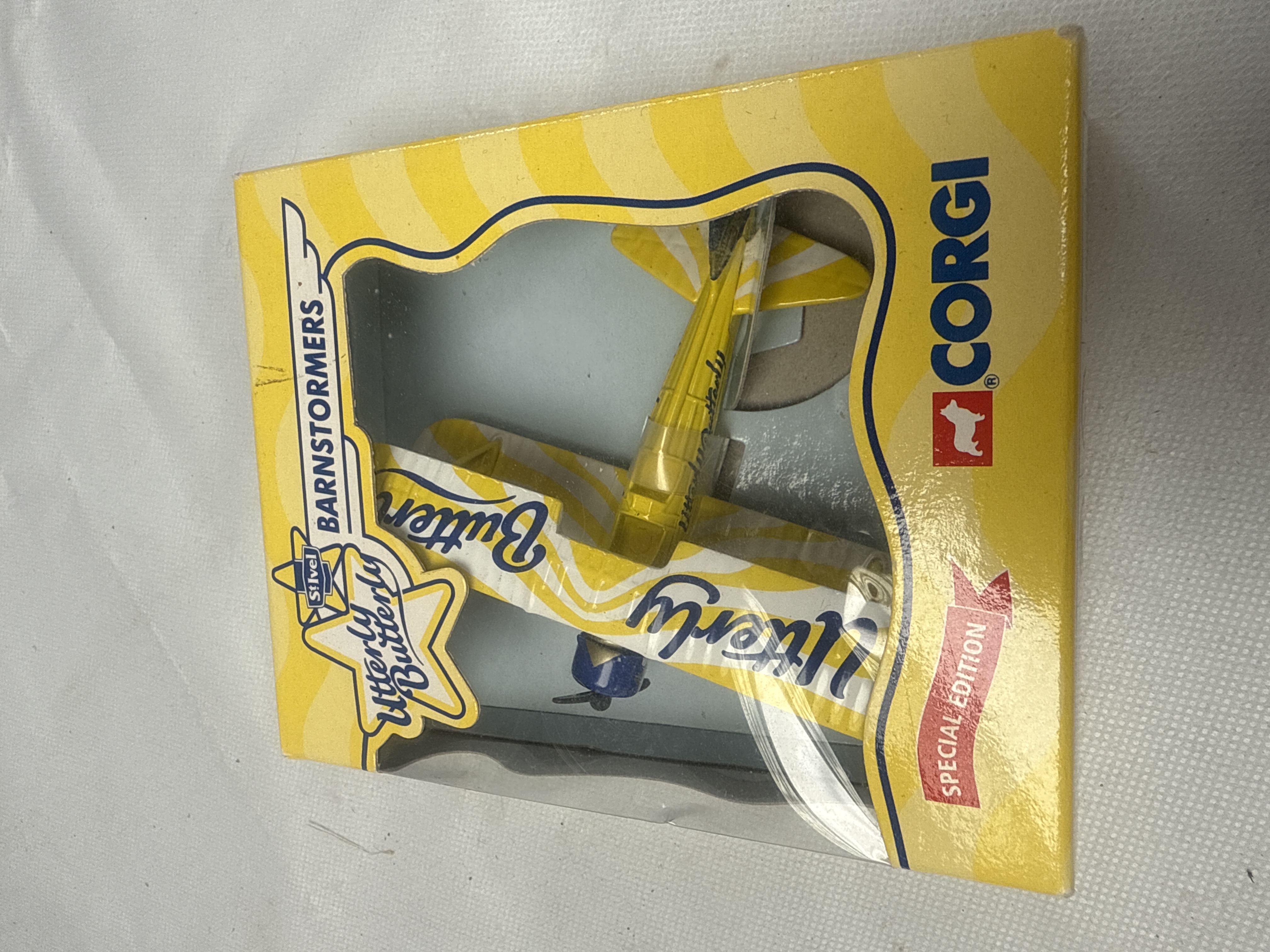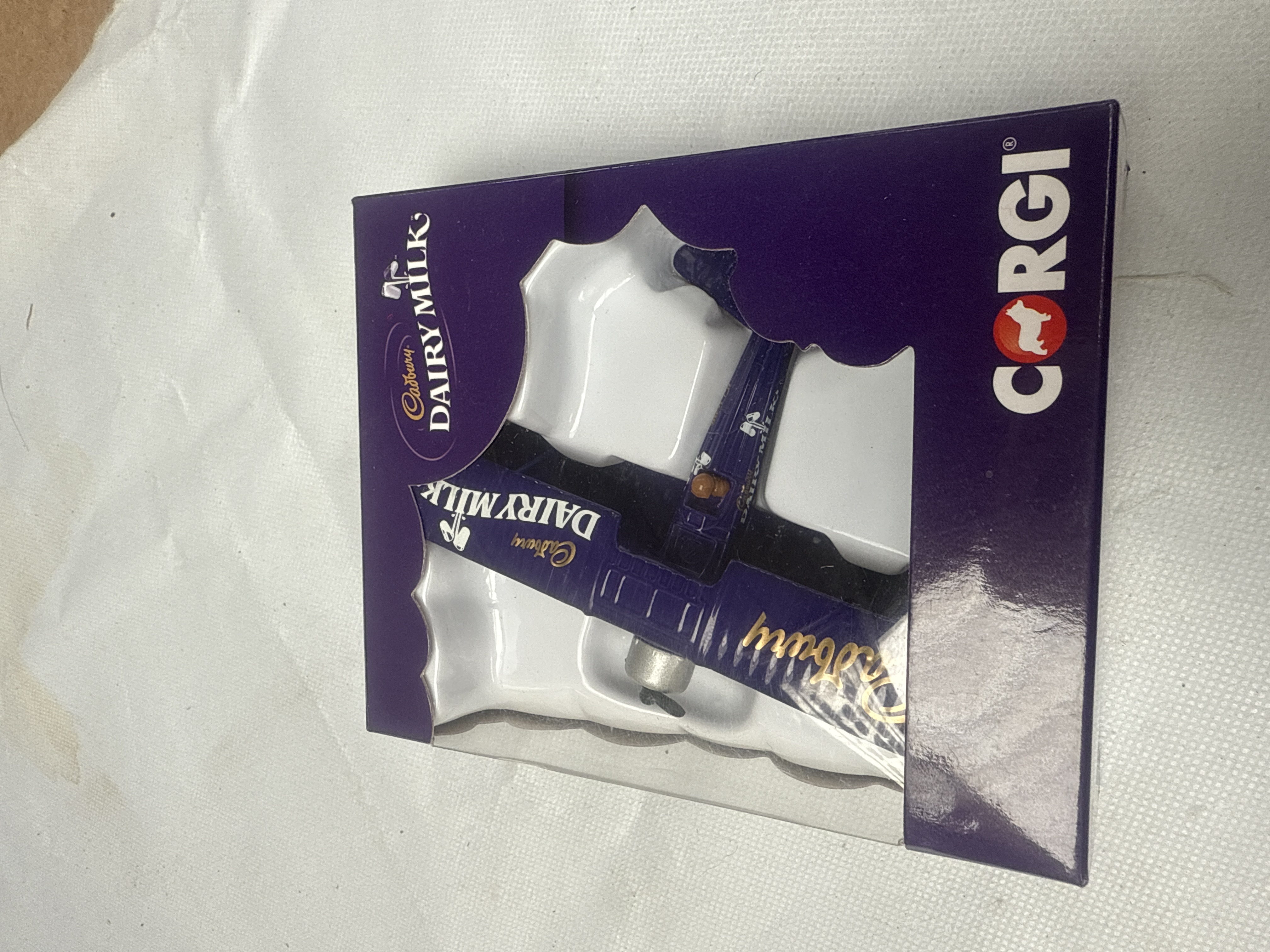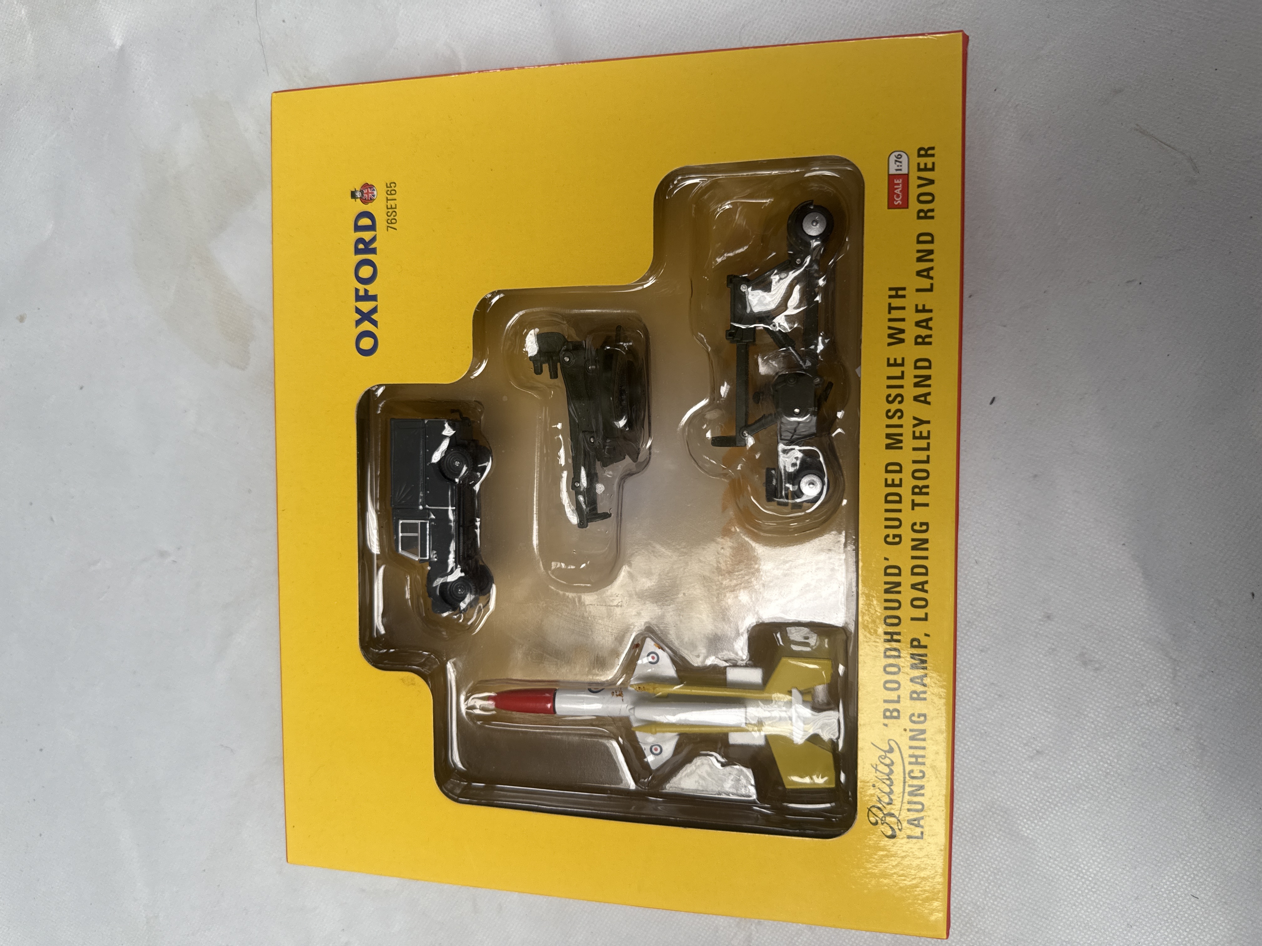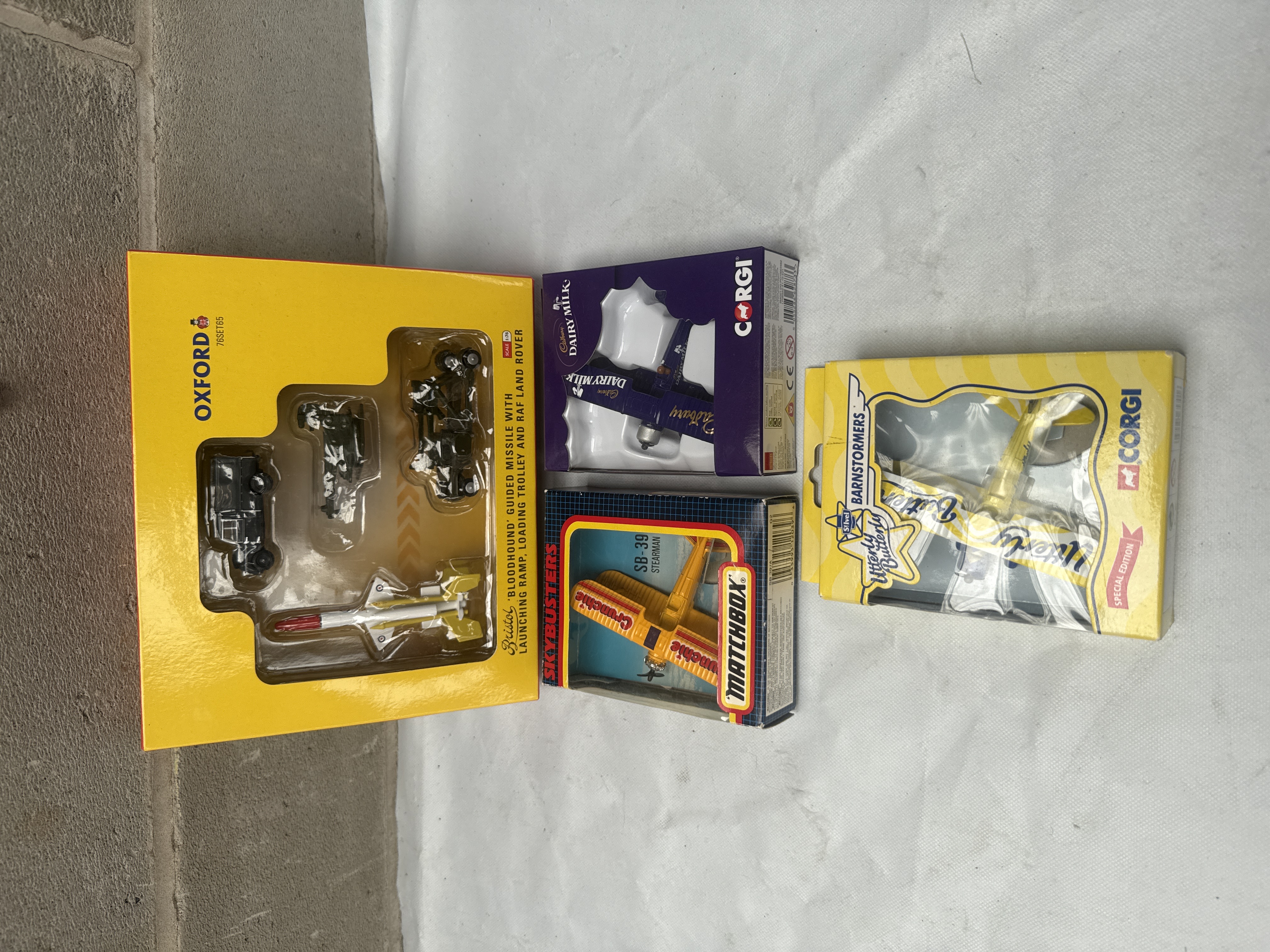 An Oxford Diecast 76SET65 1:76/OO Gauge Bloodhound Missile Set, featuring a Bristol ‘BLOODHOUND’ GUIDED MISSILE WITH LAUNCHING RAMP, LOADING TROLLEY AND RAF LAND ROVER, presented in its original yellow box with a clear plastic window. Also included are three promotional biplane models: a CORGI ‘Barnstormers’ ‘Utterly Butterly’ Special Edition biplane in a yellow box, a CORGI ‘Cadbury DAIRY MILK’ biplane in a purple box, and a MATCHBOX ‘SKYBUSTERS’ ‘SB-39 STEARMAN’ biplane with ‘Crunchie’ branding in a dark blue grid-patterned box. All four sets are new, factory-sealed, and appear to be from the late 20th or early 21st century. The models are constructed from die-cast metal and plastic.