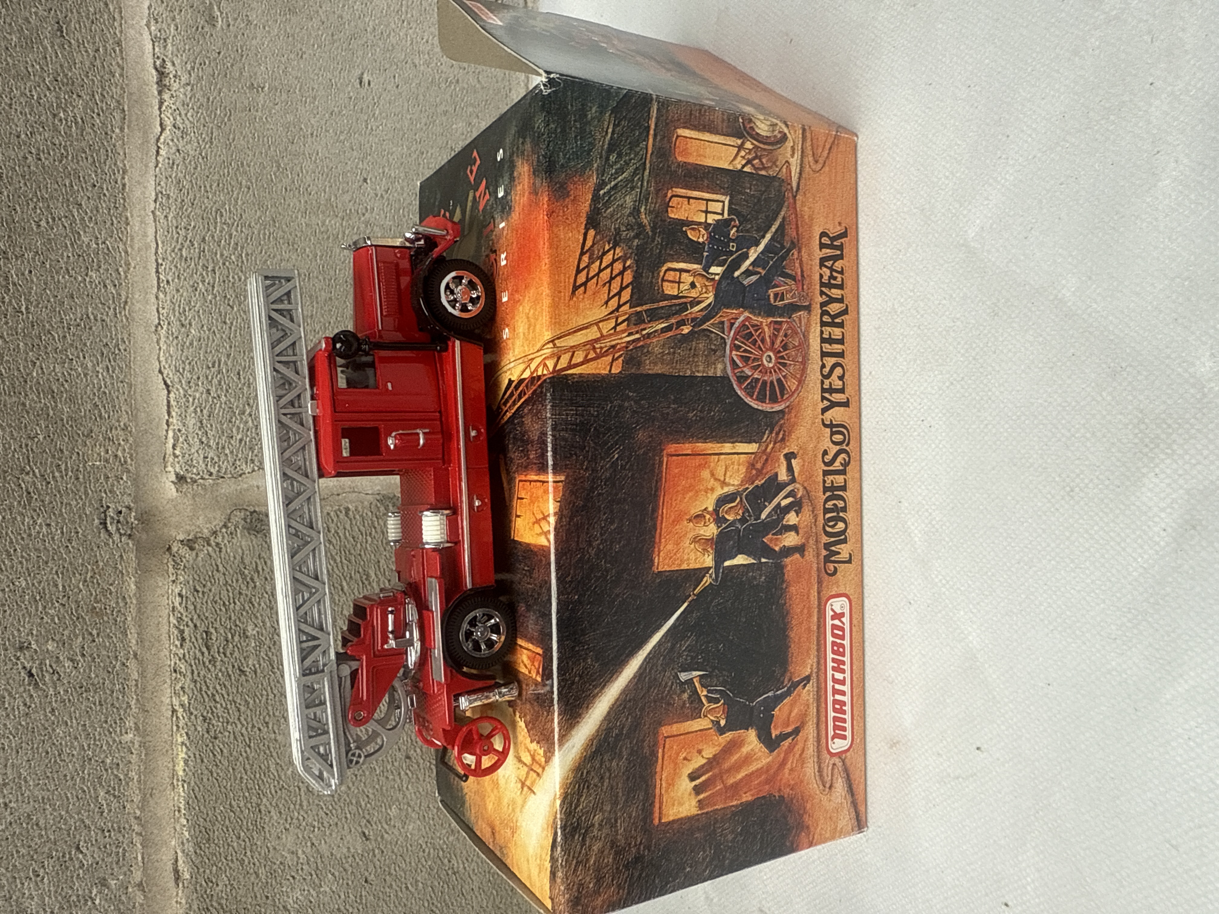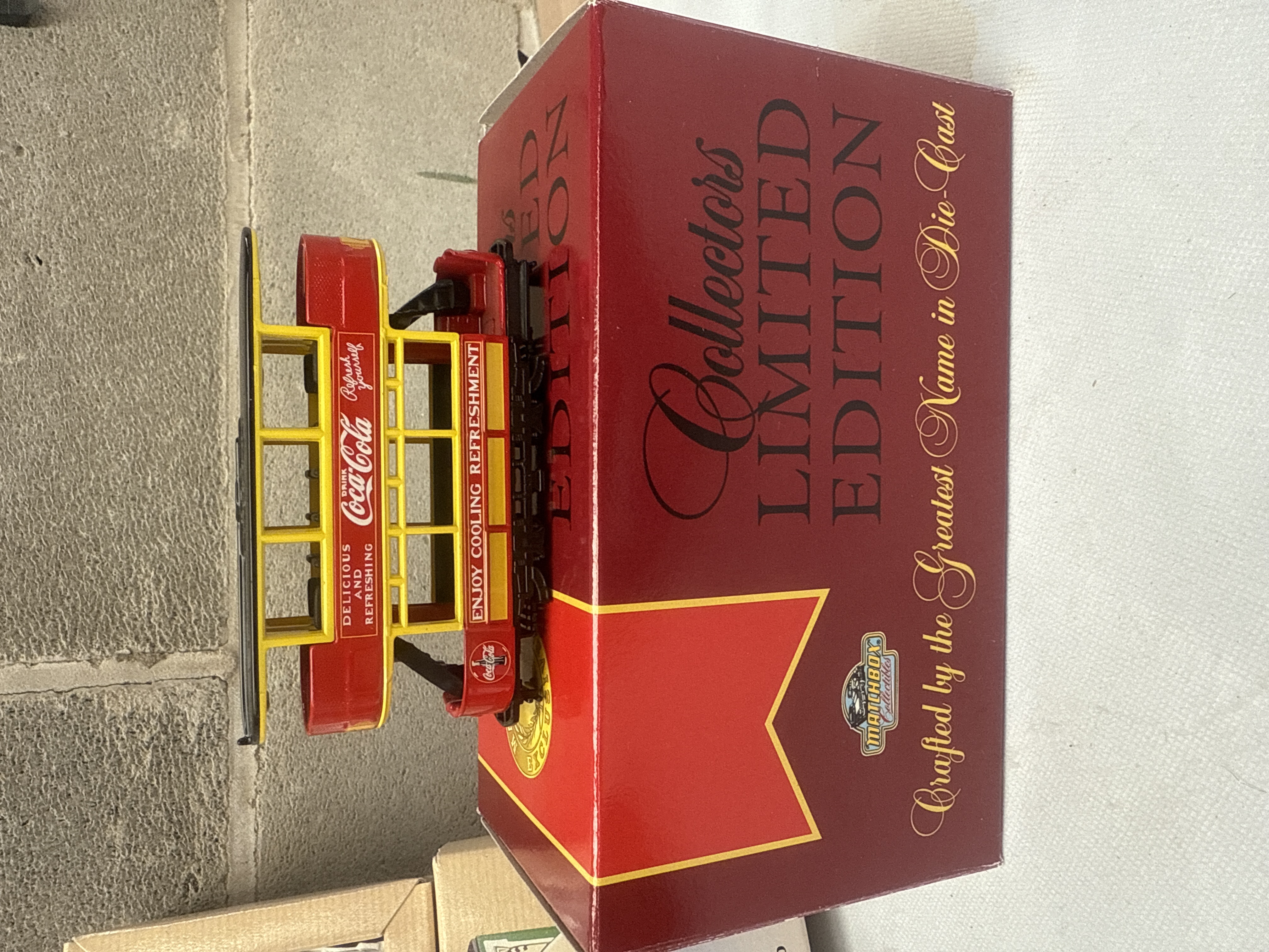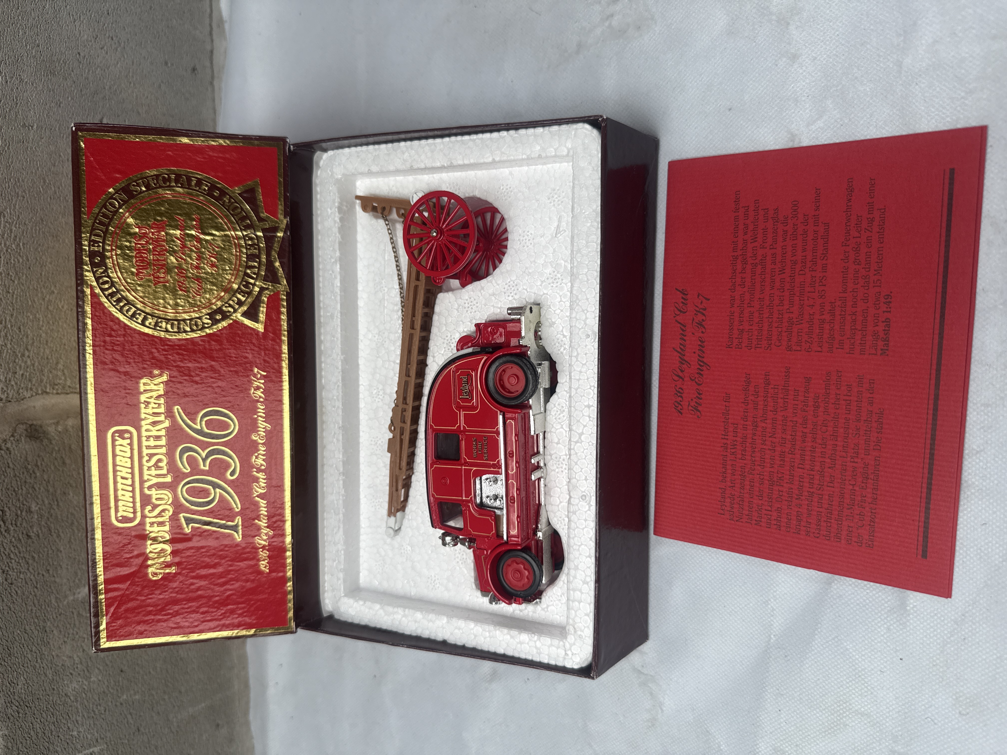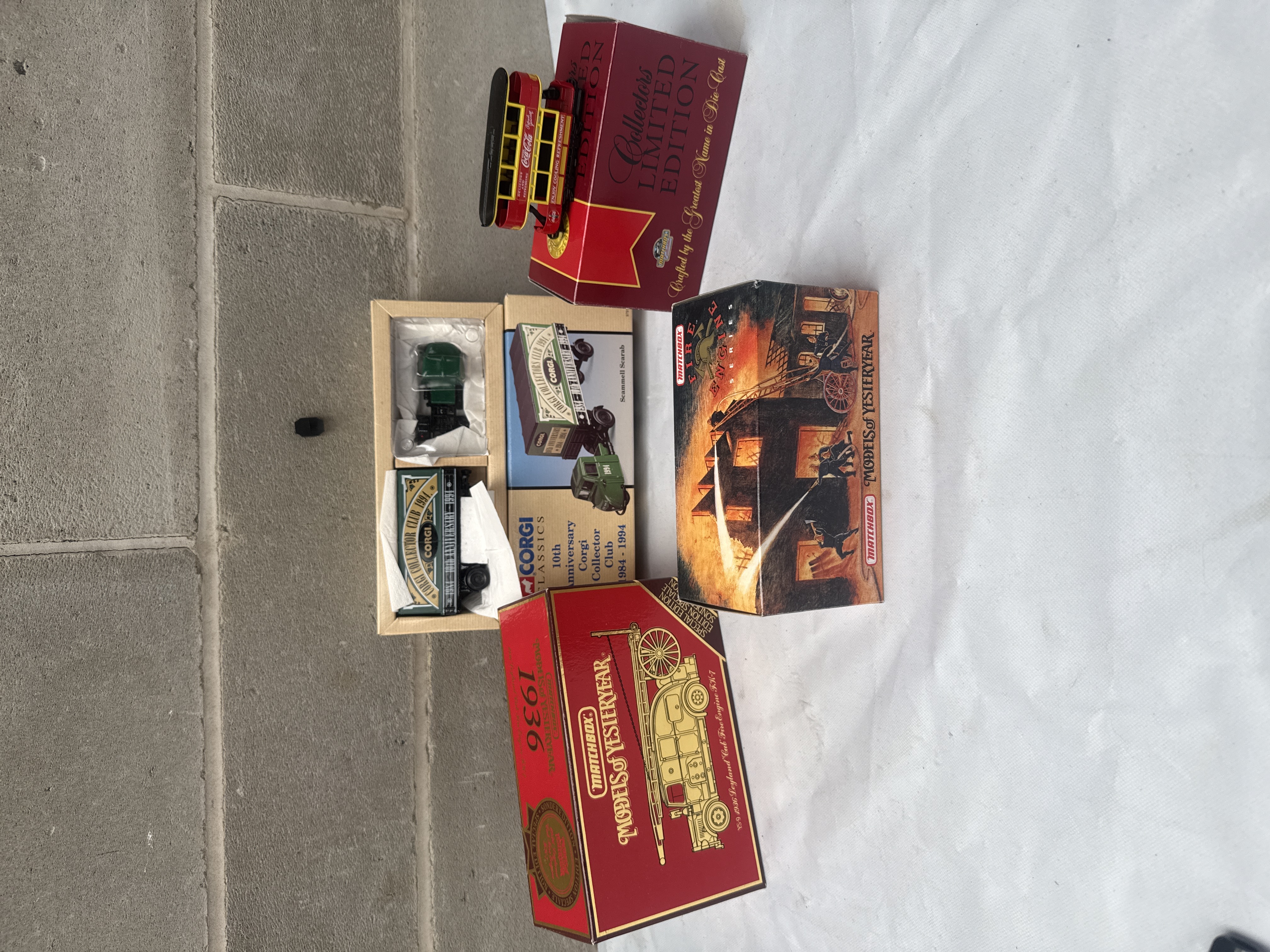 A Corgi Classics 10th Anniversary Corgi Collector Club Scammell Scarab truck and trailer set, model 97916, presented in green and dark brown livery, sealed in its original cardboard box with internal plastic packaging. Also included are two Matchbox ‘Models of Yesteryear’ series models: a 1936 Leyland Cub FK-7 fire engine housed in a red box with a gold seal, accompanied by an informational card that describes the vehicle’s “froschähnlich” (frog-like) front and its role as a factory fire brigade unit with a 33-man crew; and another red fire engine with an extendable ladder displayed on its pictorial box depicting a fire scene. Completing the collection is a ‘Collectors Limited Edition’ Matchbox Coca-Cola branded double-decker tram/bus, marked with slogans such as “Delicious and Refreshing” and “Enjoy Cooling Refreshment,” currently out of its red display box. All models are constructed from die-cast metal and plastic, displaying clear brand, series, and specific model identification text.